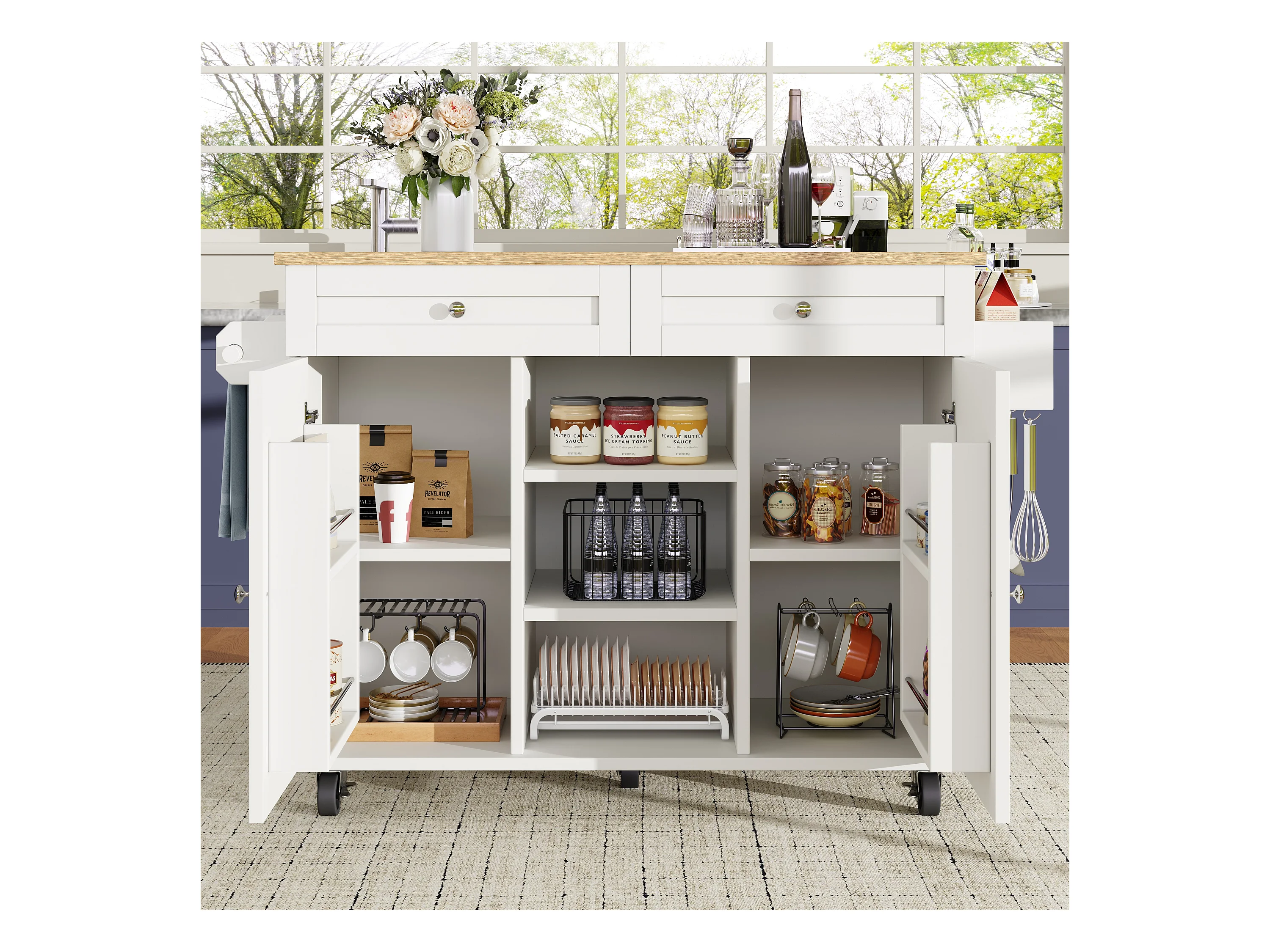 Ilot central de cuisine - chariot à roulette avec plateau extensible - 2 portes et 3 compartiments ouverts - Blanc