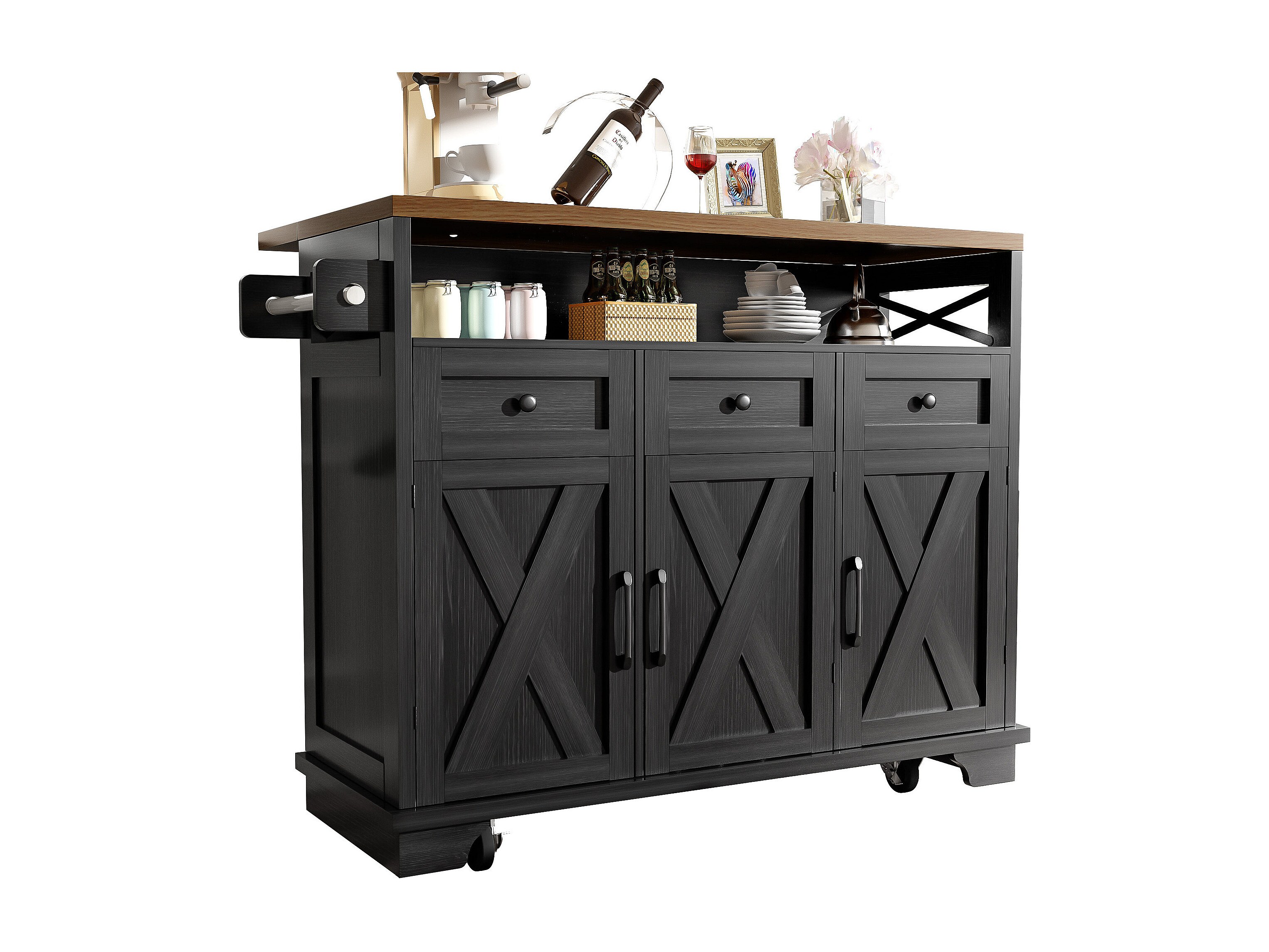 Îlot central de cuisine noir à 3 portes et 3 tiroirs - Desserte de cuisine avec porte-serviettes et rangement ouvert - plateau pliable