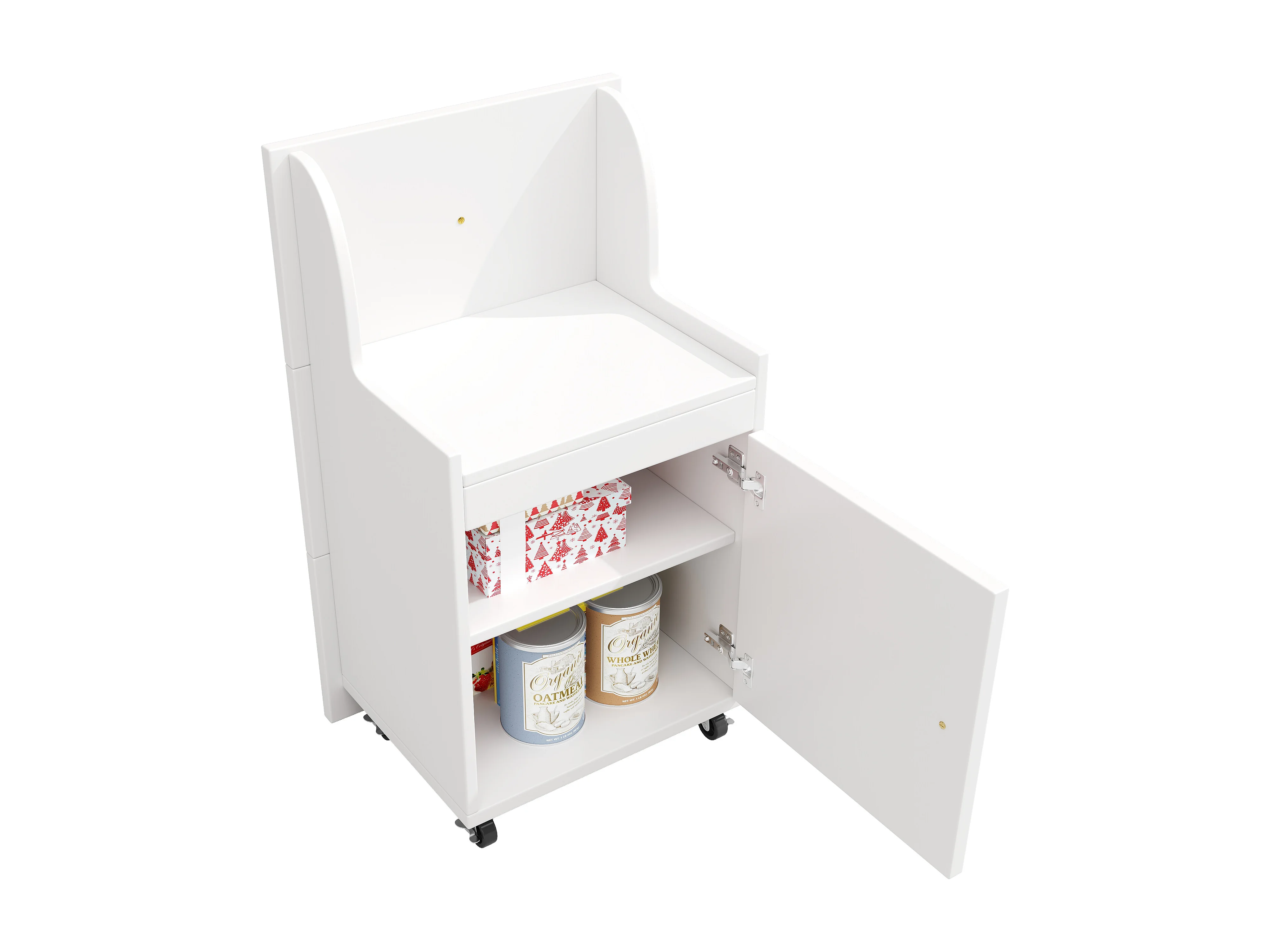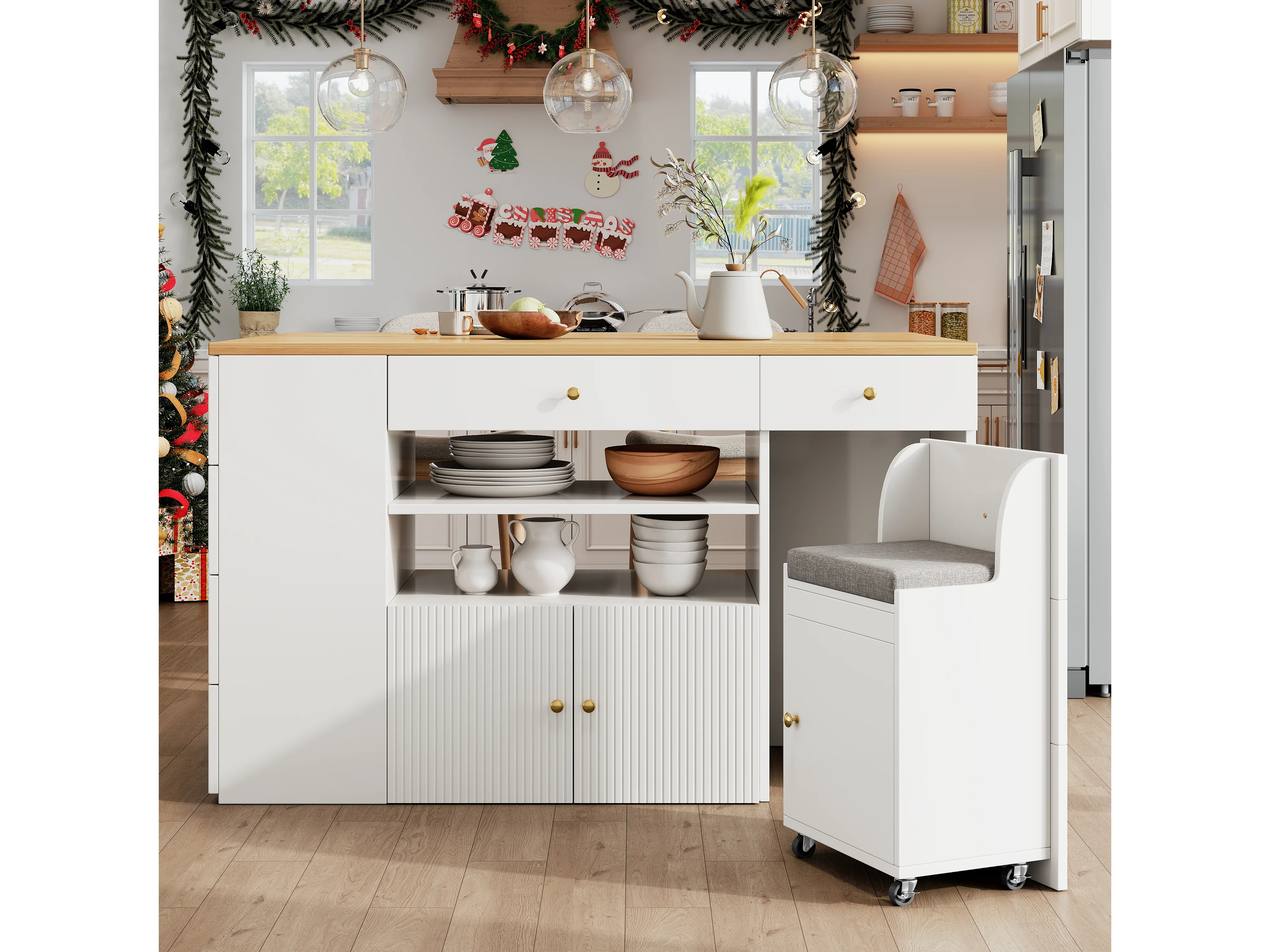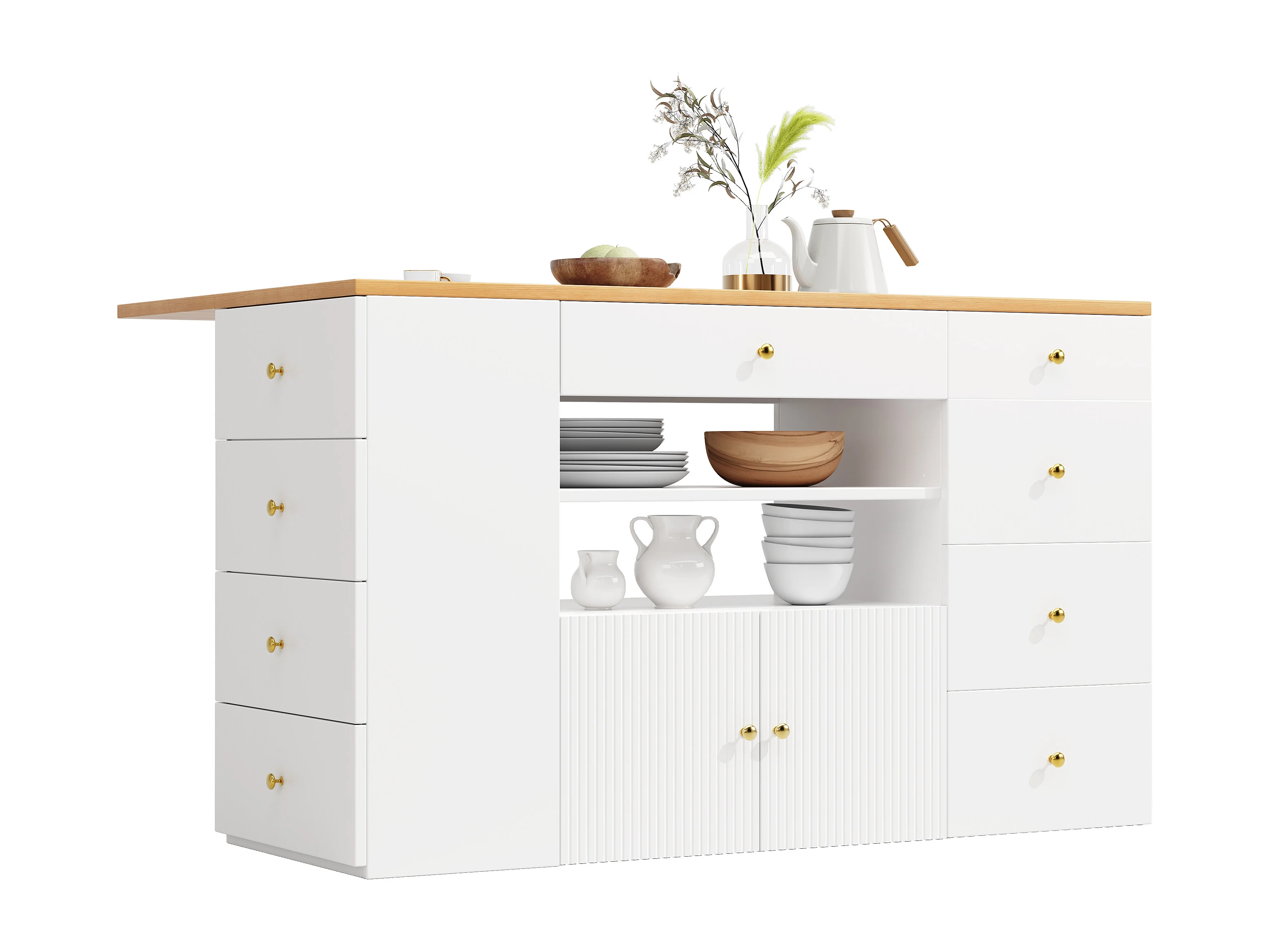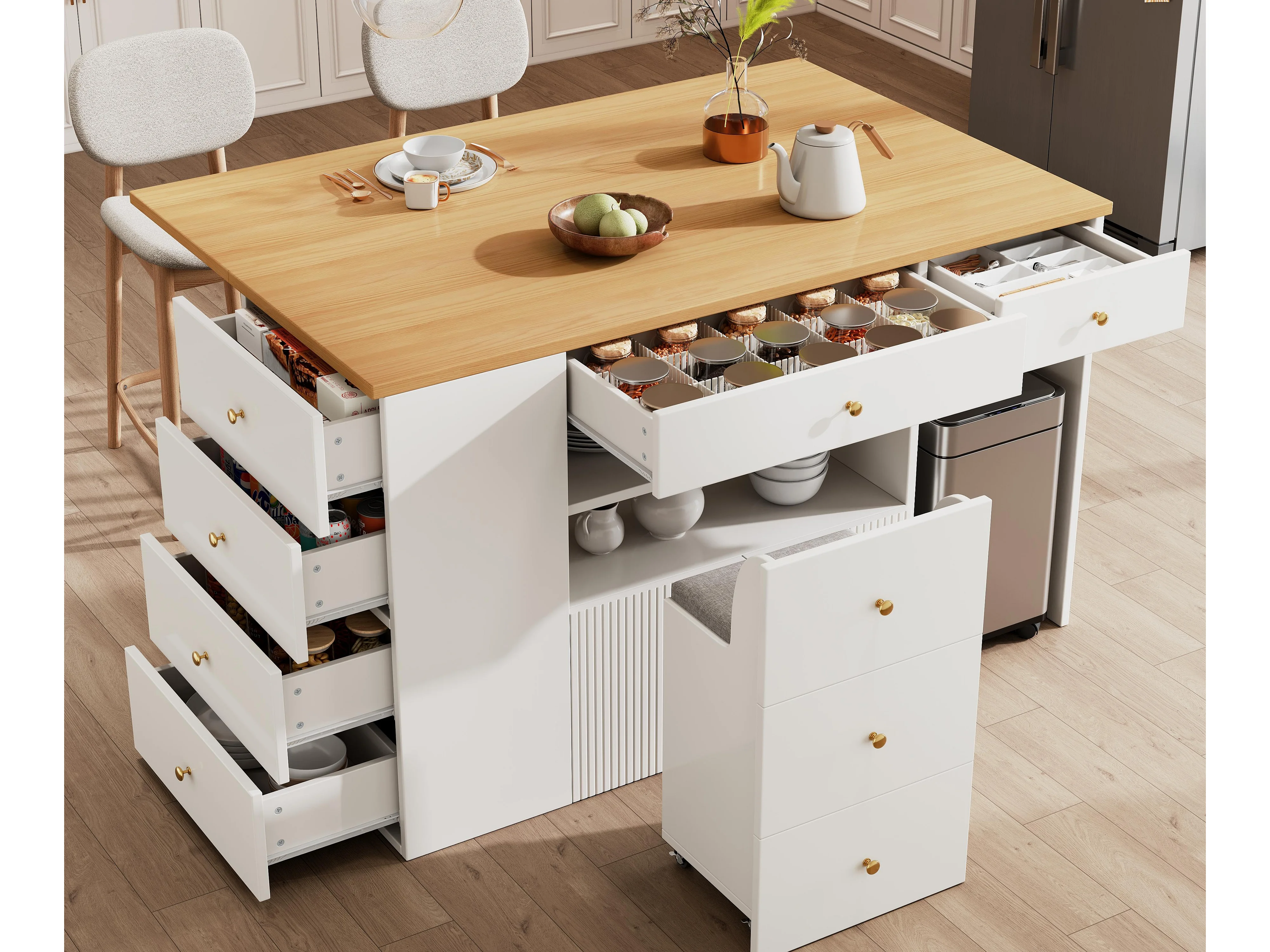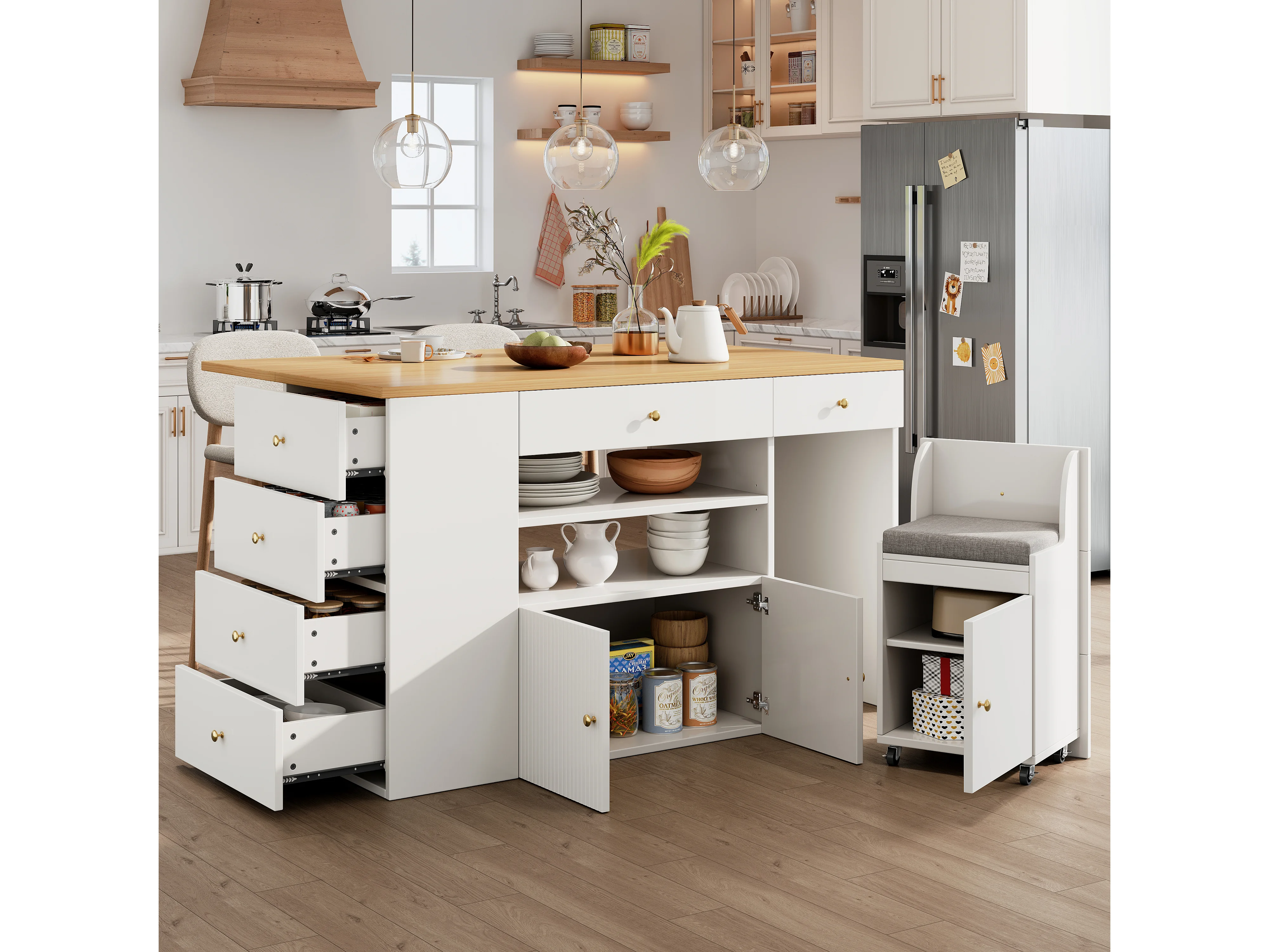 Ilot central de cuisine - Plateau extensible - 140x70x89cm - 3 portes et 6 tiroirs - avec tabourets - MDF - Blanc