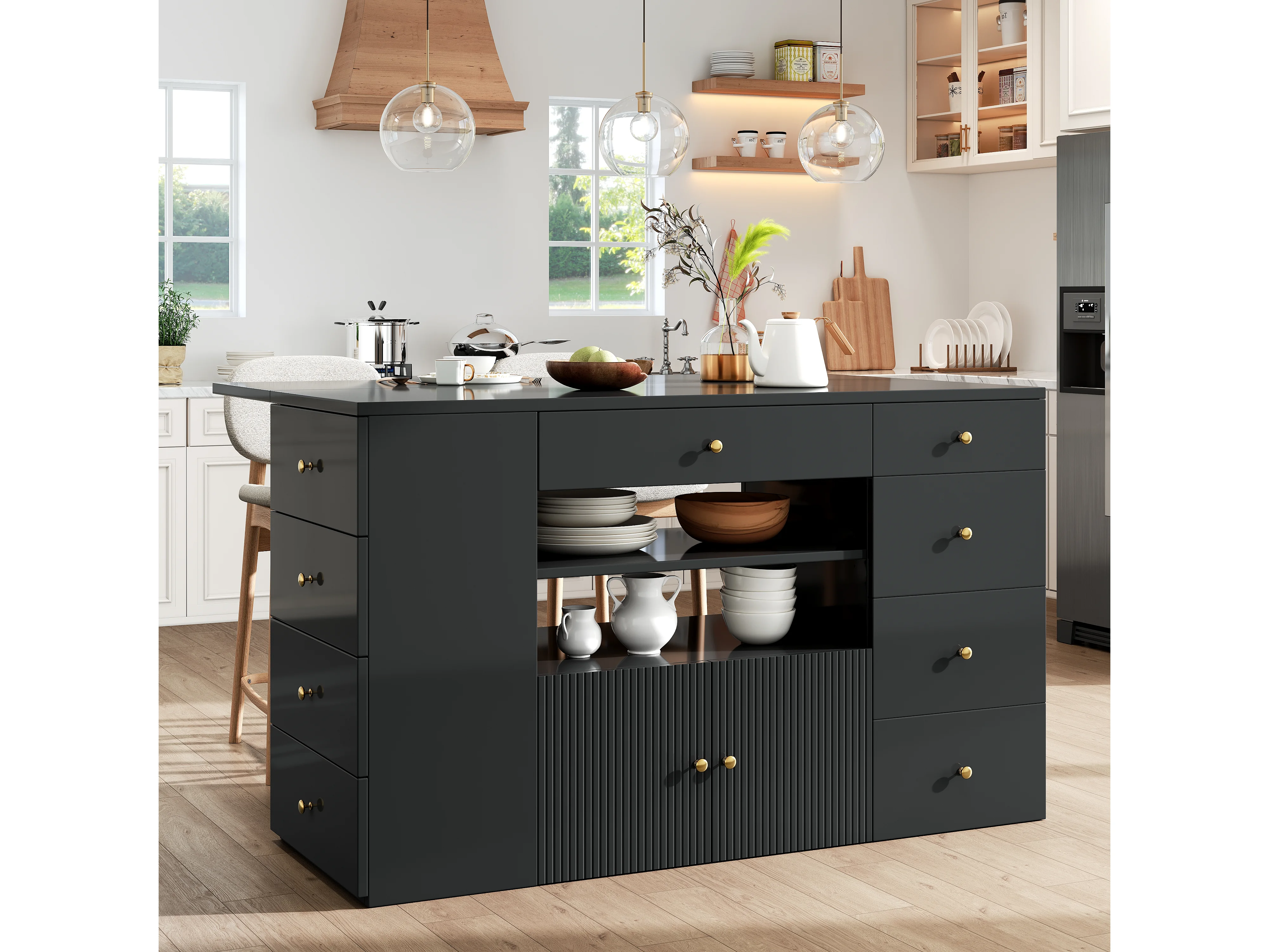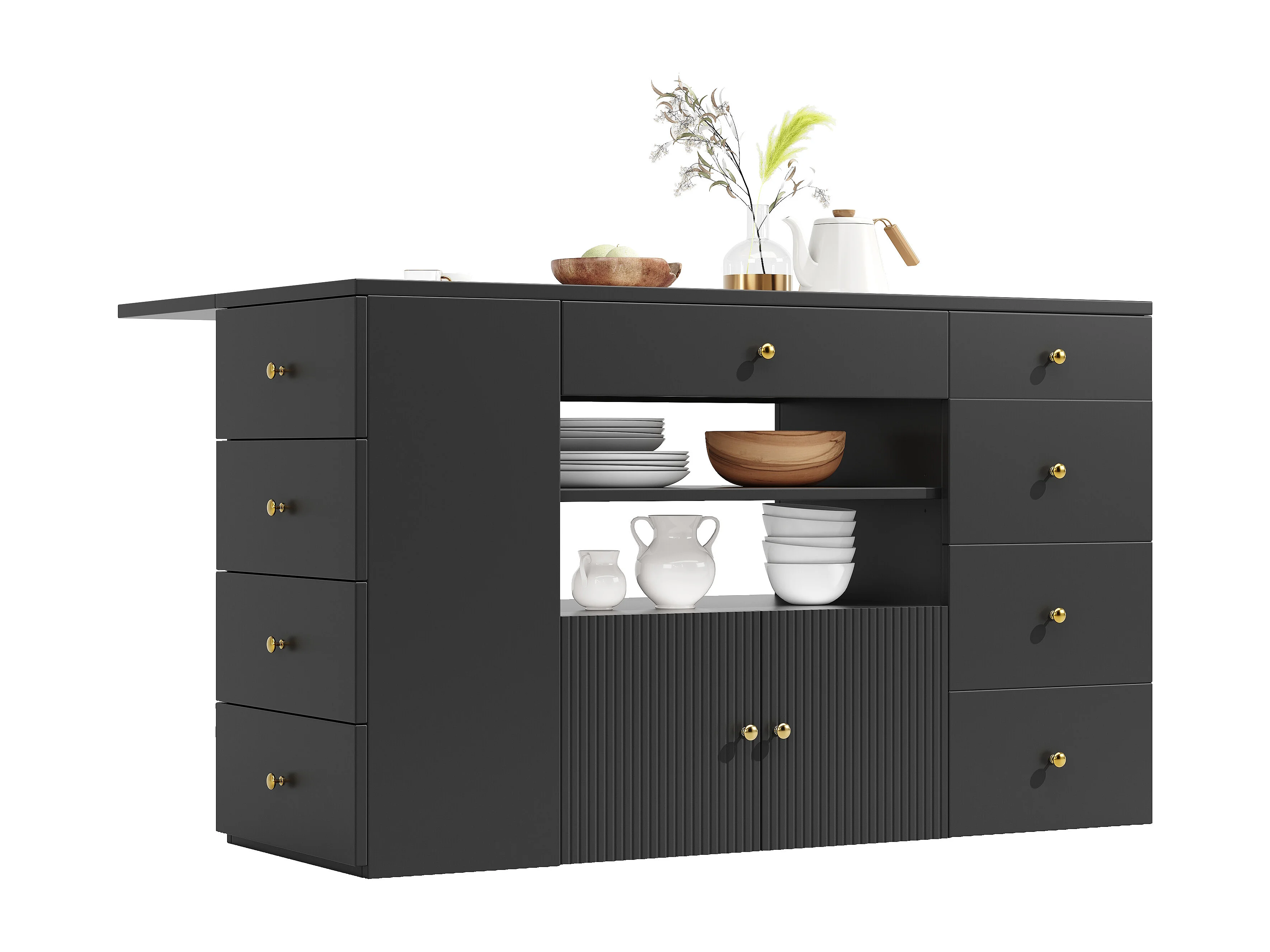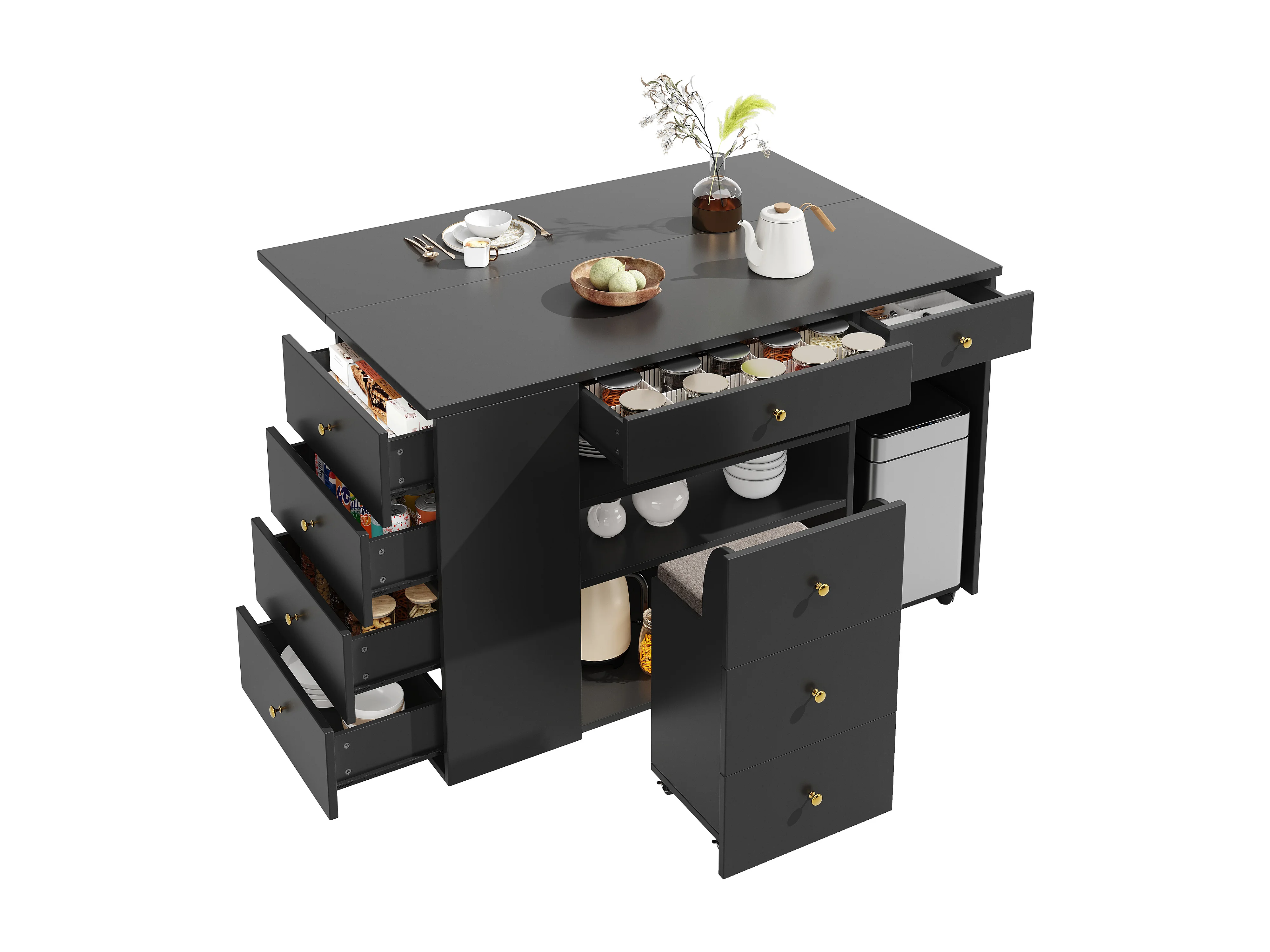 Ilot central de cuisine - Plateau extensible - 140x70x89cm - 3 portes et 6 tiroirs - avec tabourets - MDF - Noir