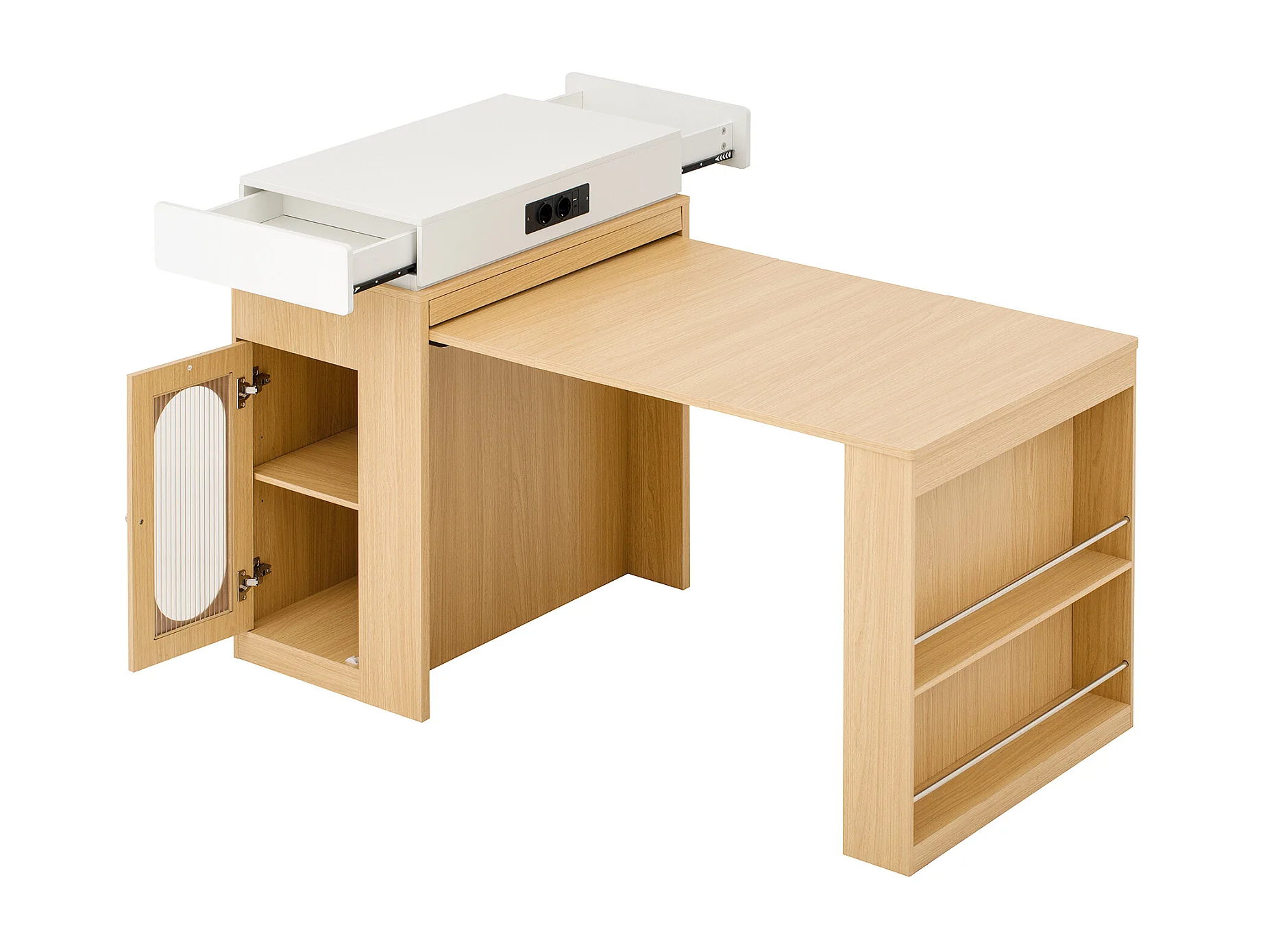 Ilot central de cuisine - table à manger extensible - avec prise de courant - avec roulettes et espace de rangement - avec crochet - Naturel