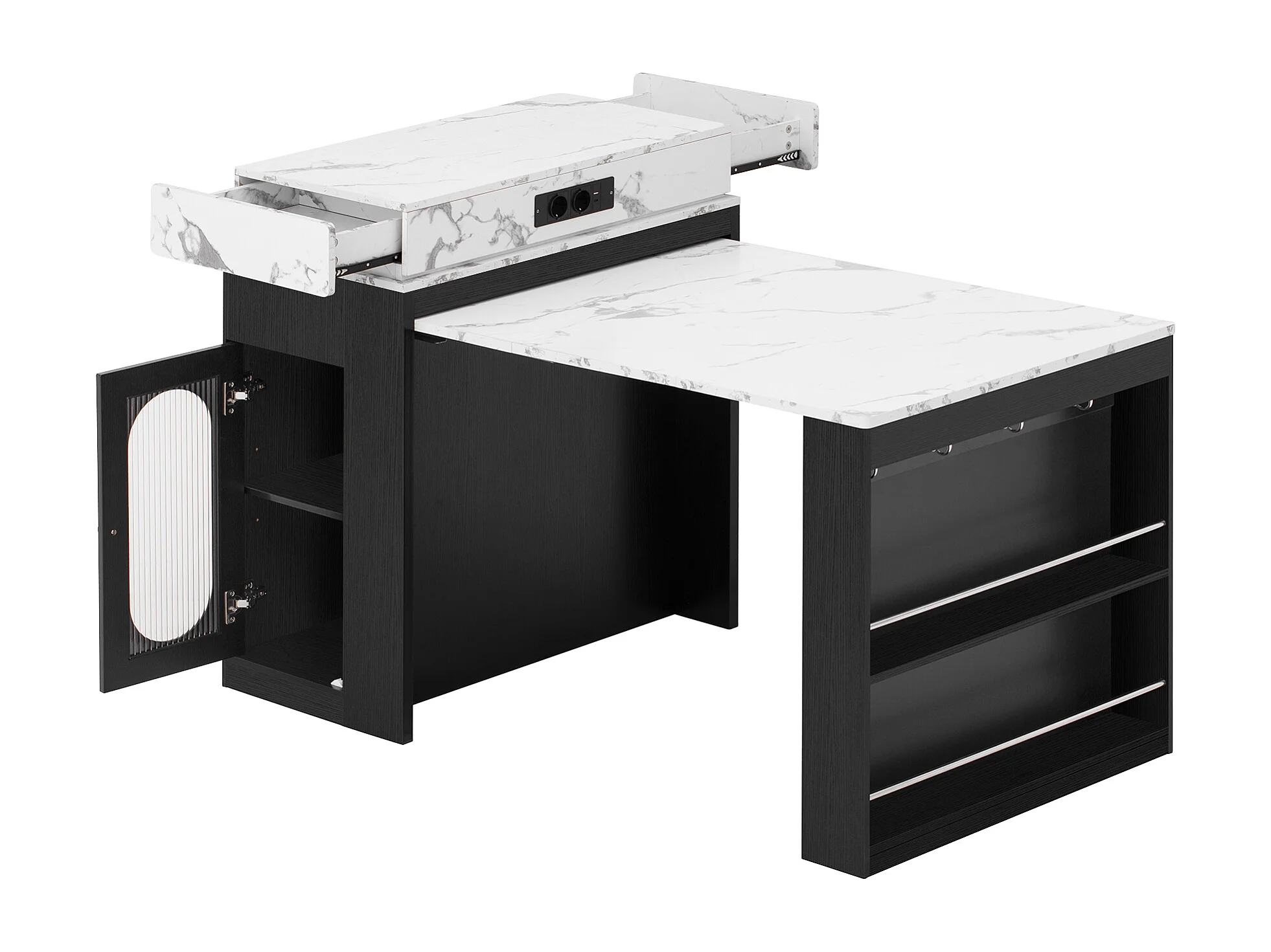 Ilot central de cuisine - table à manger extensible - avec prise de courant - avec roulettes et espace de rangement - avec crochet - Noir + Blanc
