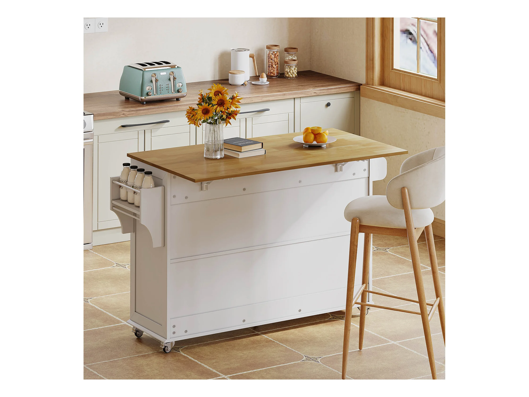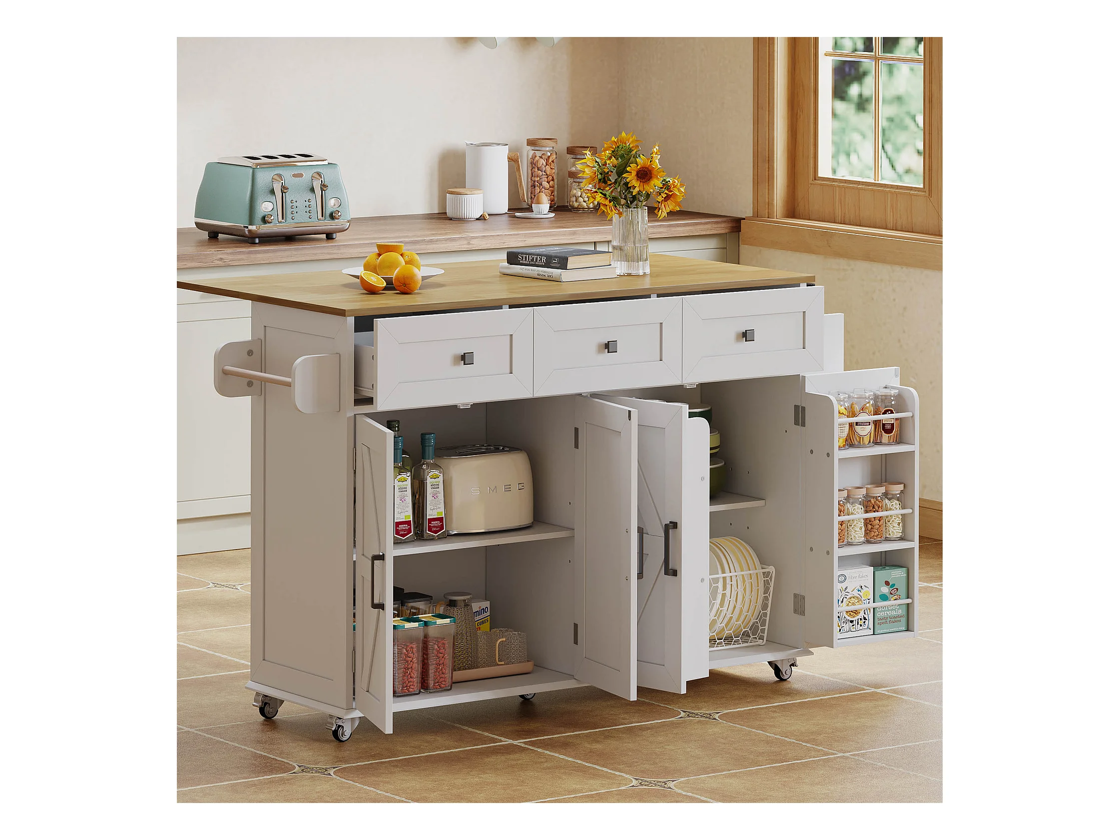 Ilot central de cuisine - table à manger pliable - avec 5 roulettes verrouillables - avec 3 tiroirs et 4 portes - avec porte-serviettes - Blanc