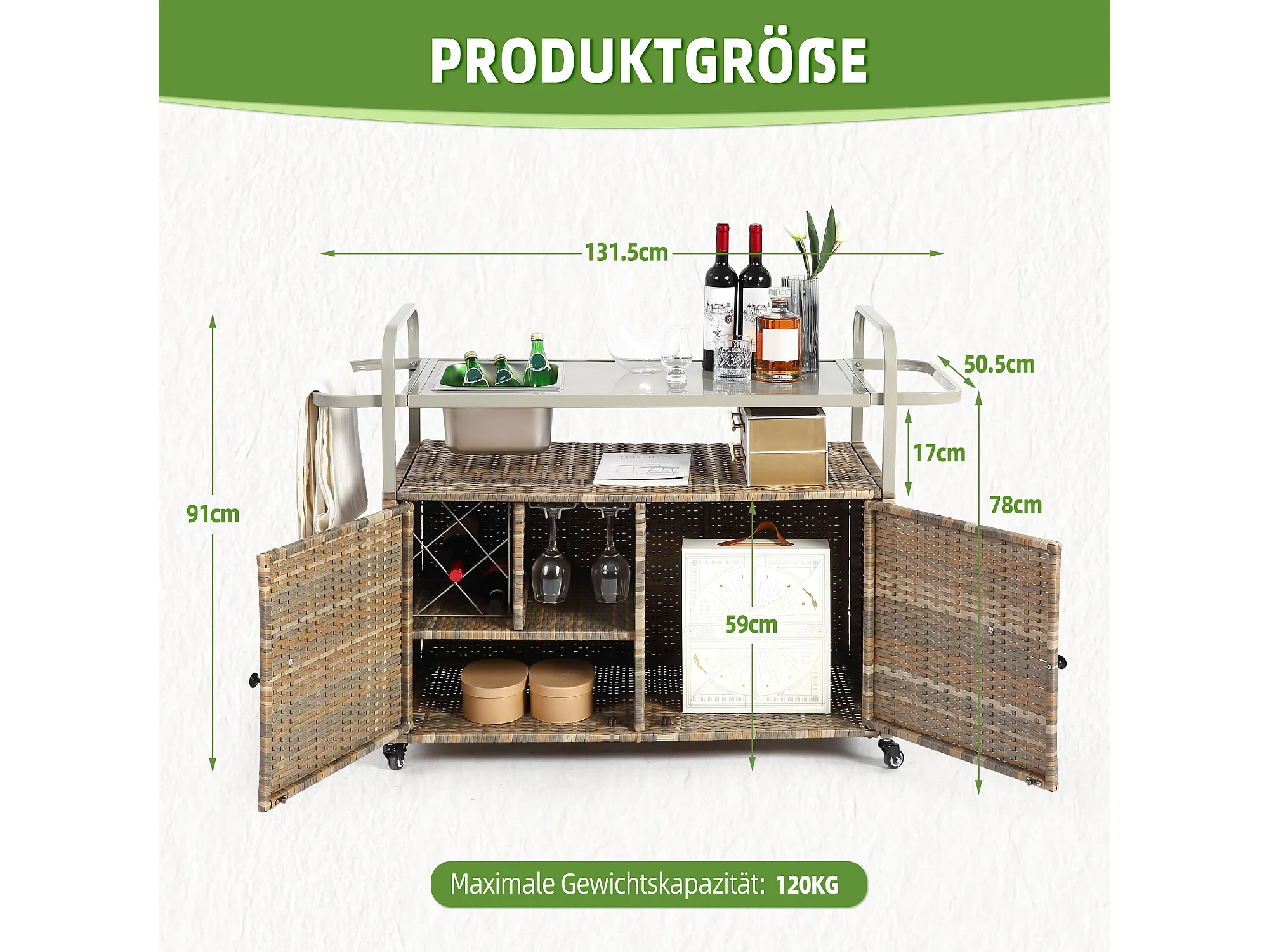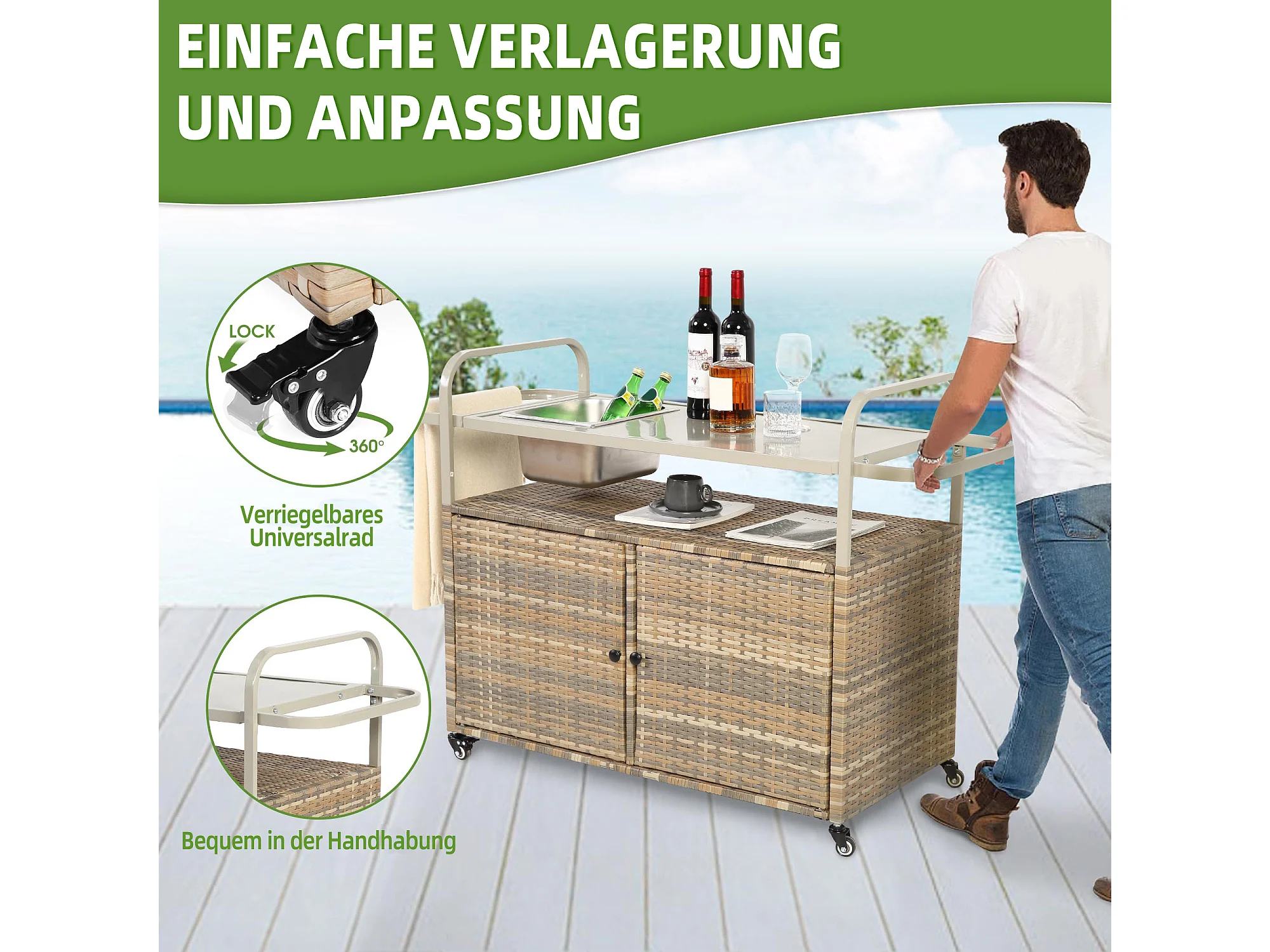 Îlot central en rotin beige - 2 portes - Style bohème naturel avec 2 étagères - Avec roulettes pour déplacement facile - Idéal pour terrasse ou jardin
