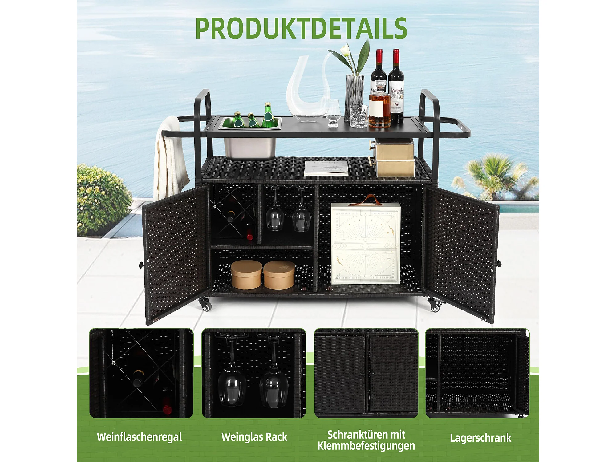 Îlot central en rotin noir - 2 portes - Style bohème naturel avec 2 étagères - Avec roulettes pour déplacement facile - Idéal pour terrasse ou jardin
