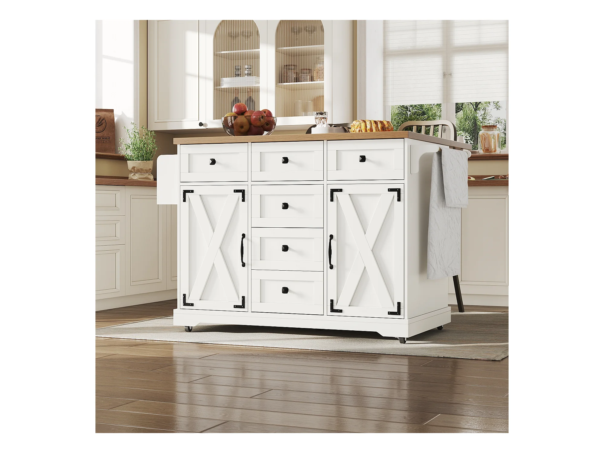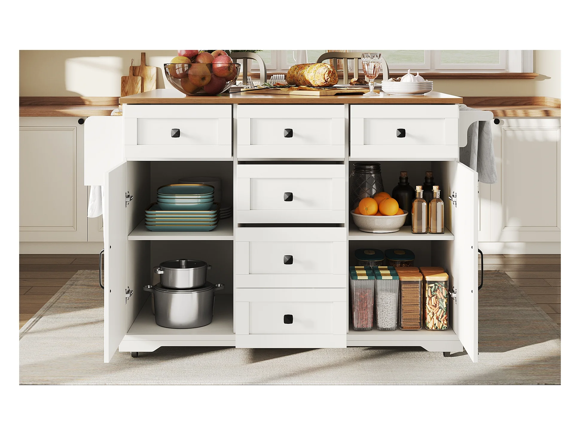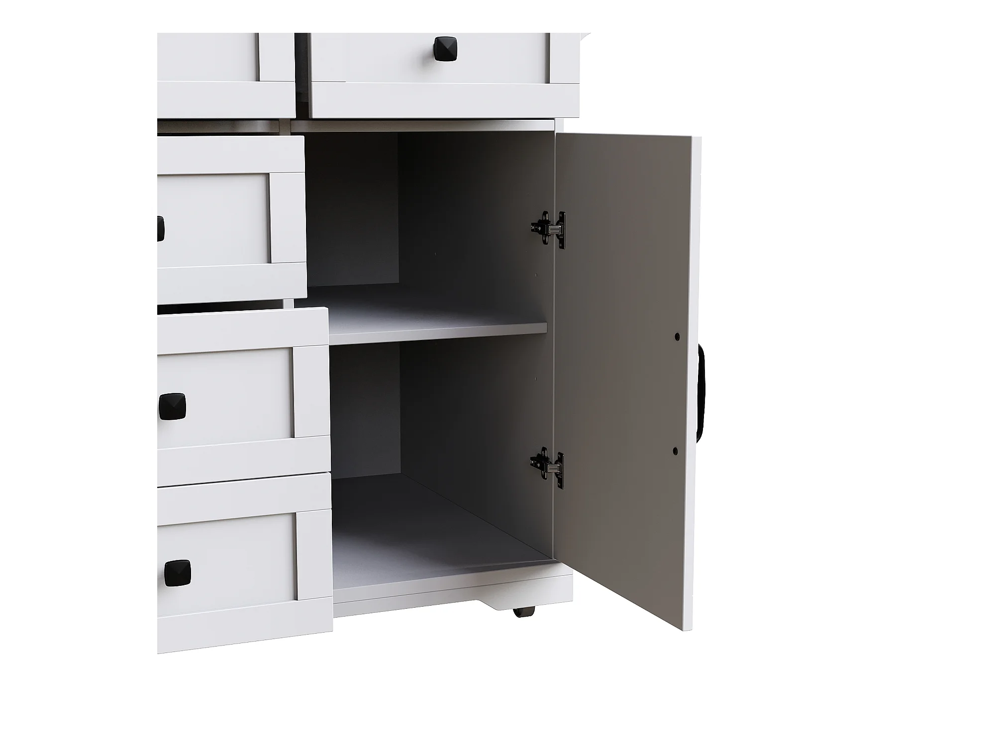 Îlot central à roulettes avec plan de travail rabattable + 4 portes + 3 tiroirs - 140 x 43(70) x 90.5 cm - blanc
