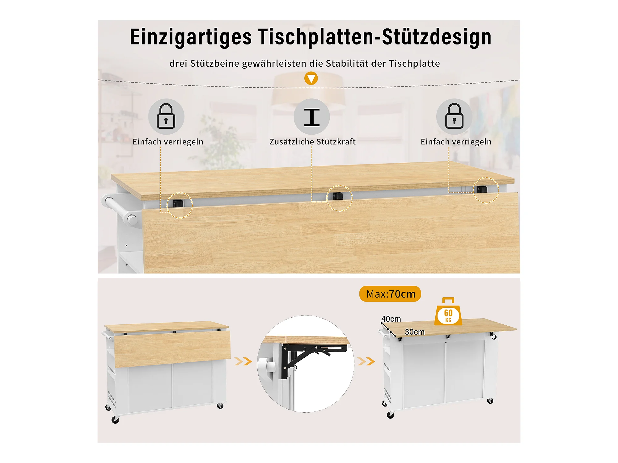 Îlot central à roulettes avec plan de travail rabattable + 4 portes + 3 tiroirs - 140 x 43(70) x 90.5 cm - blanc