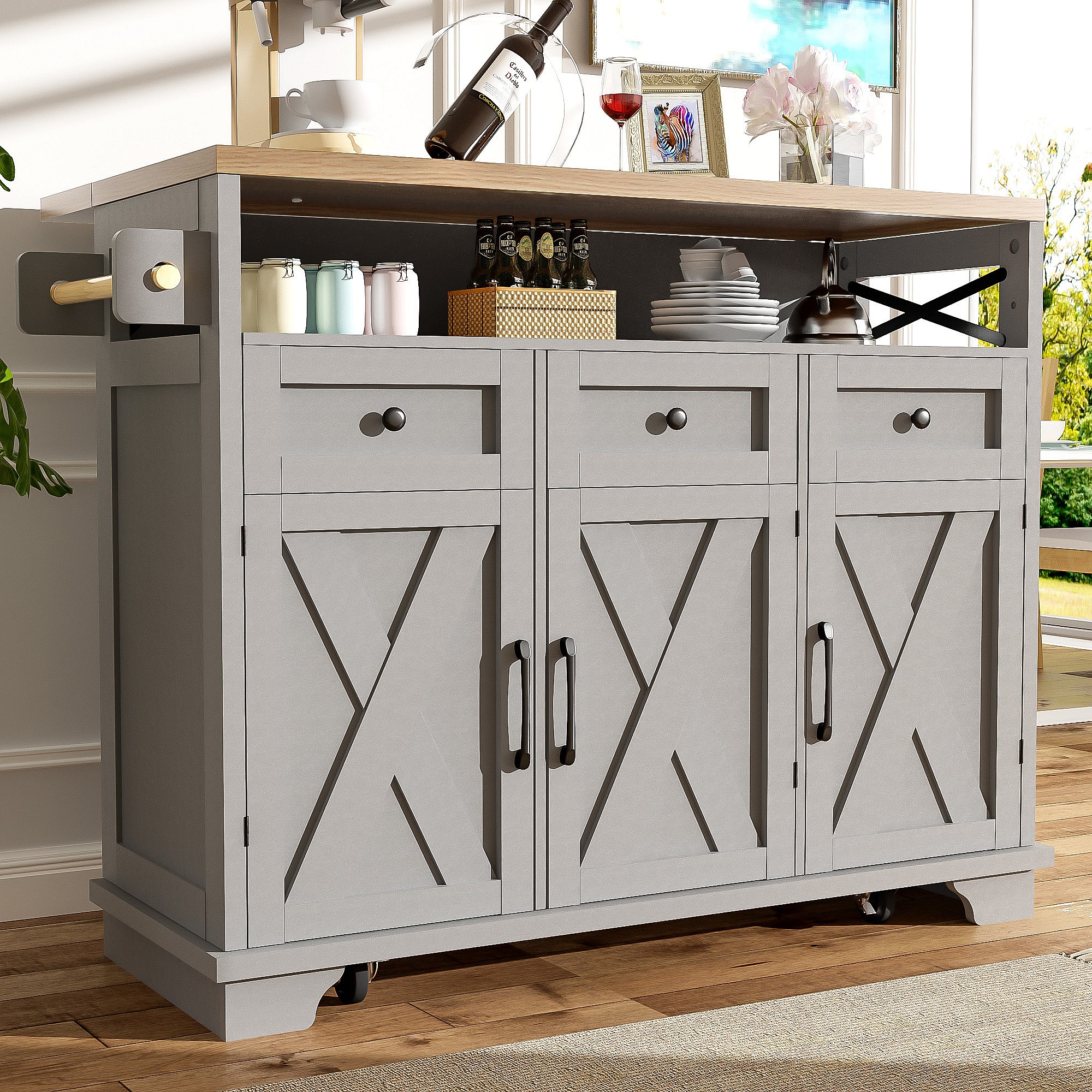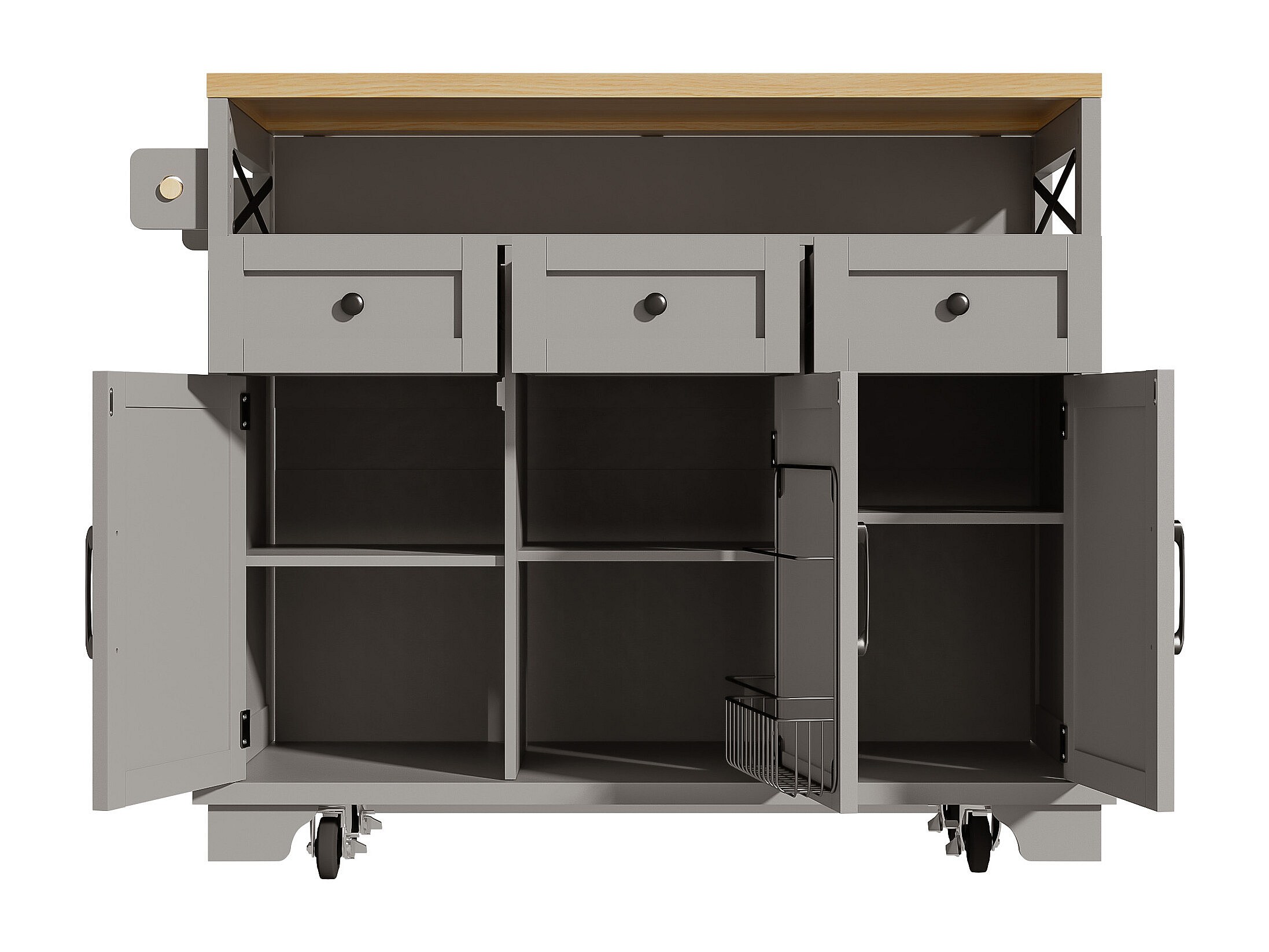 Îlot central gris avec comptoir en grain de bois, 3 tiroirs de rangement et 3 portes