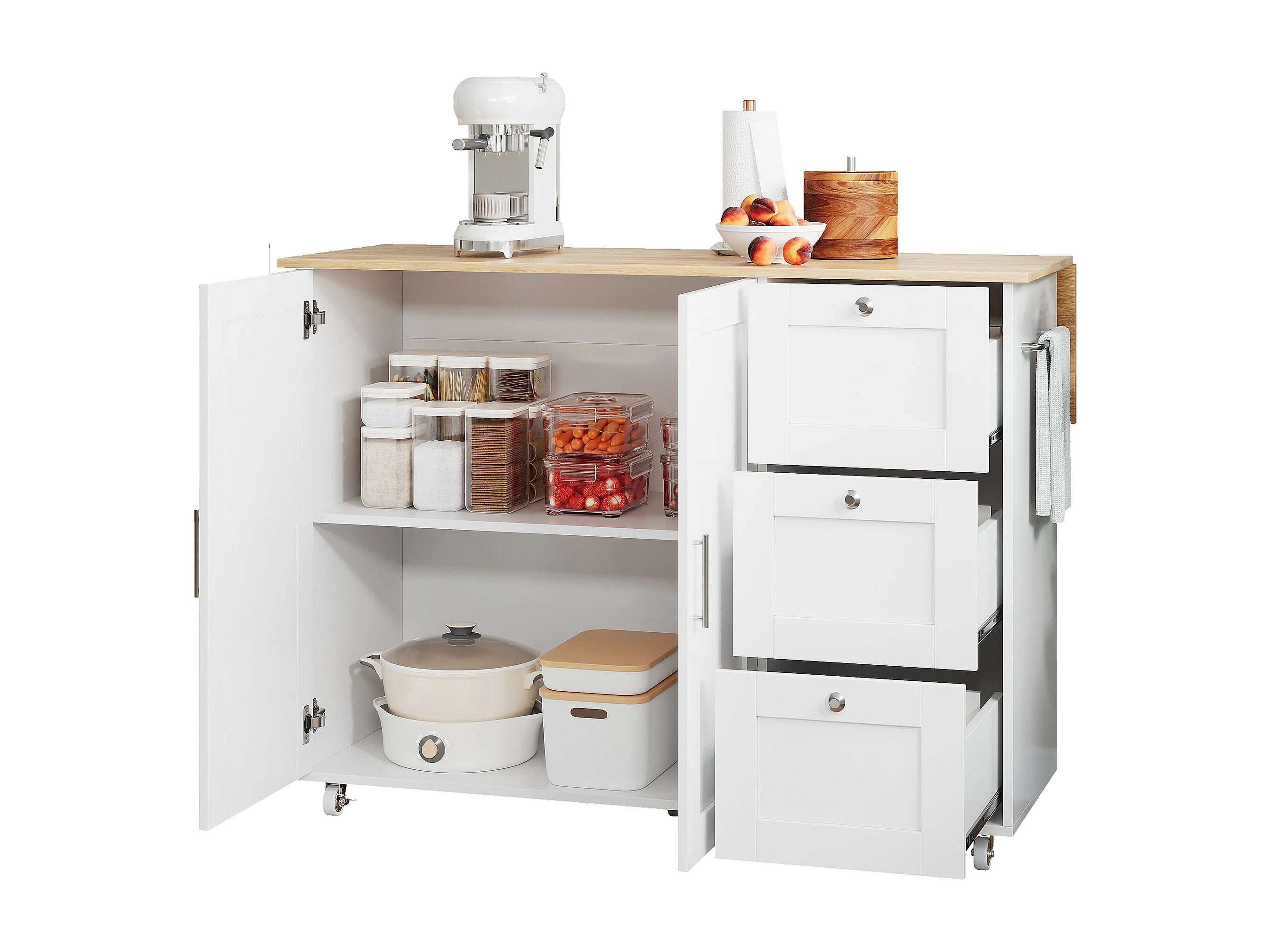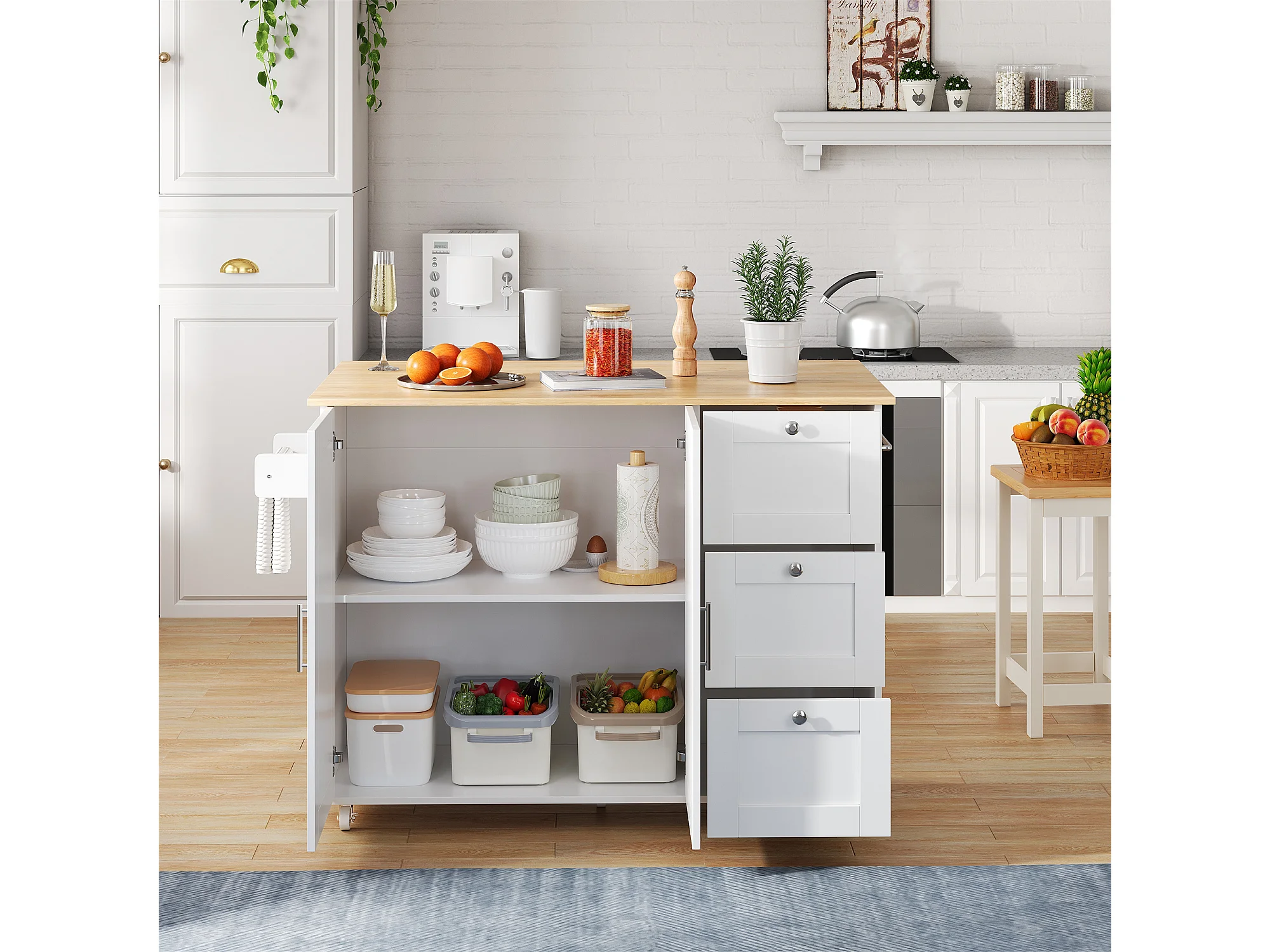 Îlot central mobile avec plan pliable - 135 x 44/70 x 90 cm - avec 3 tiroirs + 2 portes - MDF - blanc