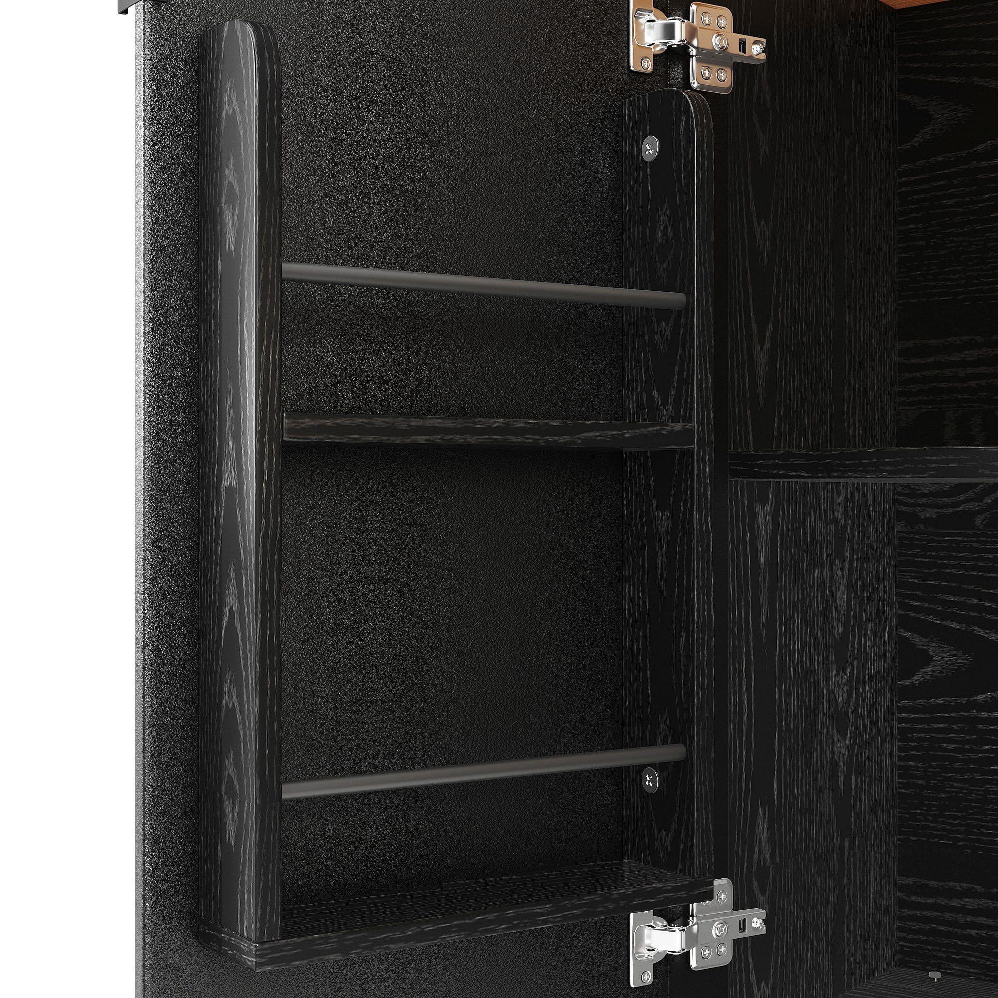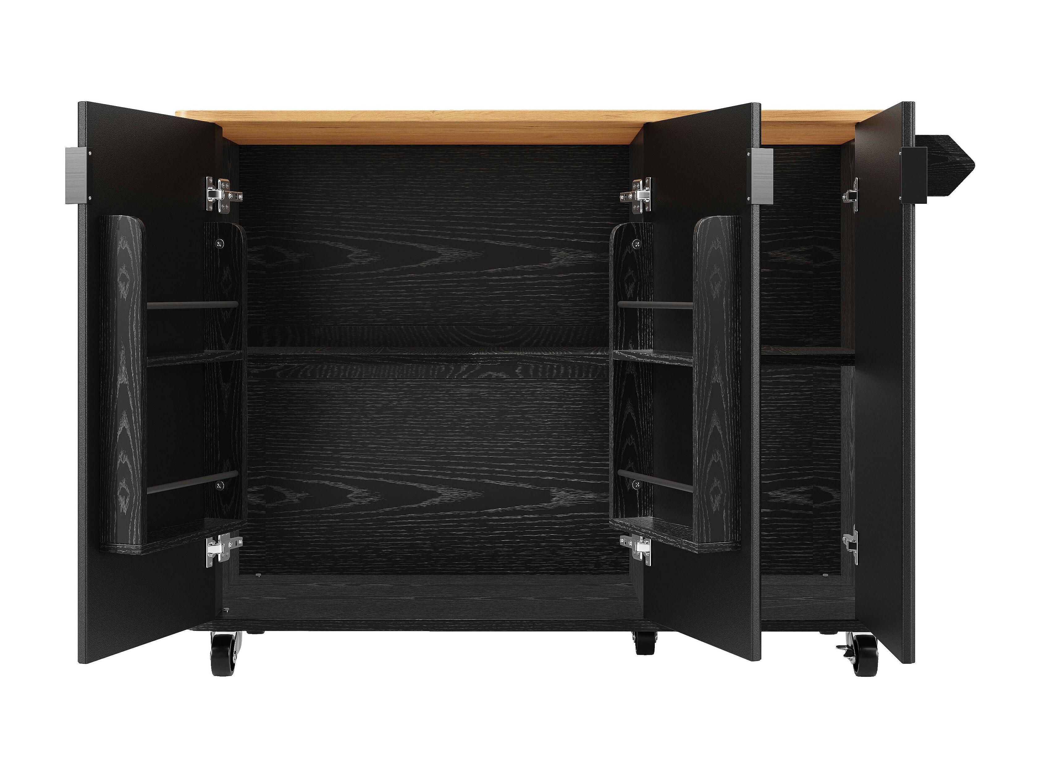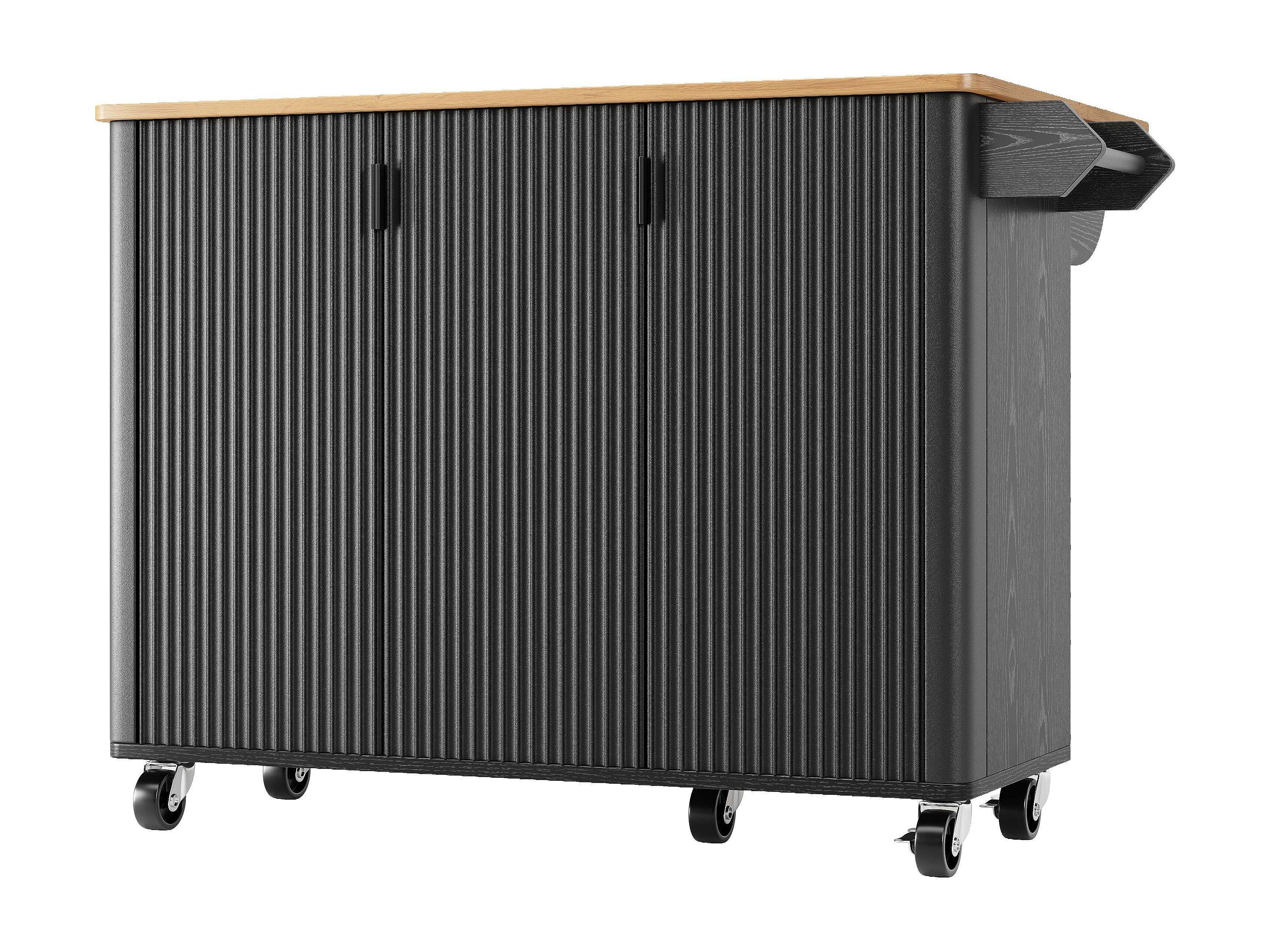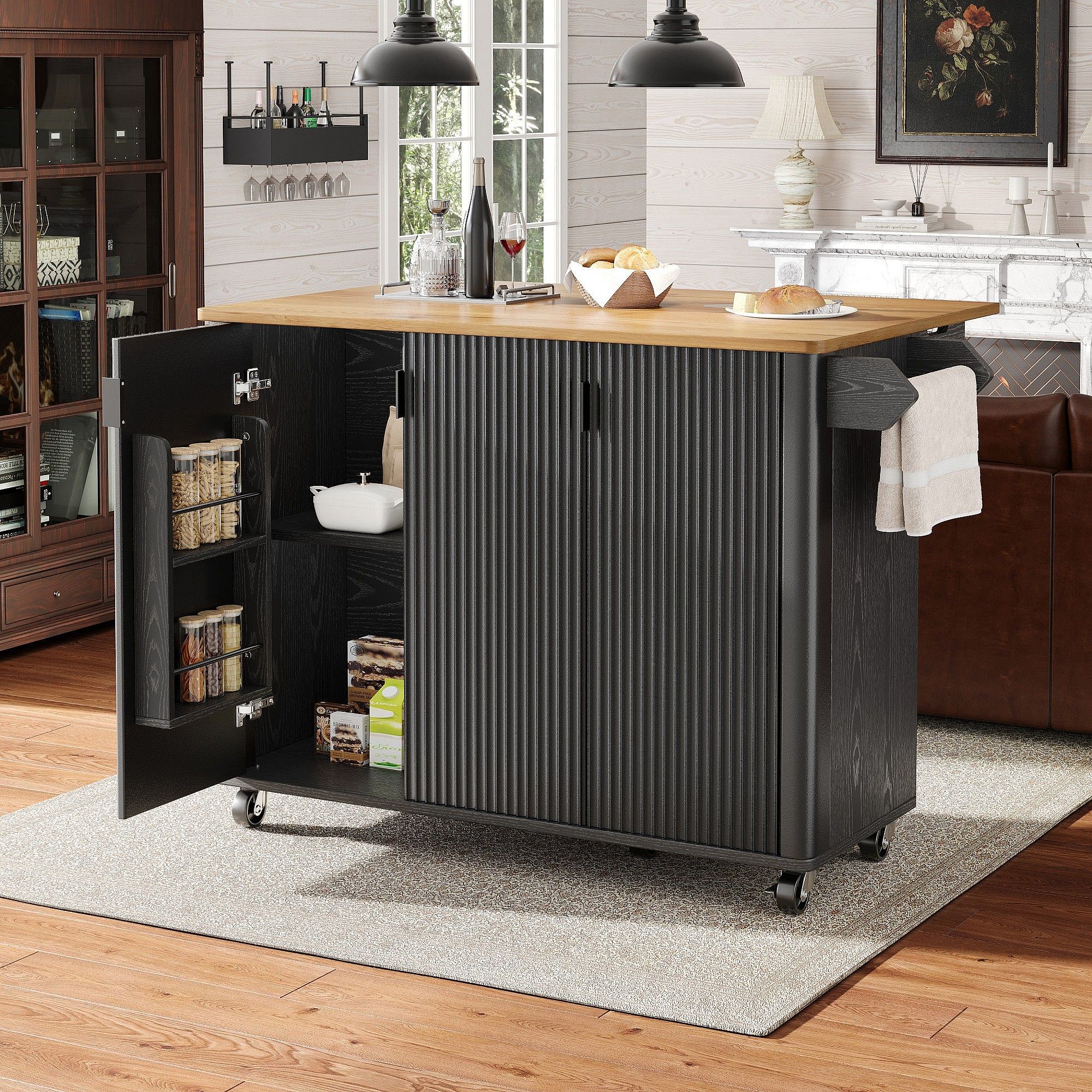 Îlot central mobile avec plateau en bois, 3 portes texturées et étagère à épices - noir