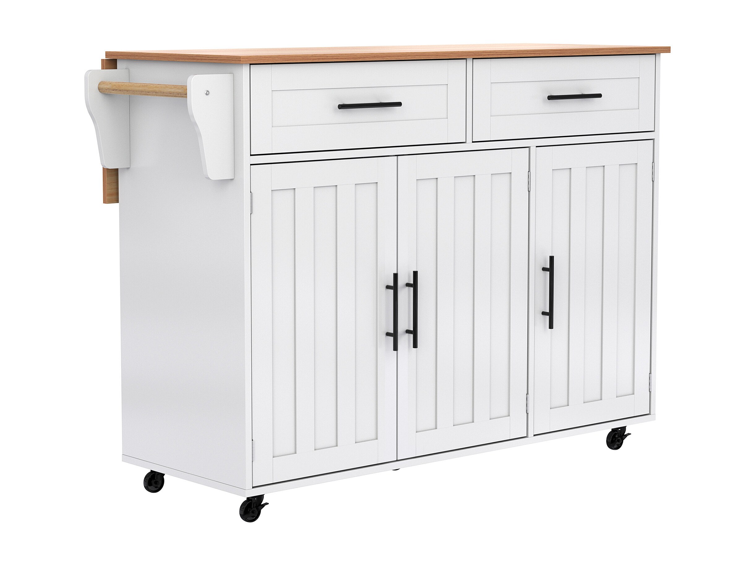 Îlot central mobile avec plateau rabattable, 3 portes et 2 tiroirs de rangement - Blanc