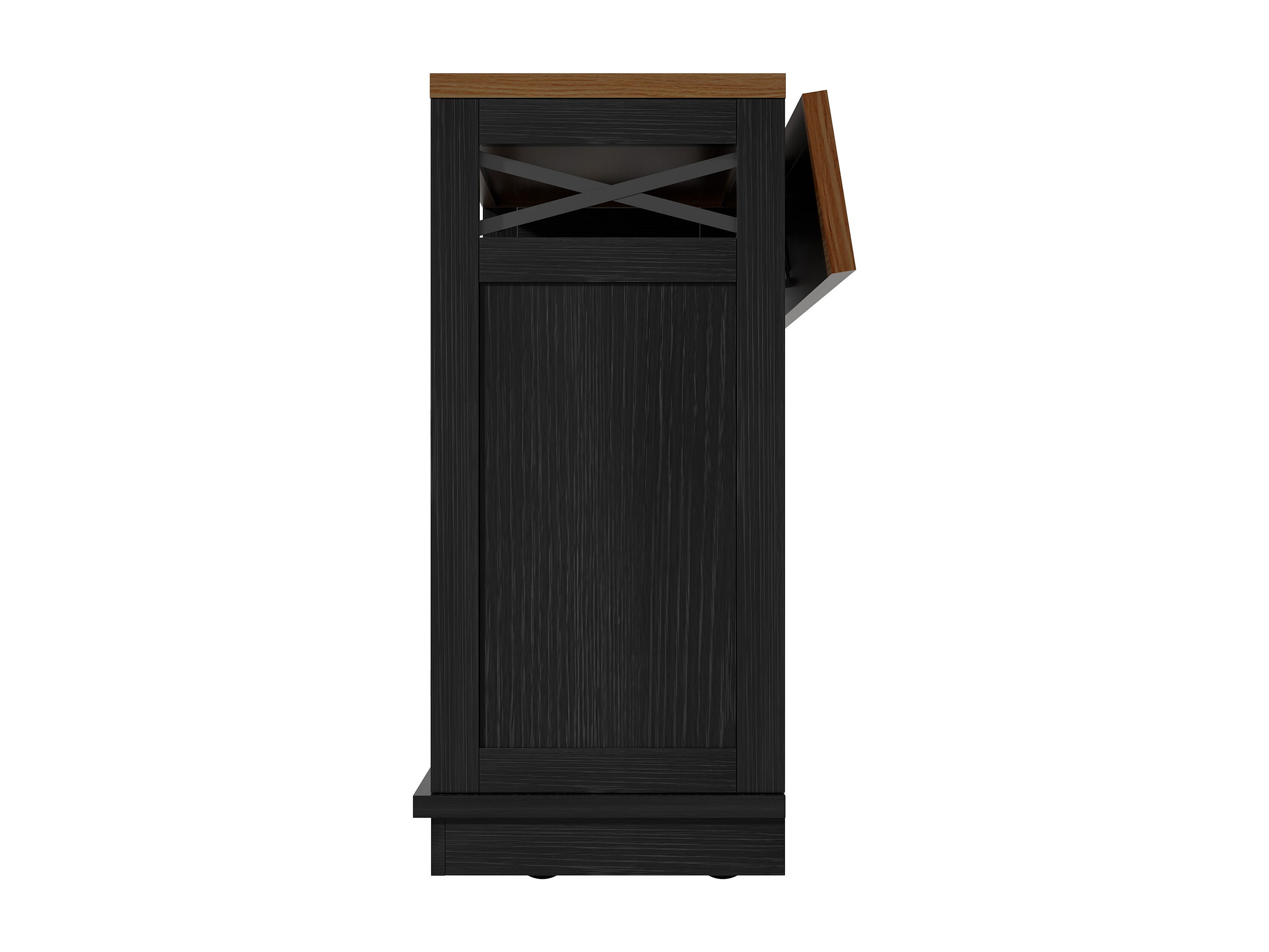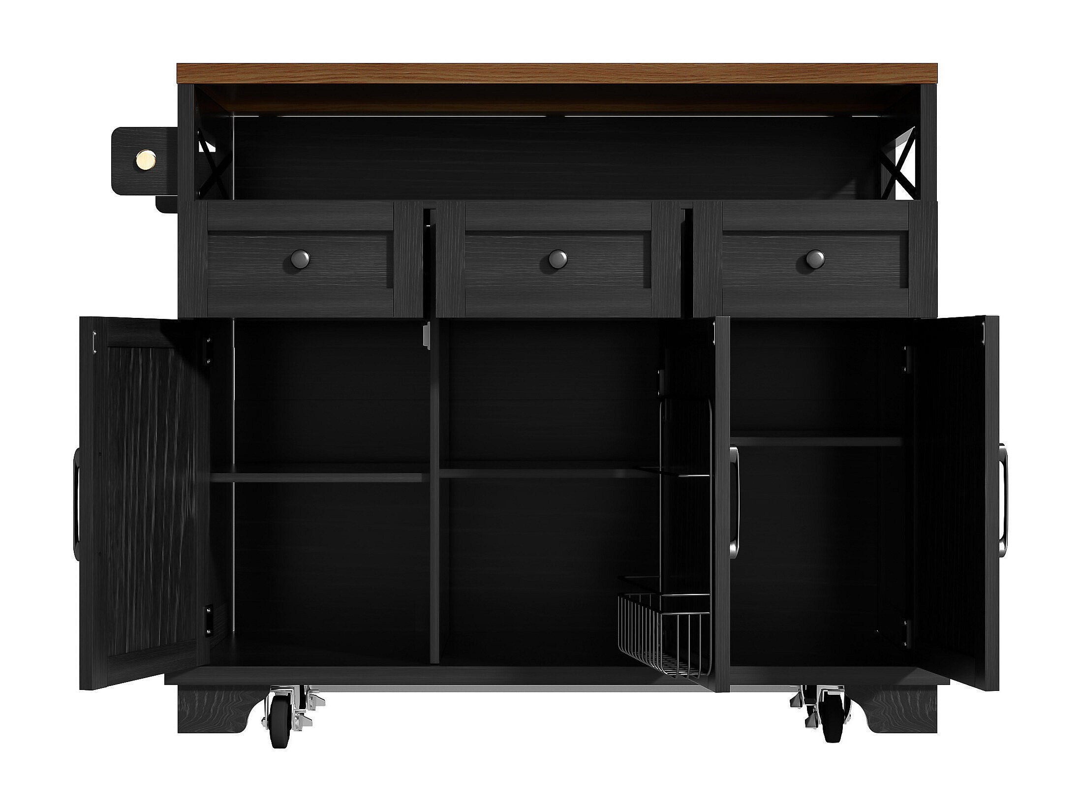 Îlot central noir avec comptoir en grain de bois, 3 tiroirs de rangement et 3 portes