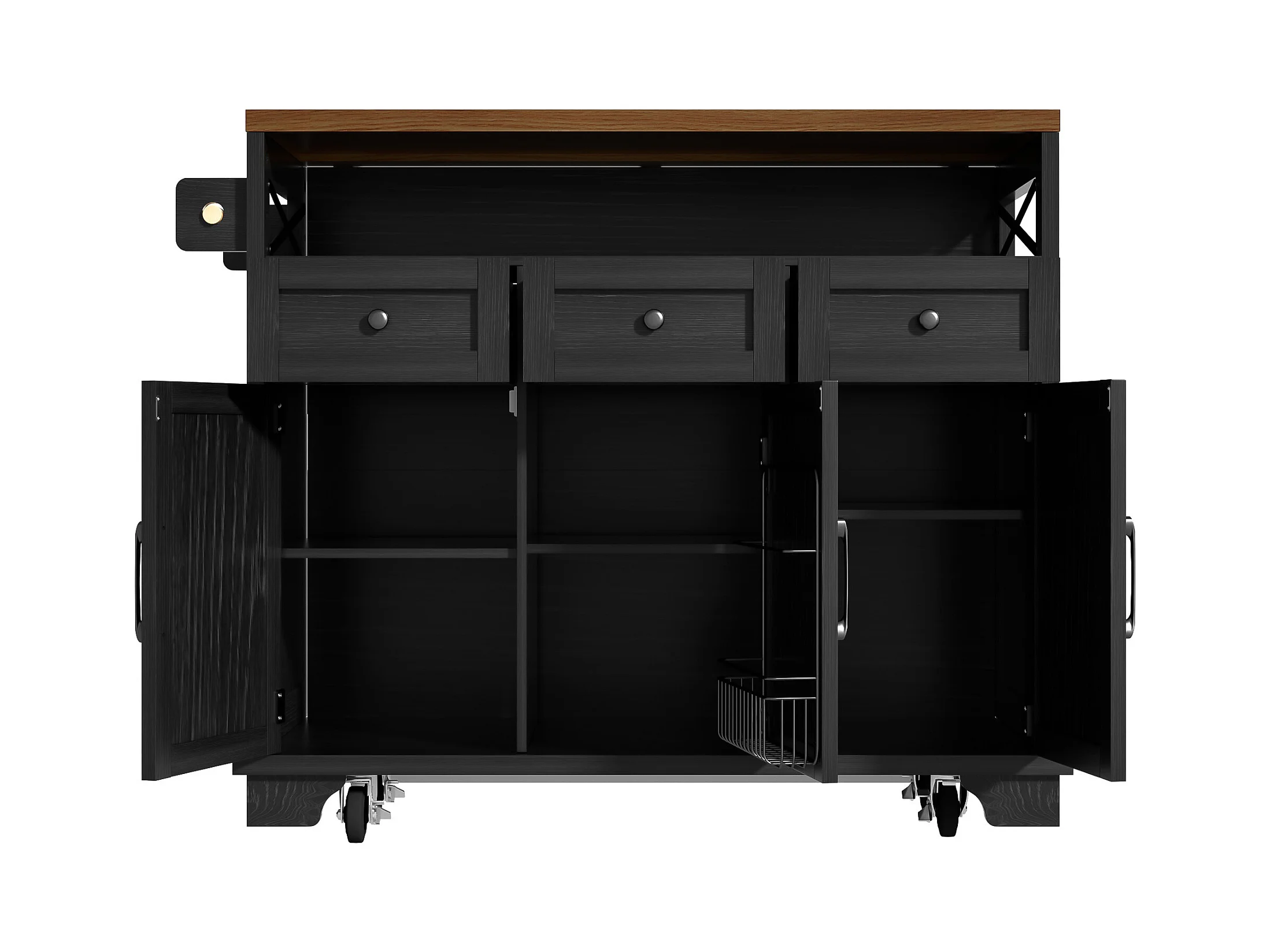 Îlot central mobile avec plateau en bois, 3 portes texturées et étagère à épices - noir