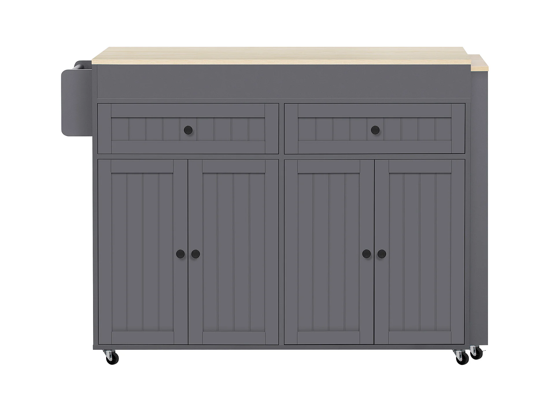 Desserte gris - Îlot de cuisine con 2 puertas y 2 cajones - toallero y 5 ruedas - tablero plegable