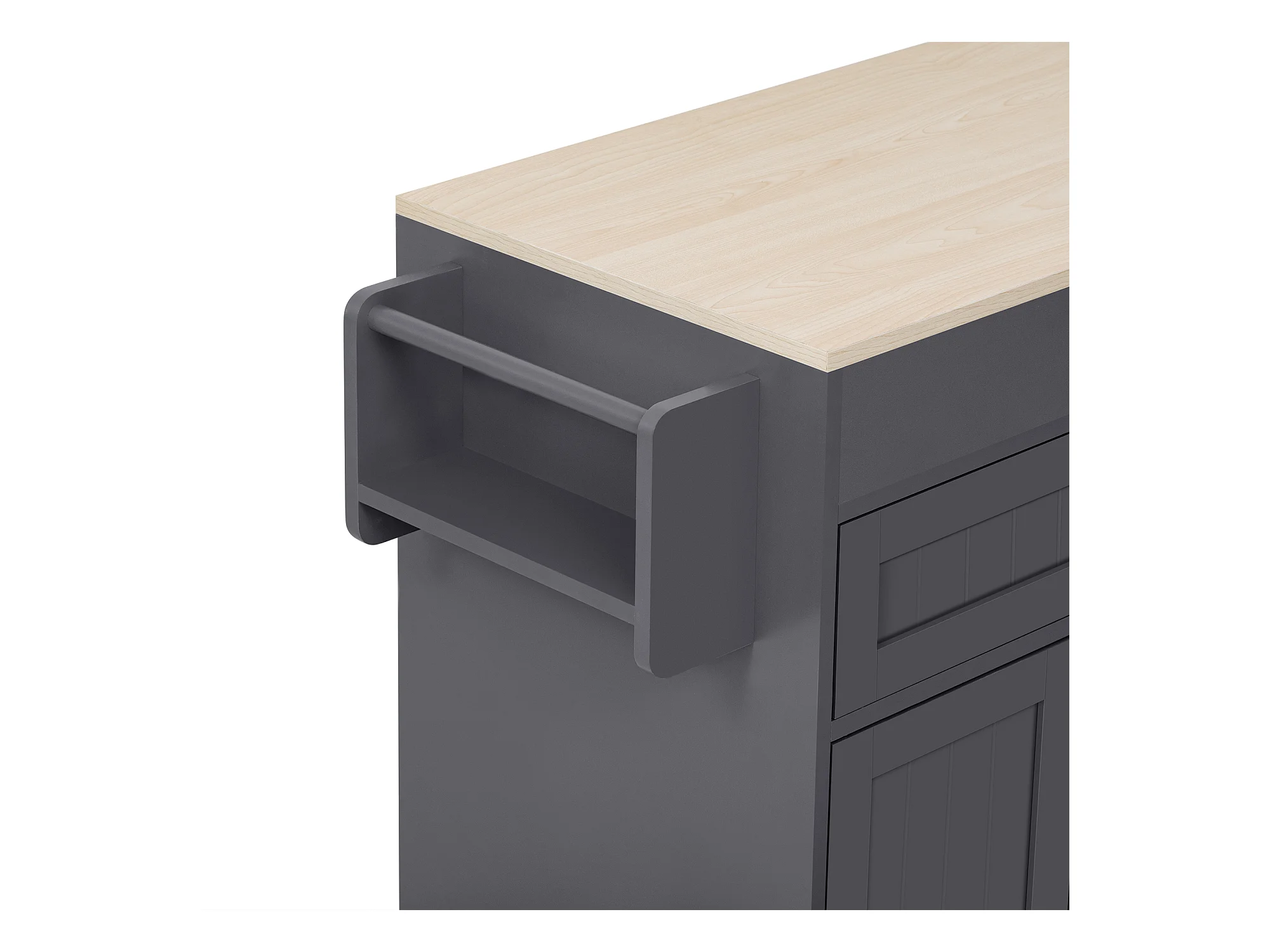 Îlot central de cuisine gris à 3 portes et 3 tiroirs - Desserte de cuisine avec porte-serviettes et rangement ouvert - plateau pliable