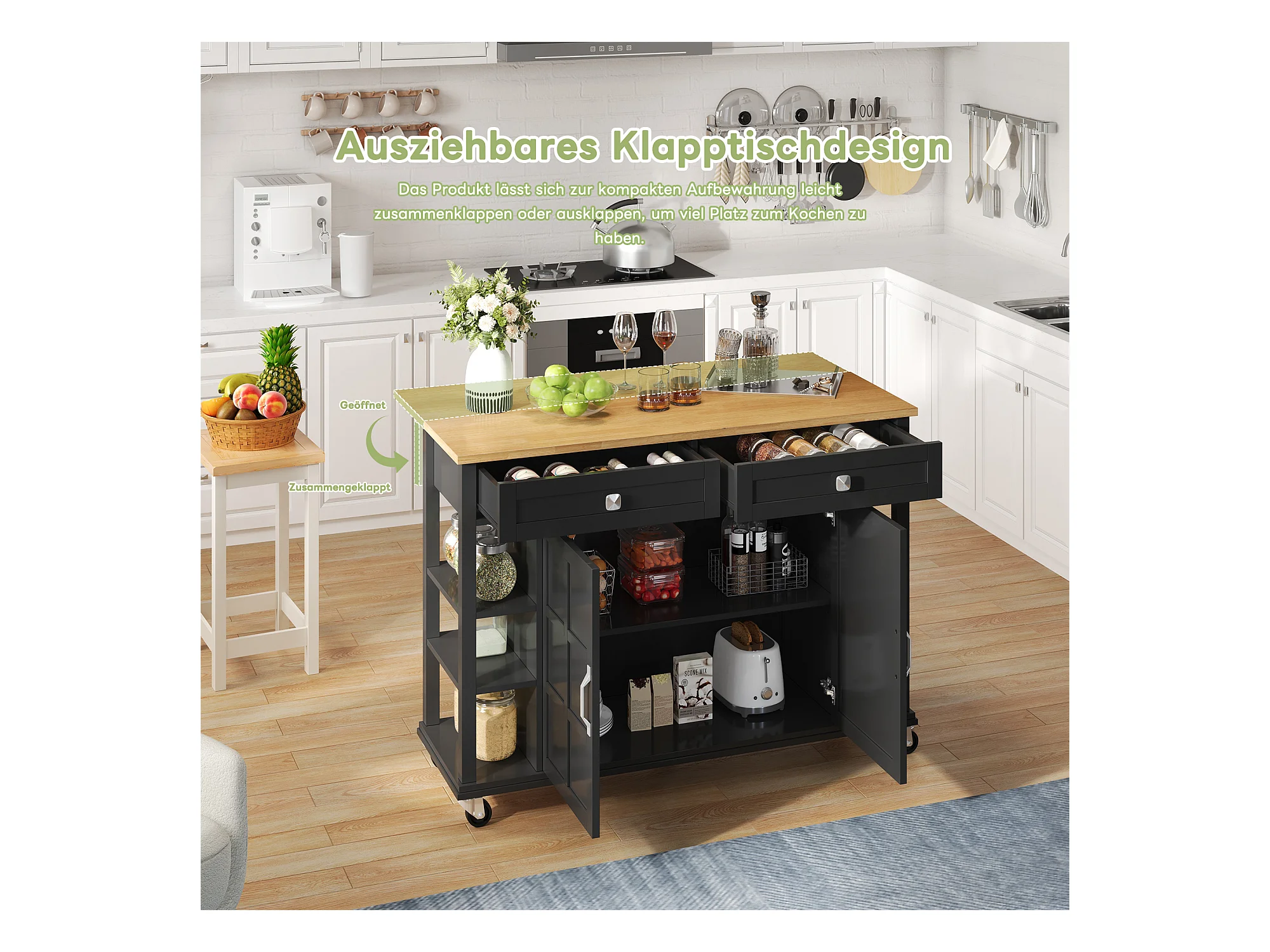Îlot de cuisine à roulettes - 120 x 40 x 89 - avec plan rabattable extensible + 2 tiroirs + 2 portes - MDF - noir