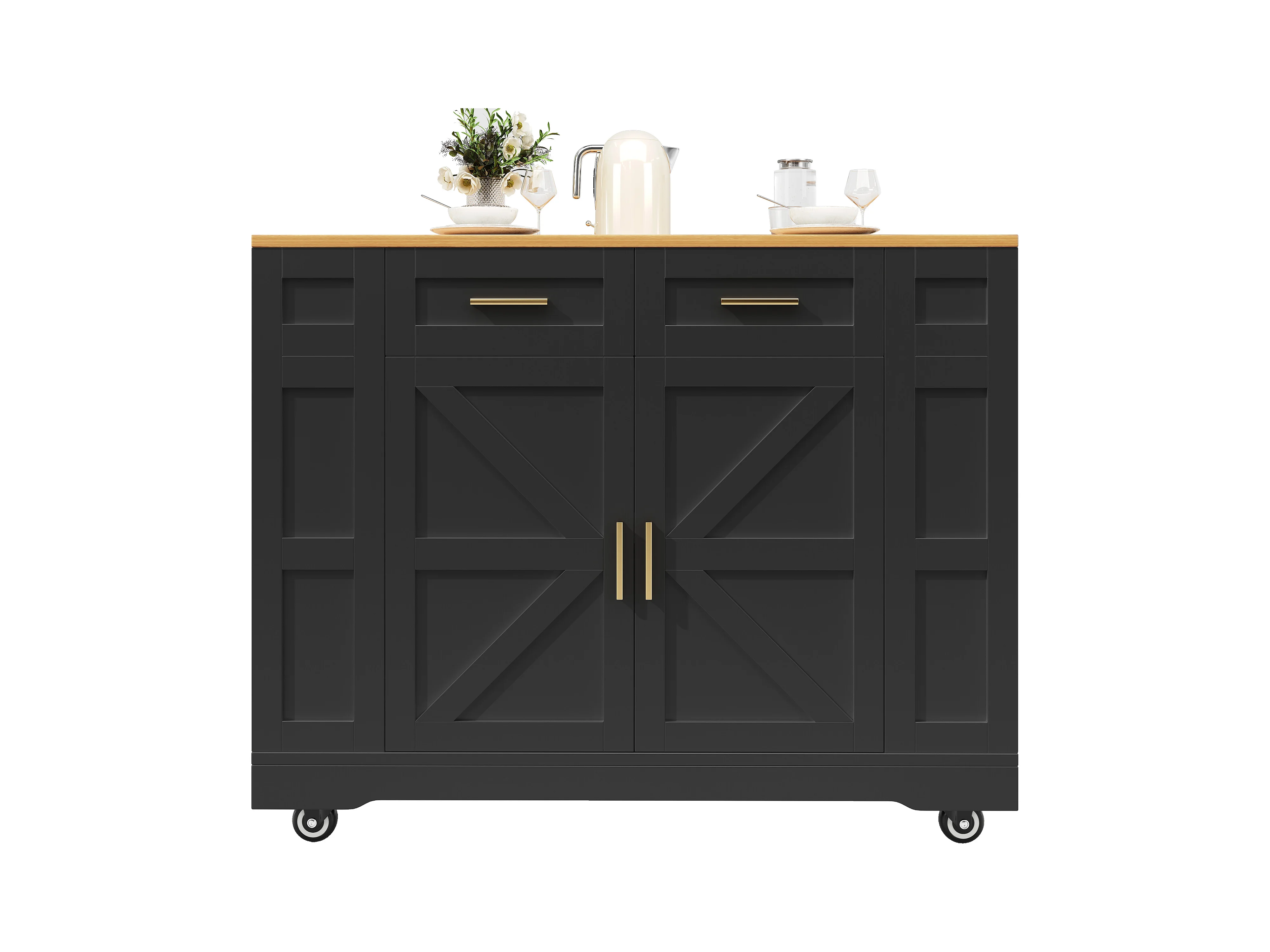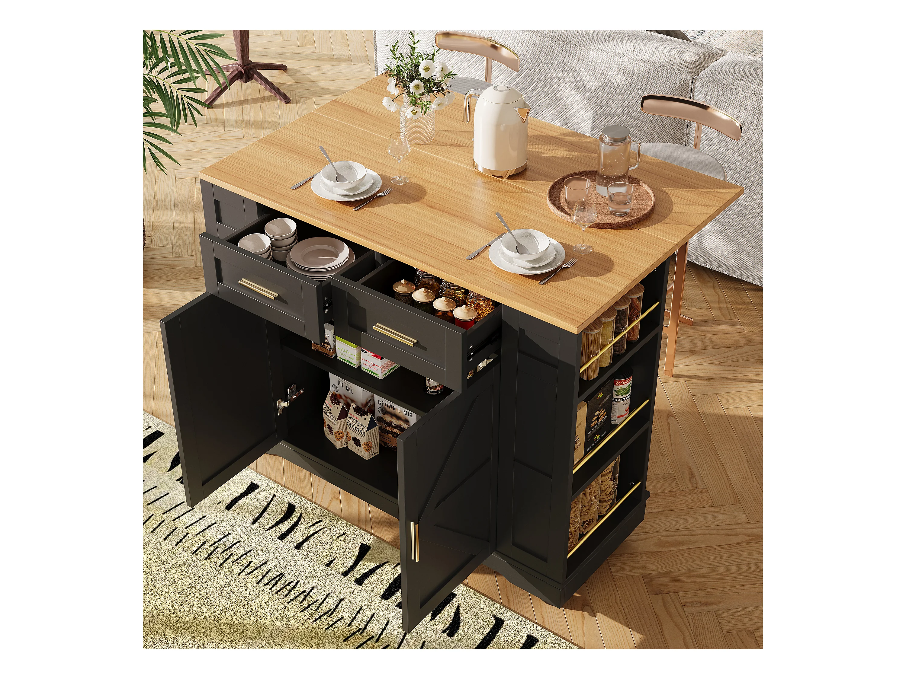 Ilot central de cuisine mobile avec 2 tiroirs, 1 porte et compartiments - 120x42/76x91.5cm - MDF et métal - Noir + naturel
