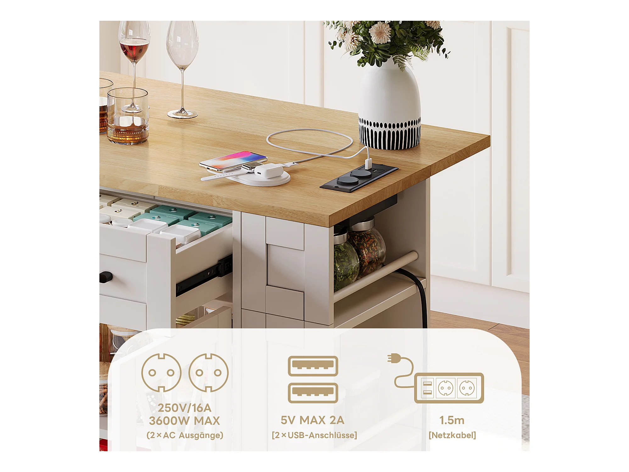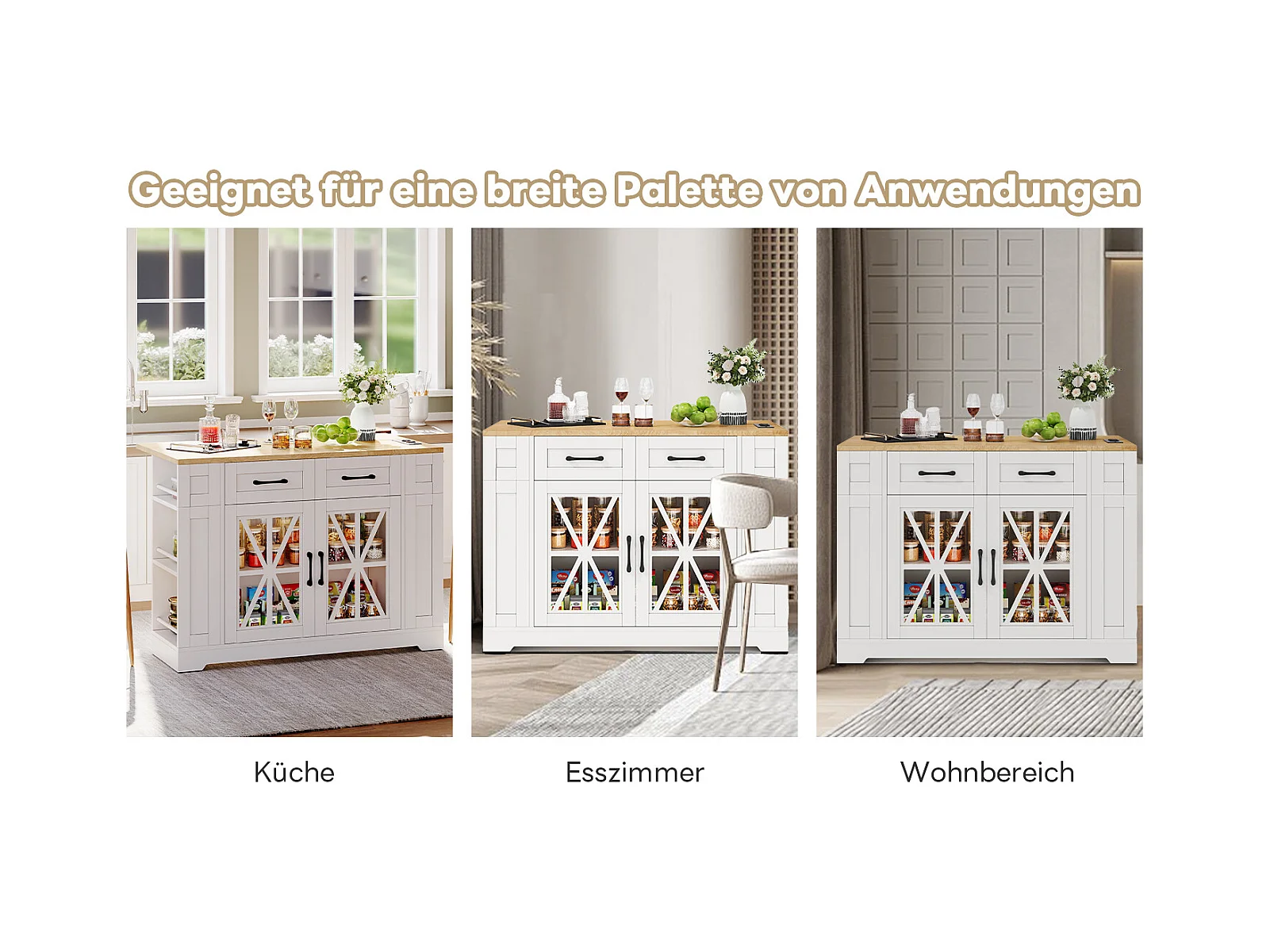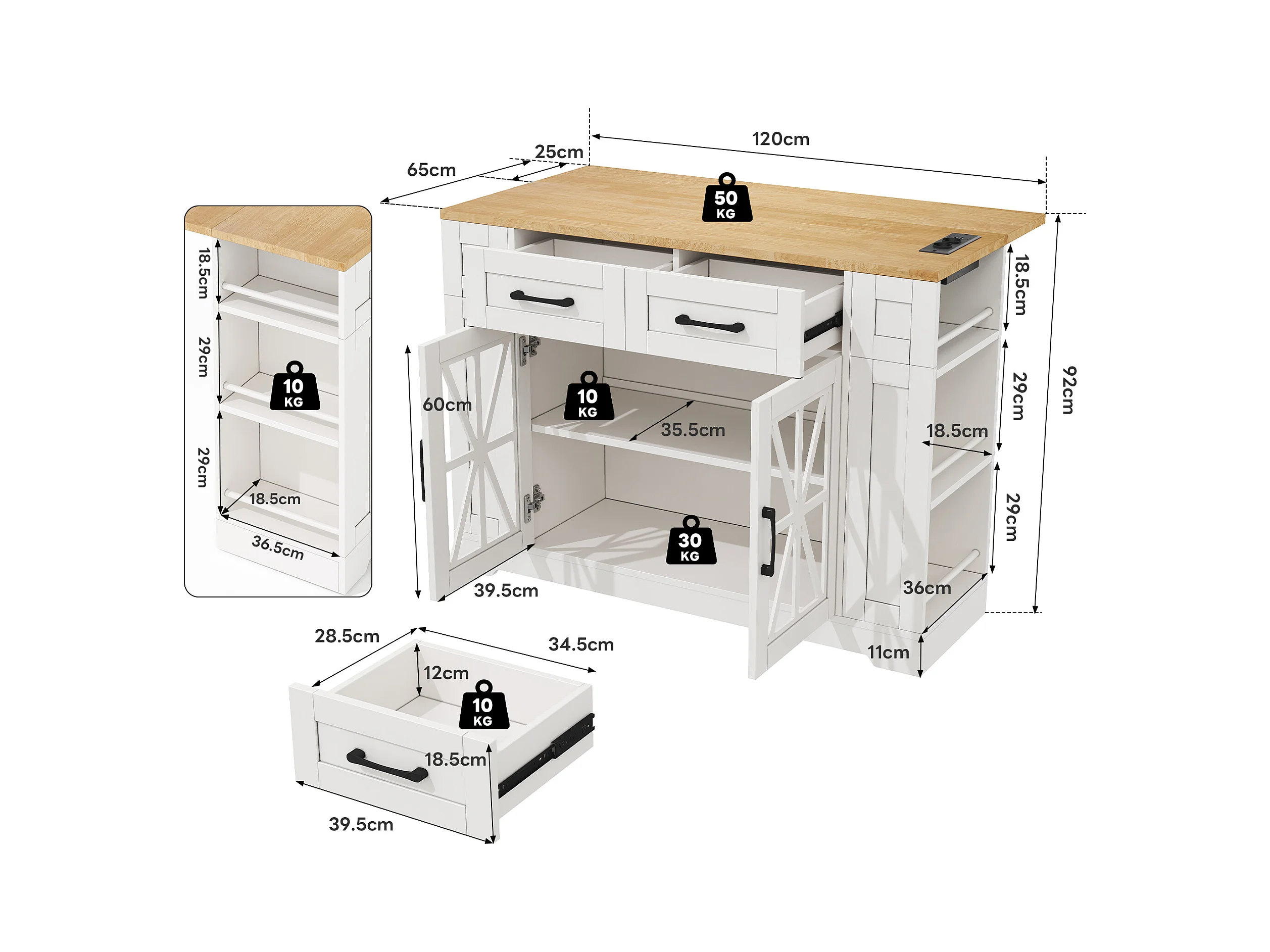 Îlot de cuisine à roulettes - 120 x 65 x 92 cm - avec table pliante + porte vitrée + 2 tiroirs - MDF - Blanc