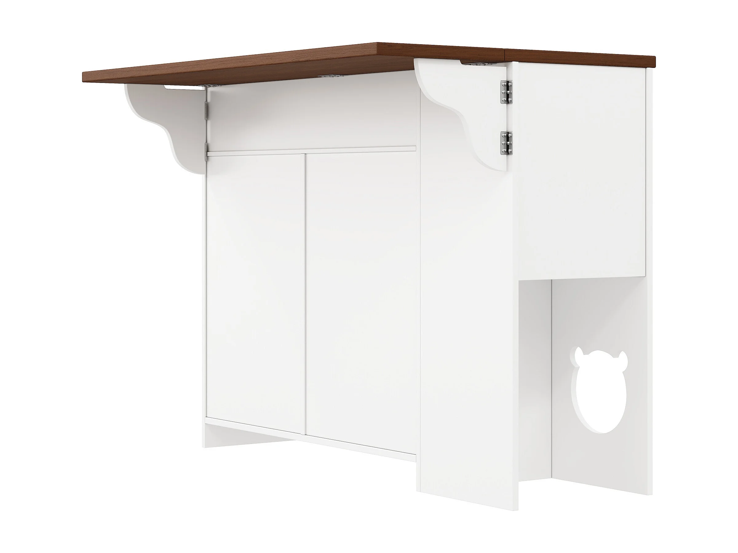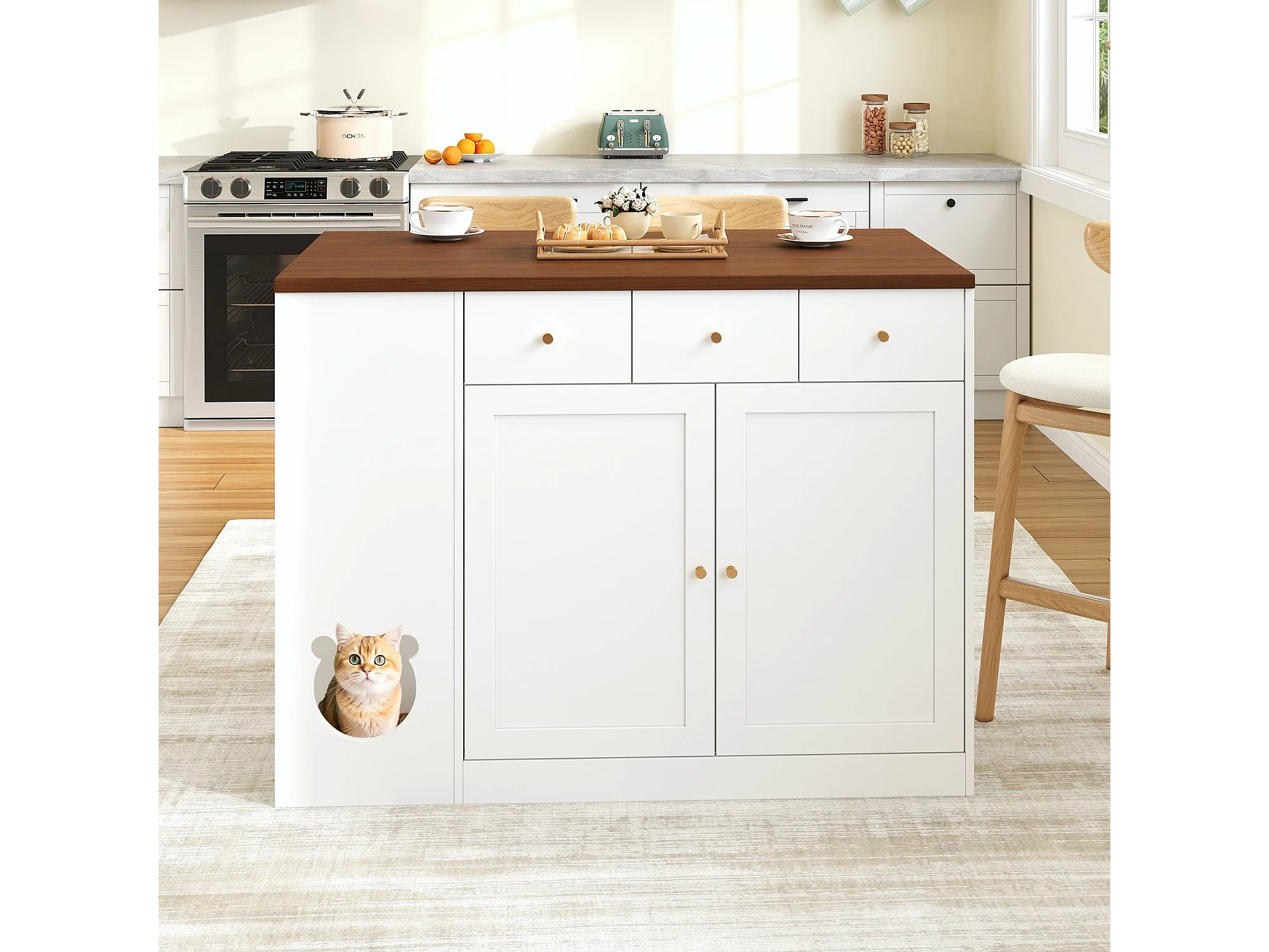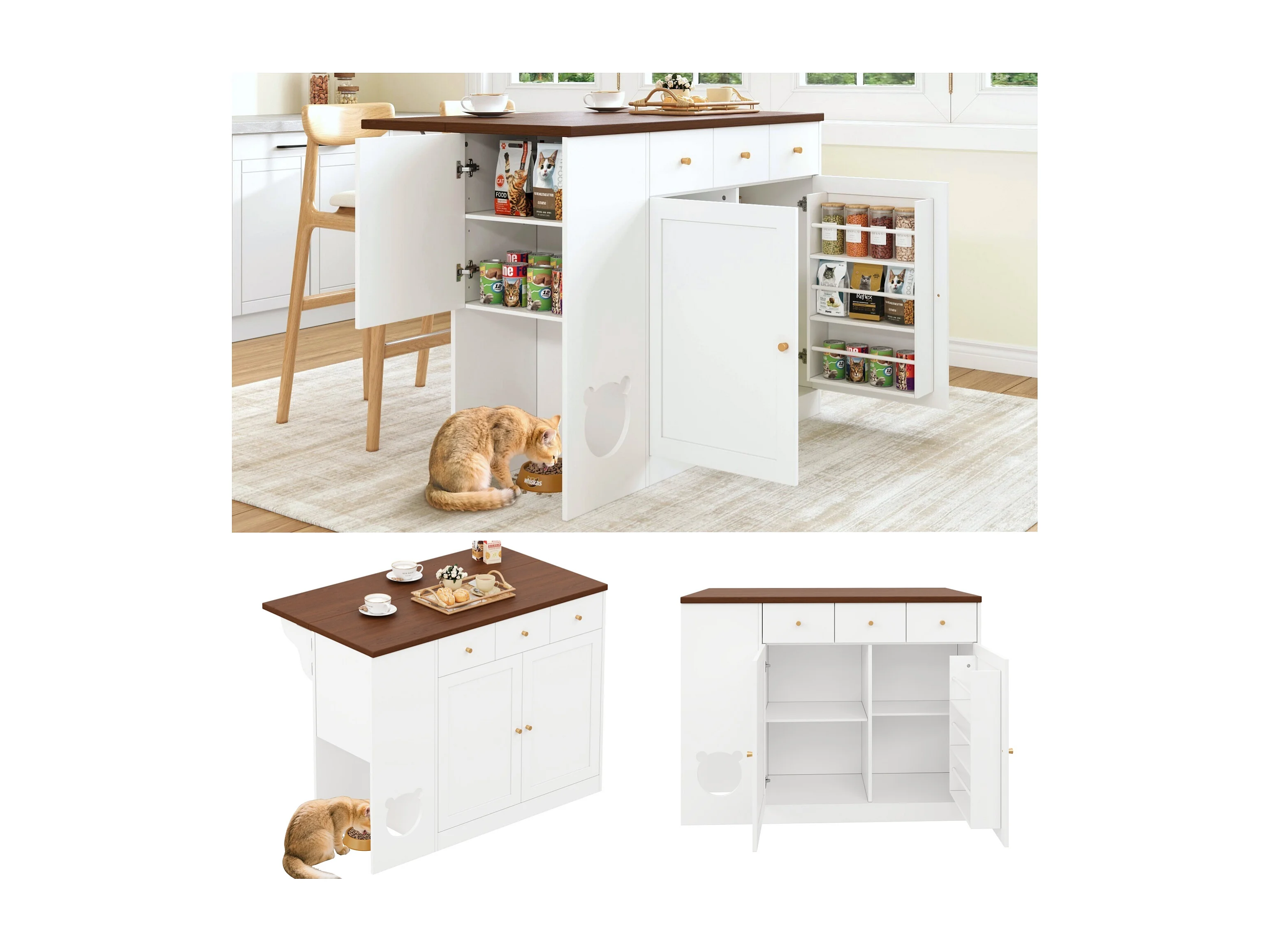 Îlot de cuisine avec 3 portes et 3 tiroirs - Nourrir les animaux - Blanc et noyer