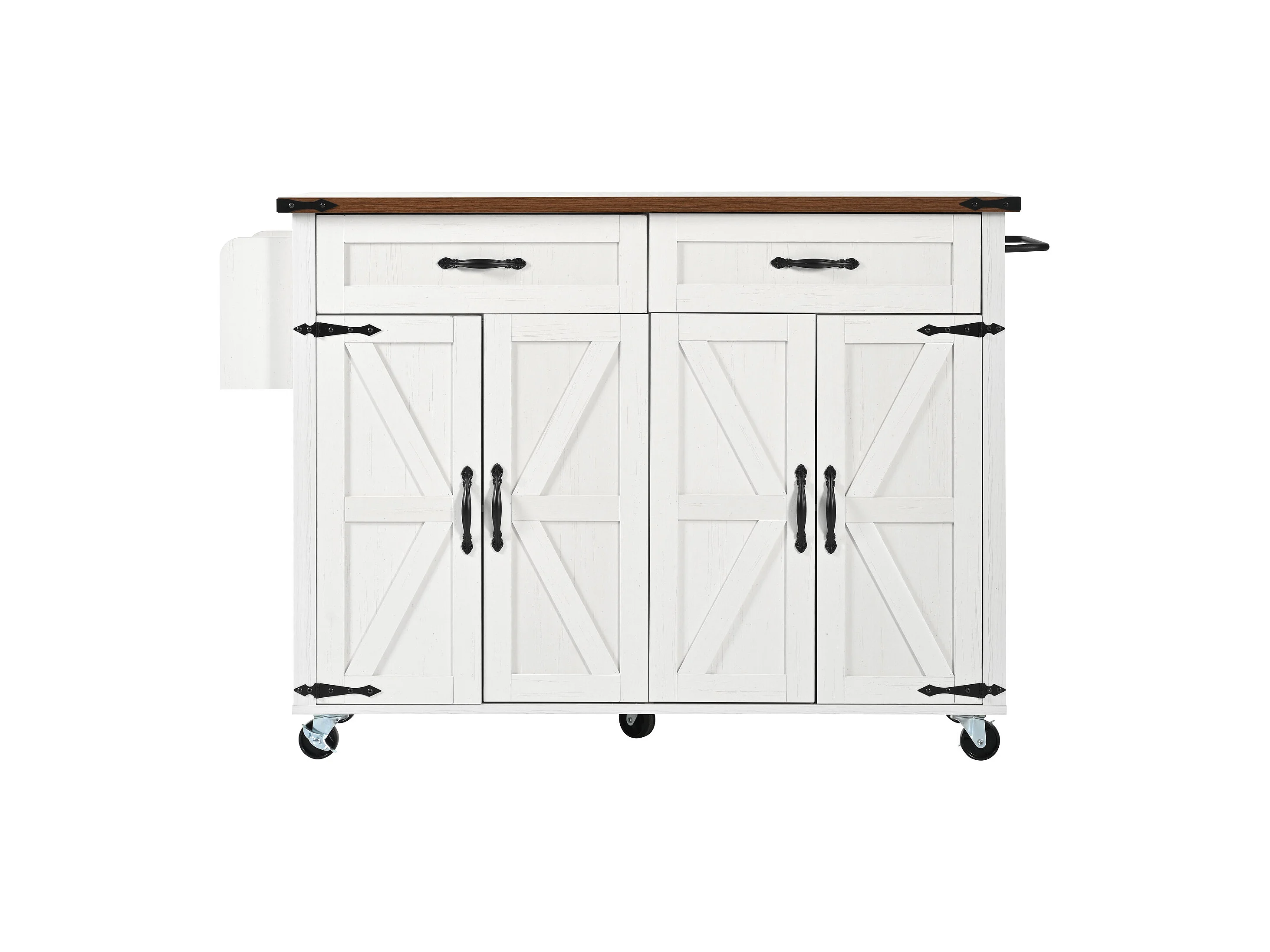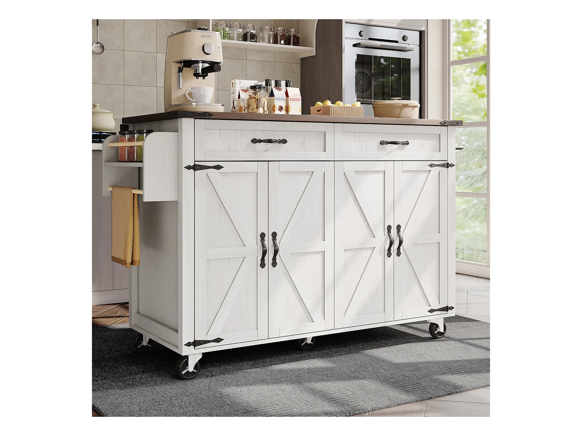Îlot de cuisine avec plan de travail extensible, chariot de service avec 4 portes et 2 tiroirs, MDF beige et bois (140x45x92.5 cm)
