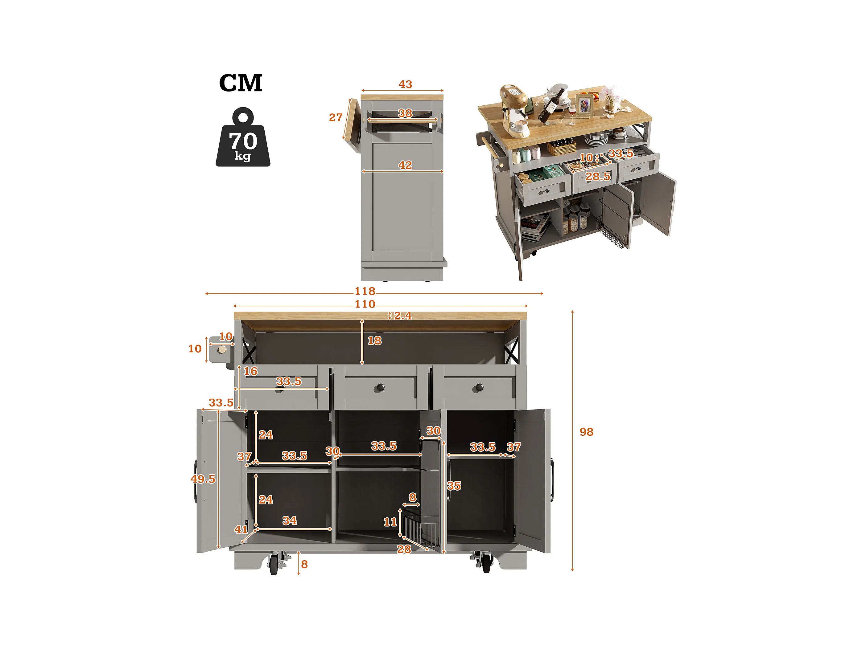 Îlot de cuisine moderne avec rangement multifonction, bois, métal doré, gris, avec roues et séparateurs amovibles (118x43-80x98 cm)