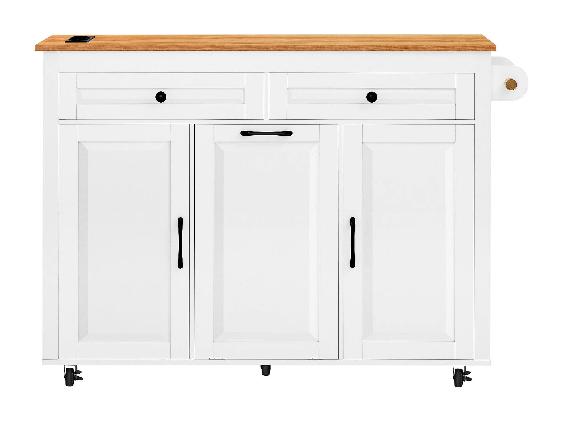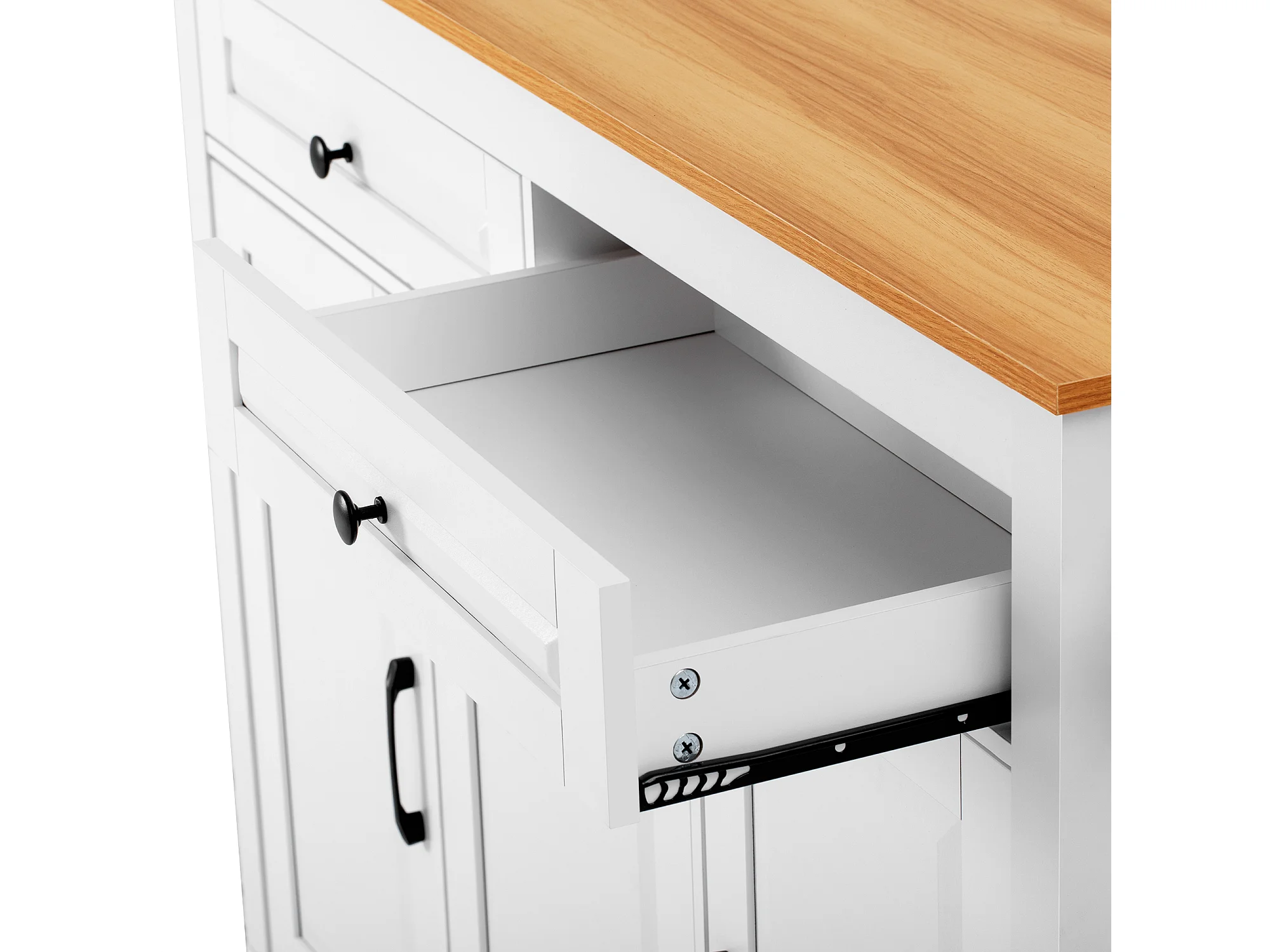 Îlot de cuisine couleur blanc et bois - Avec prise électrique et compartiment poubelle - Plateau télescopique