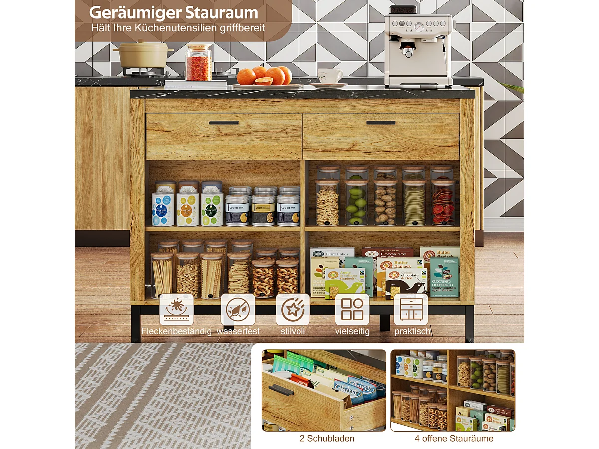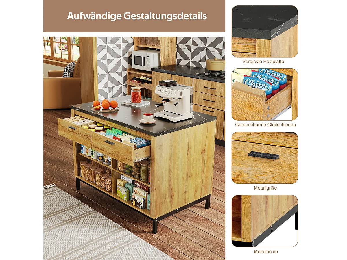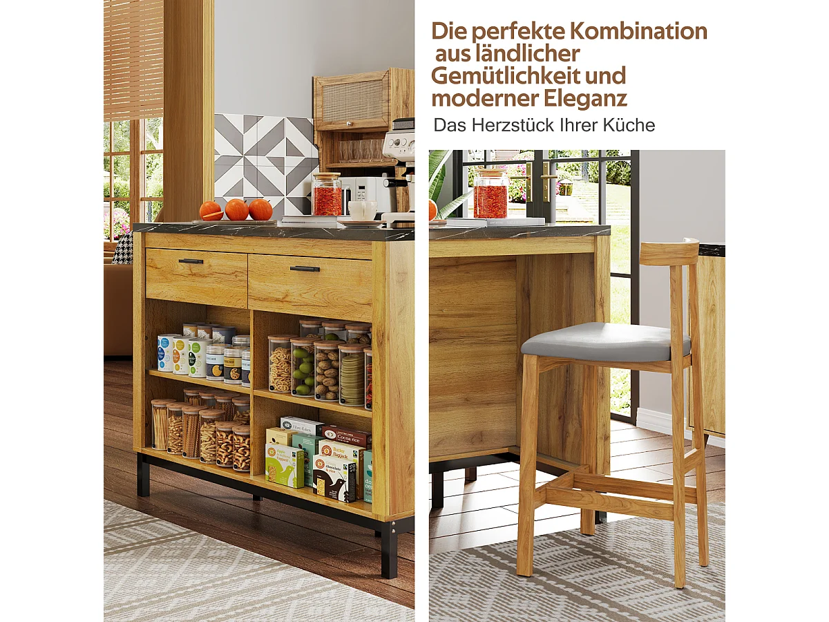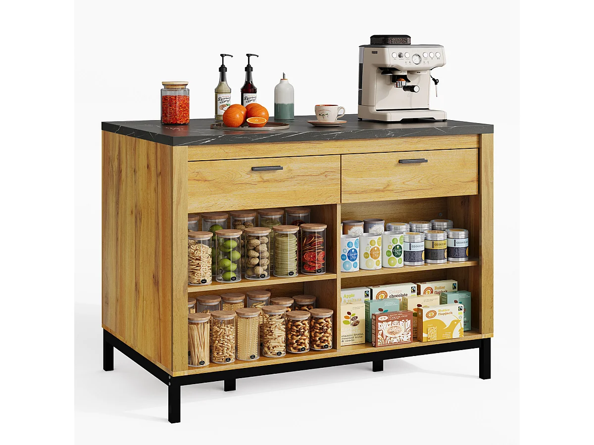 Îlot de cuisine de style campagnard avec 2 tiroirs, 4 étagères, plateau en marbre (120×75×90cm)