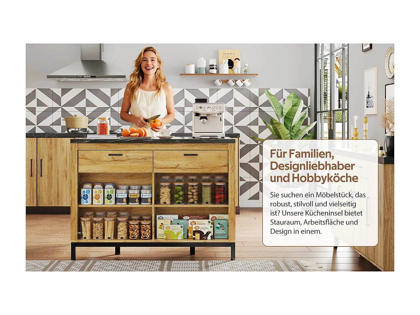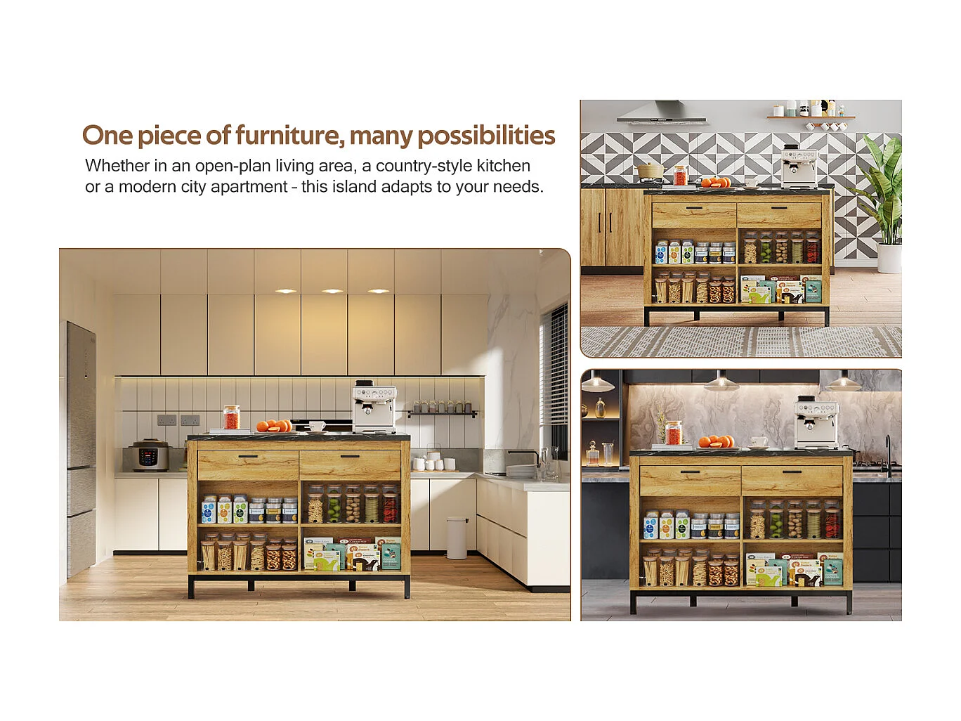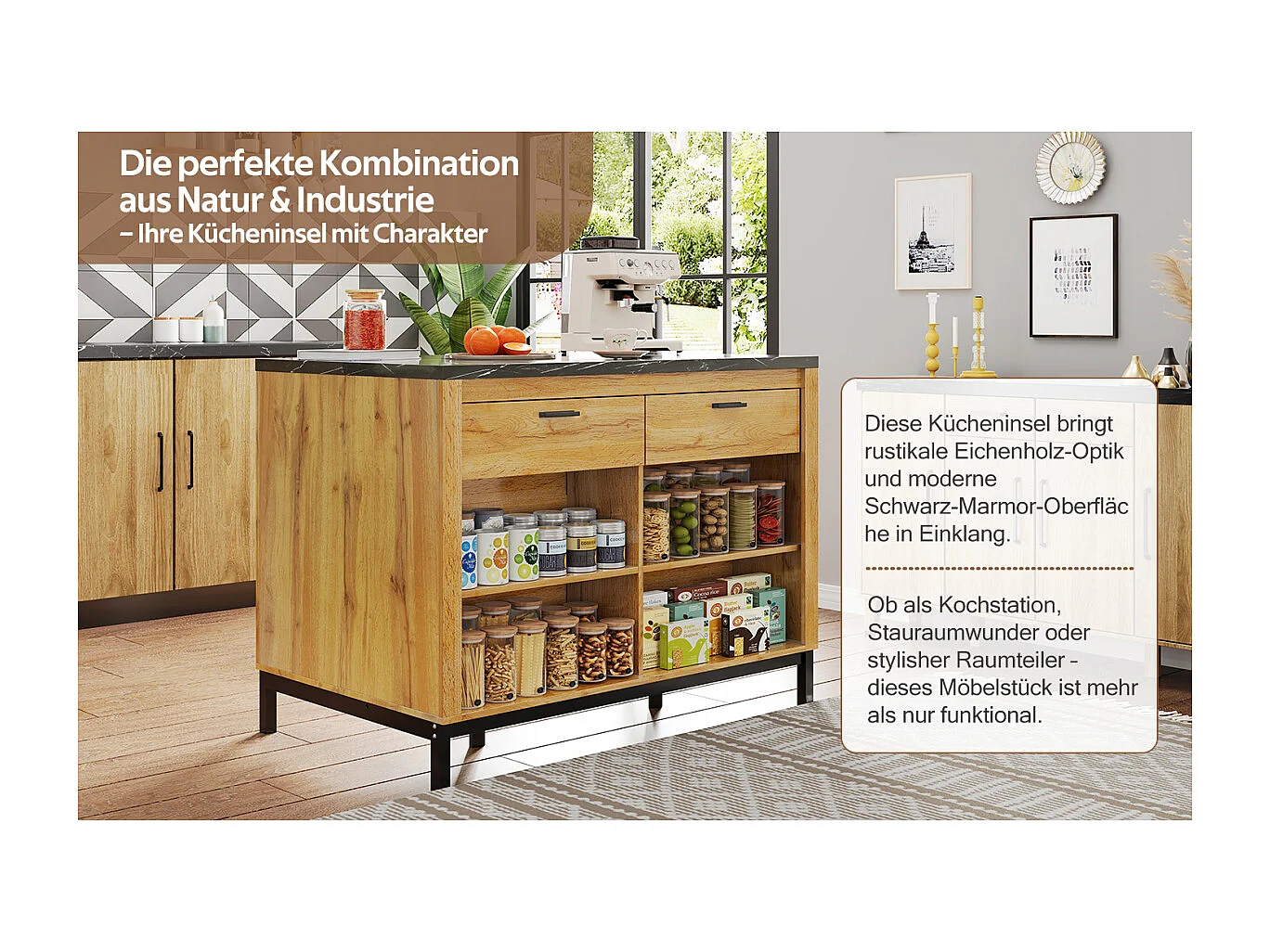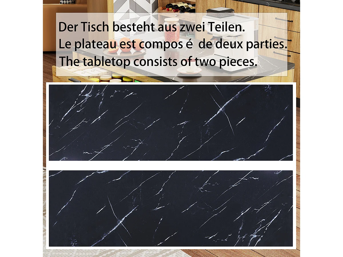 Îlot de cuisine de style campagnard avec 2 tiroirs, 4 étagères, plateau en marbre (120×75×90cm)