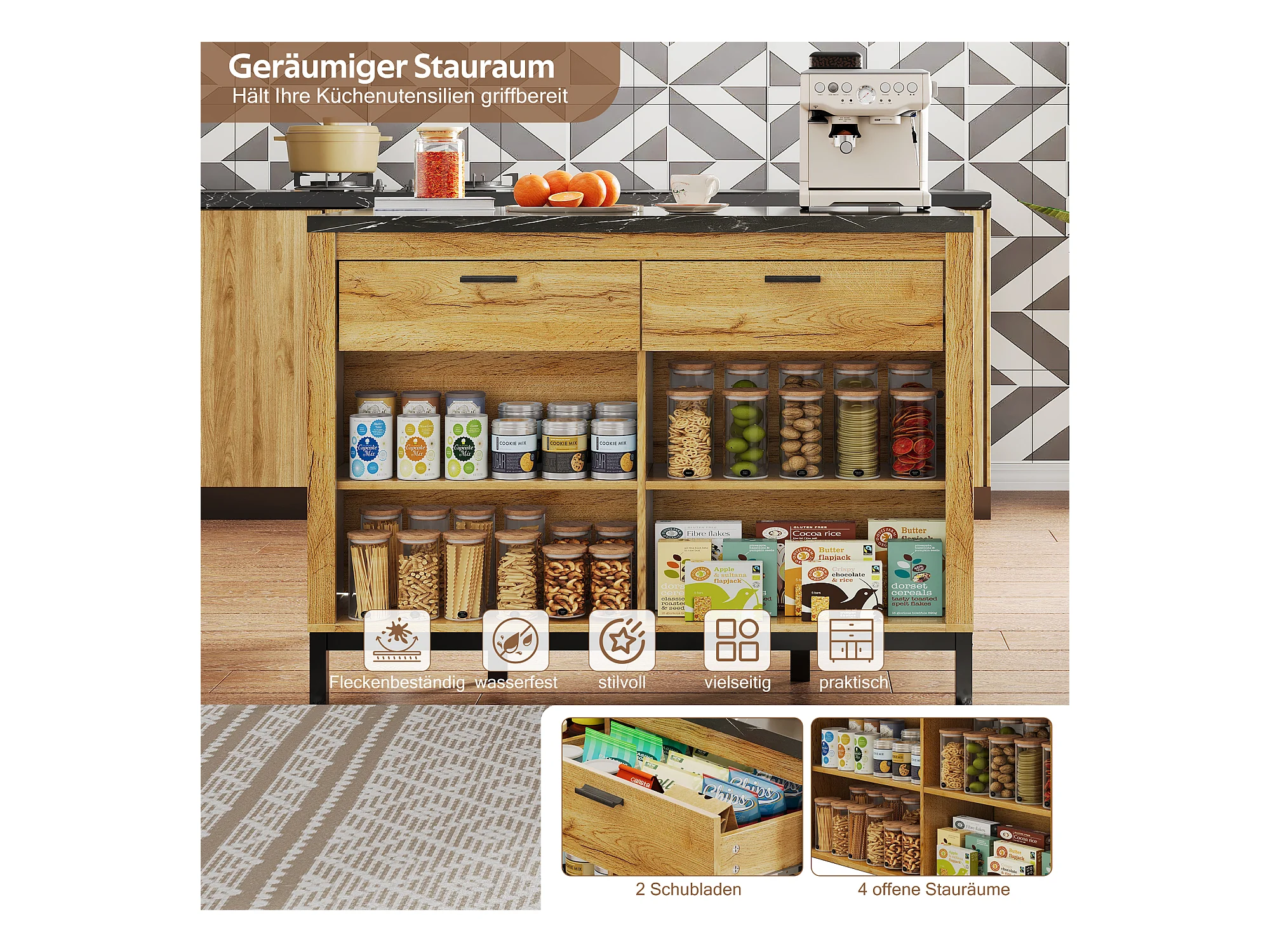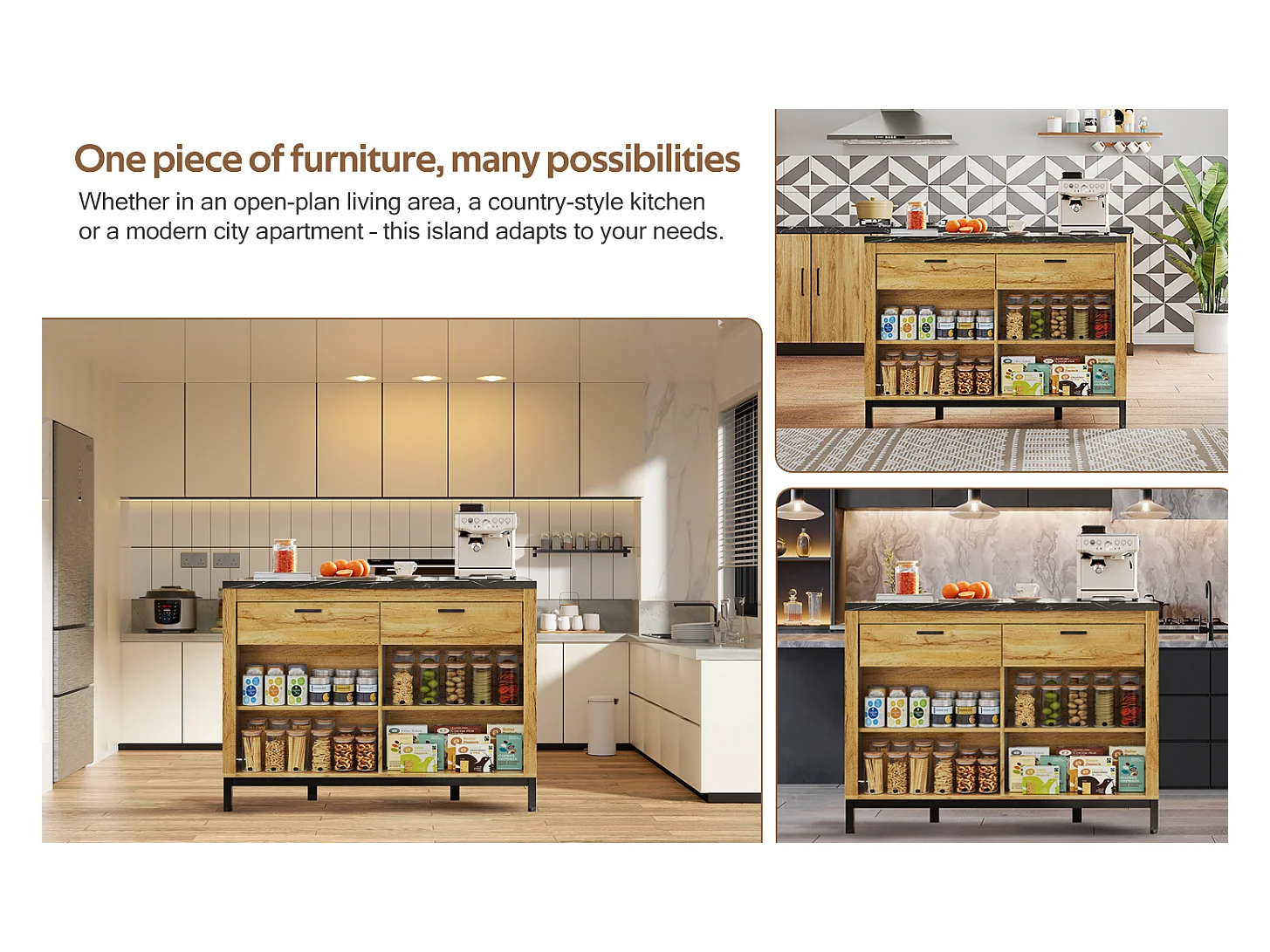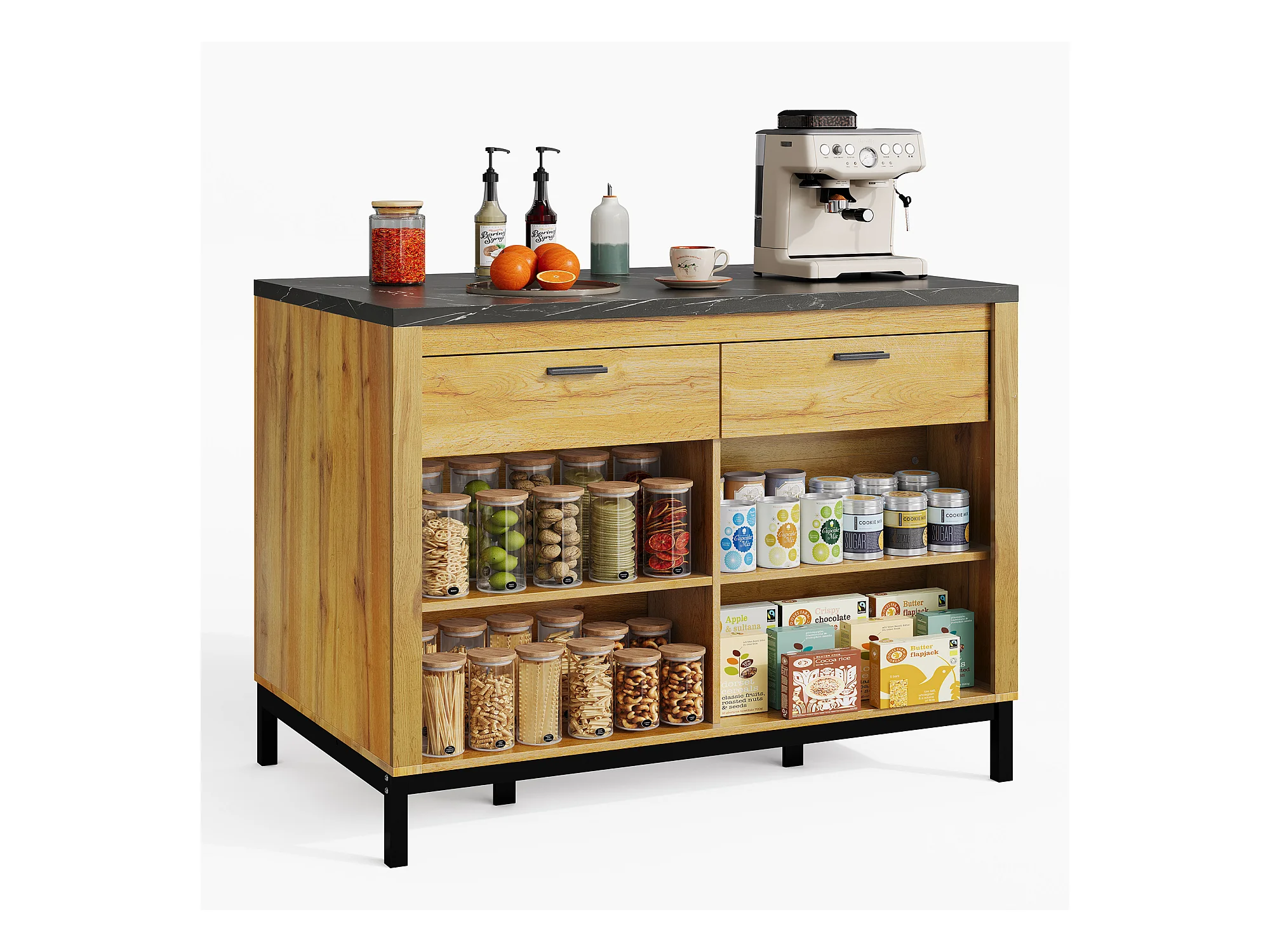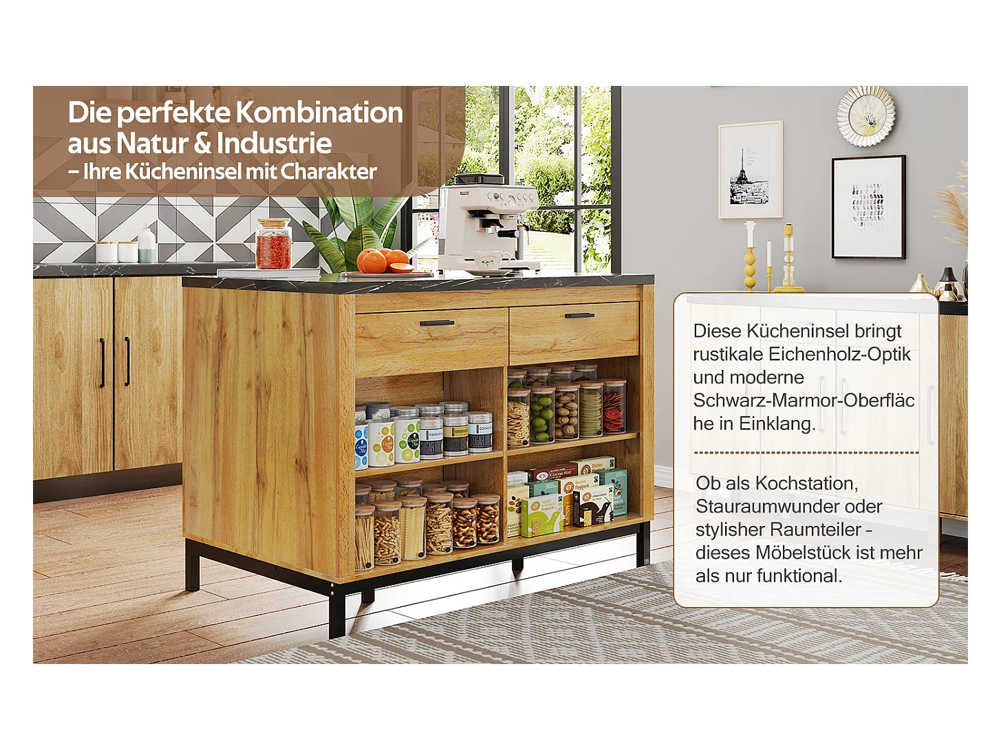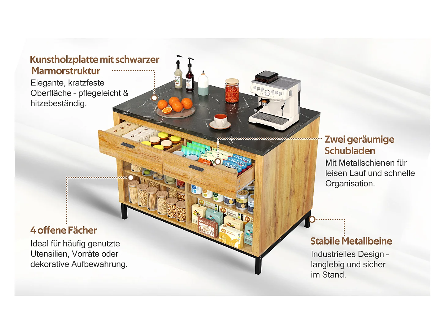 Îlot de cuisine en style campagne, avec 2 tiroirs, 4 étagères ouvertes et plan de travail en marbre noir, bois et métal doré (120x75x90 cm)