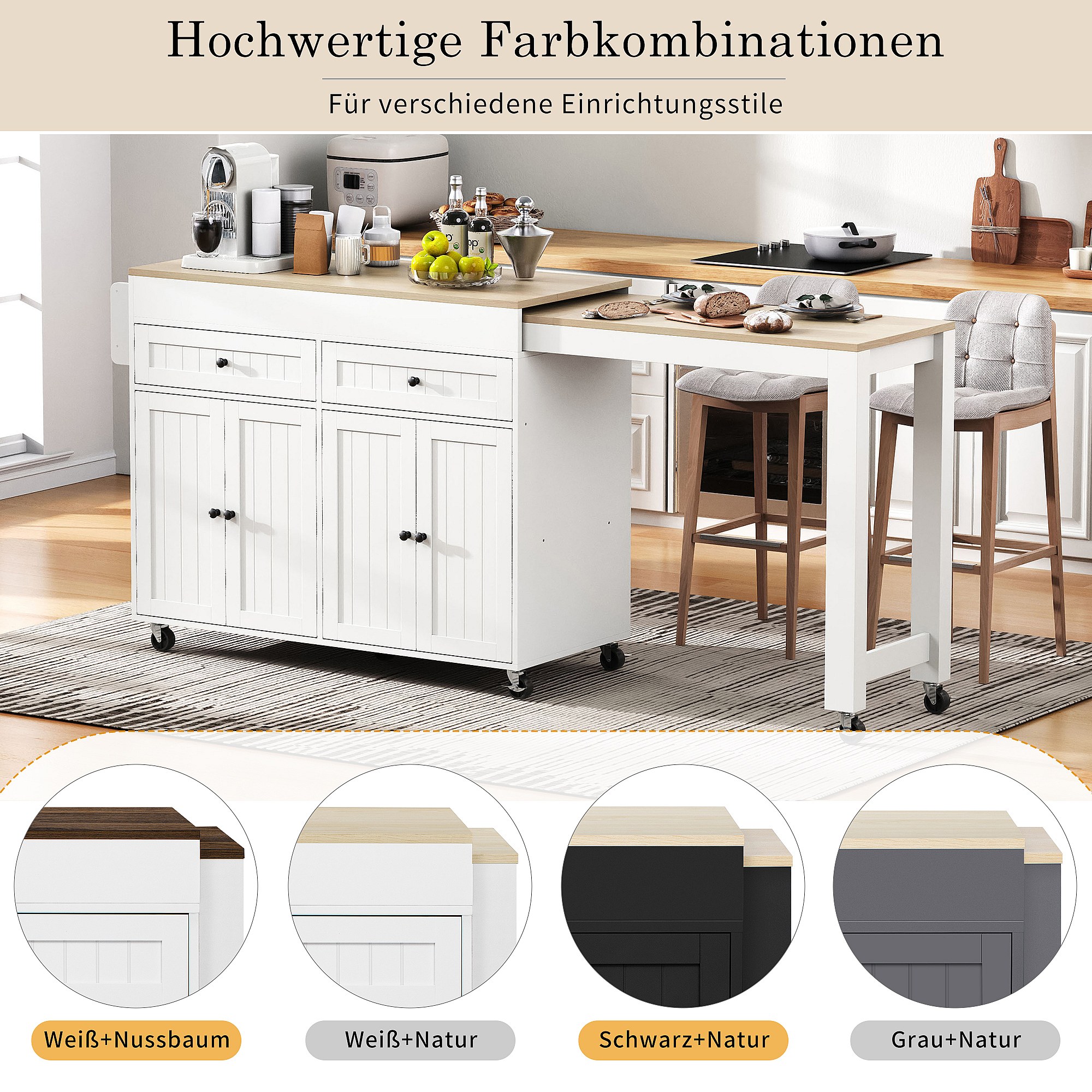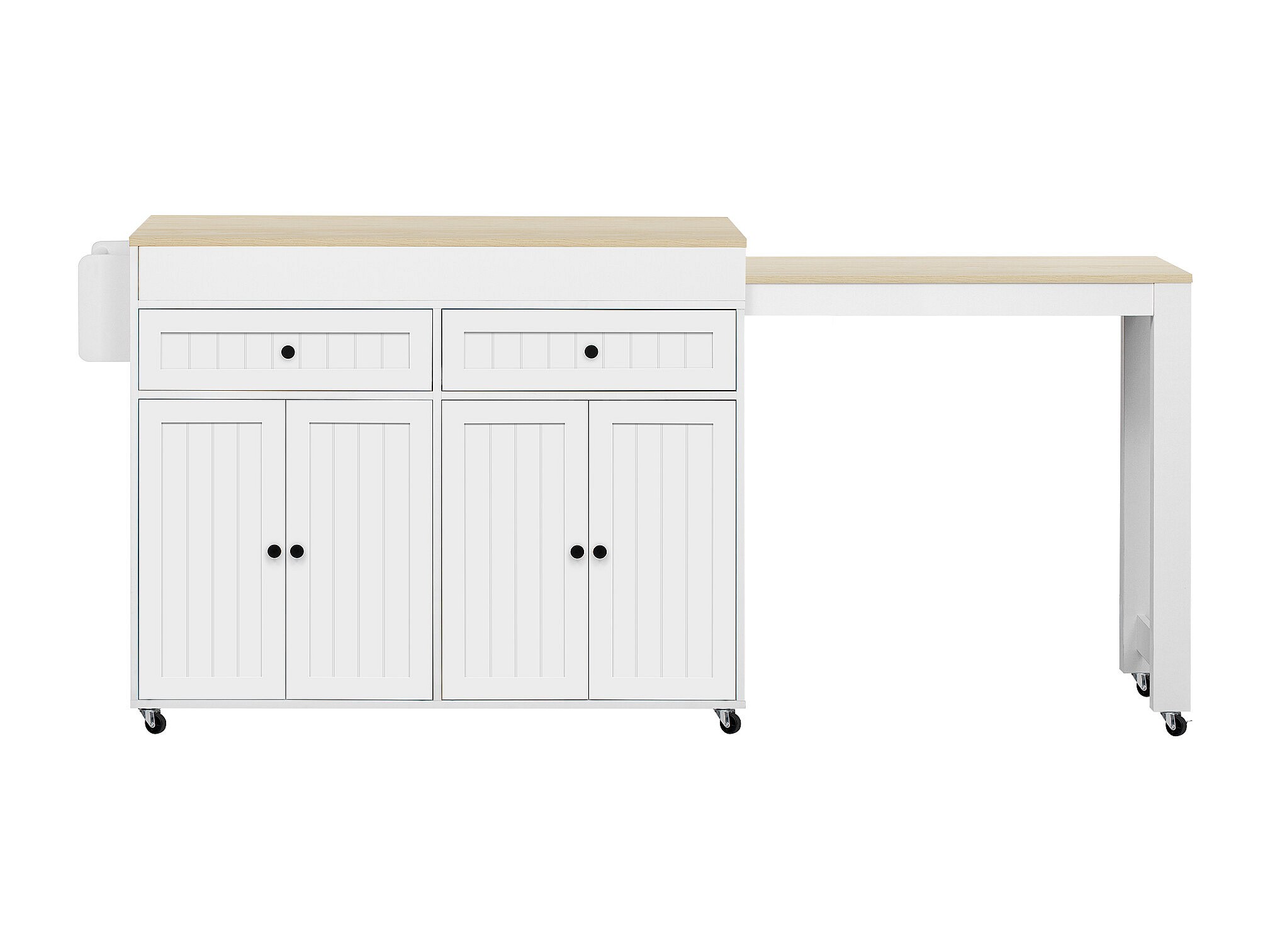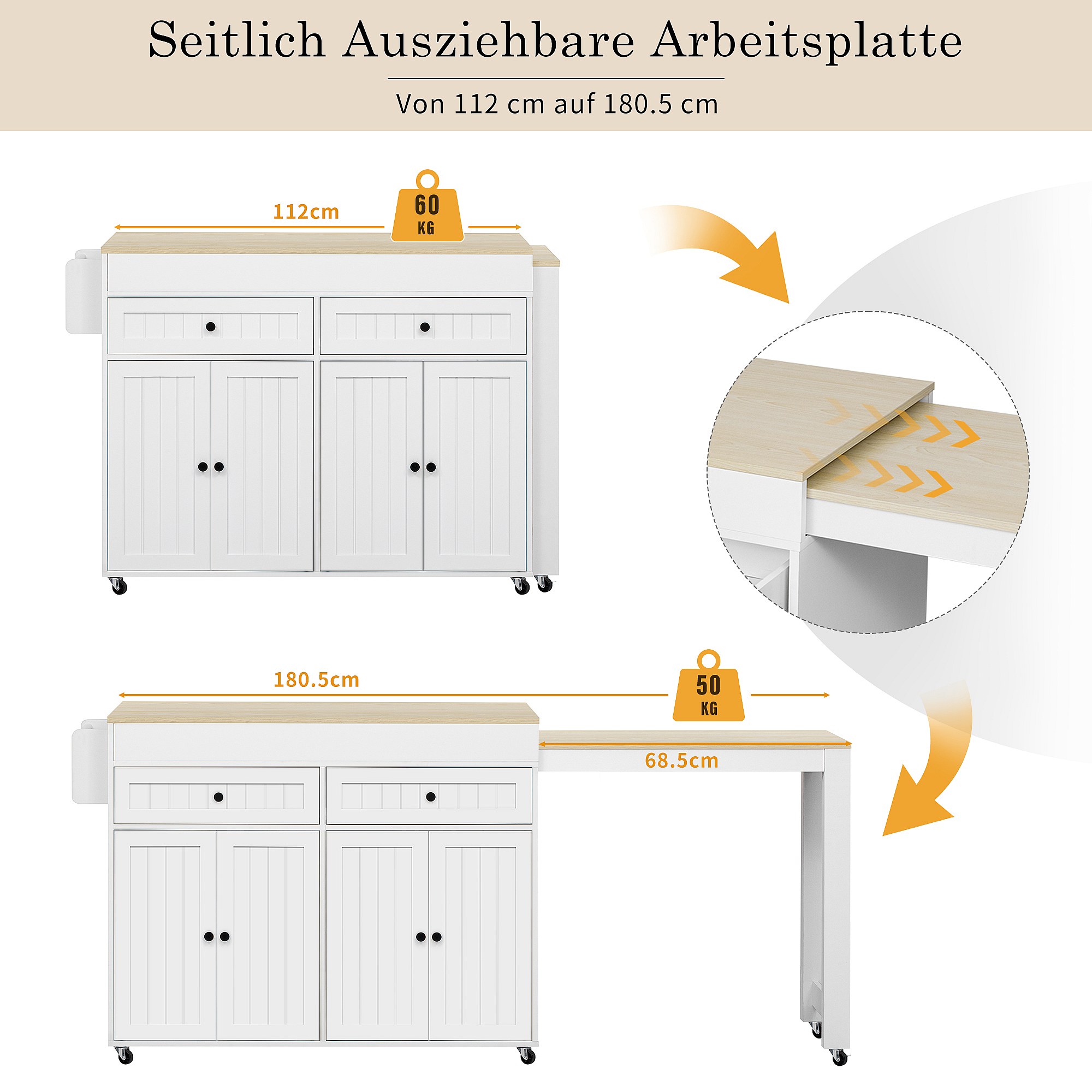 Îlot de cuisine mobile avec plan de travail extensible, tiroirs, MDF, blanc et naturel (180.5x45x92.2 cm)