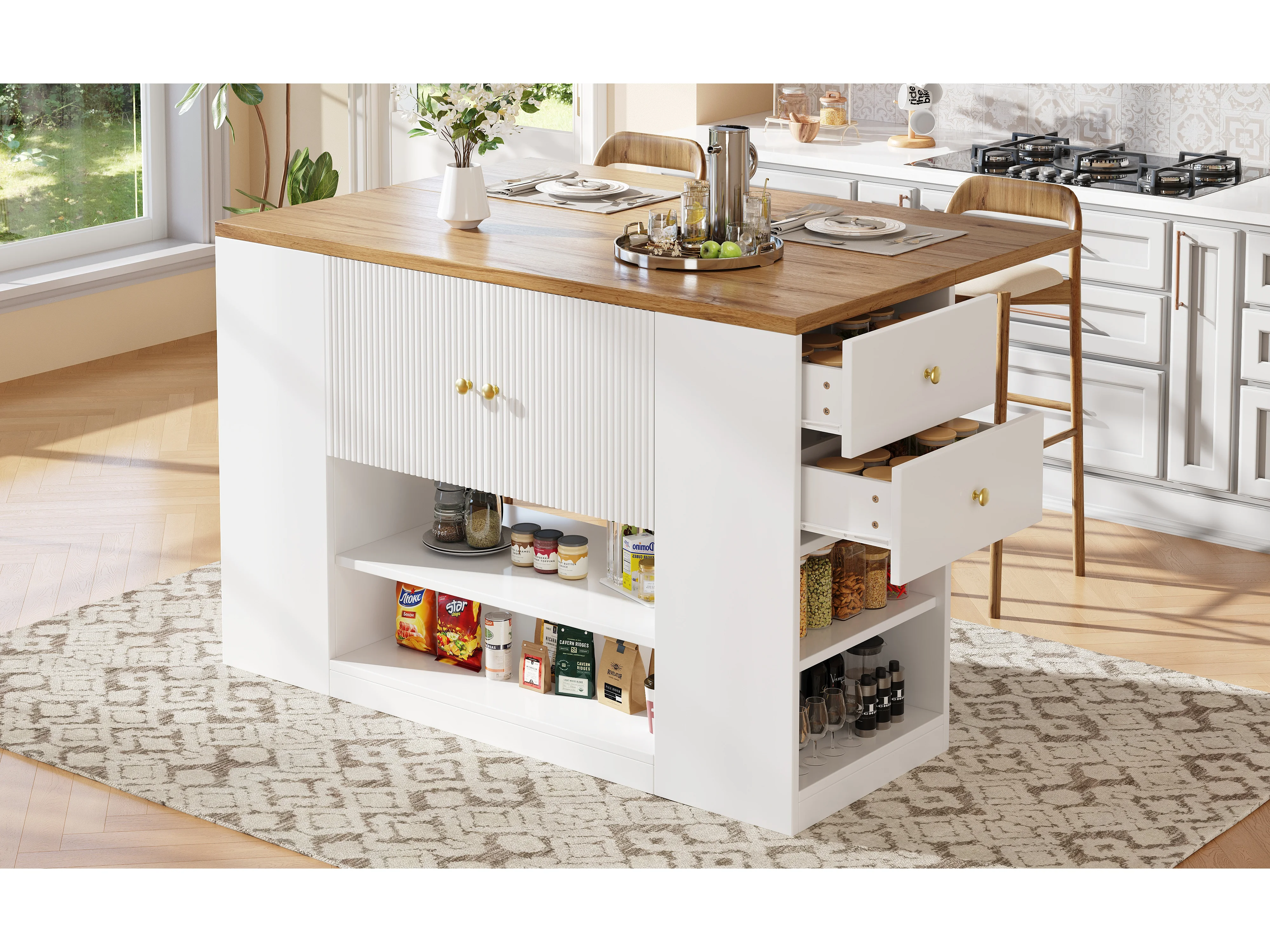 Îlot central moderne - 134 x 45.2/ 75 x 89 cm - avec roulettes + 2 portes + 2 tiroirs - MDF + Métal - blanc