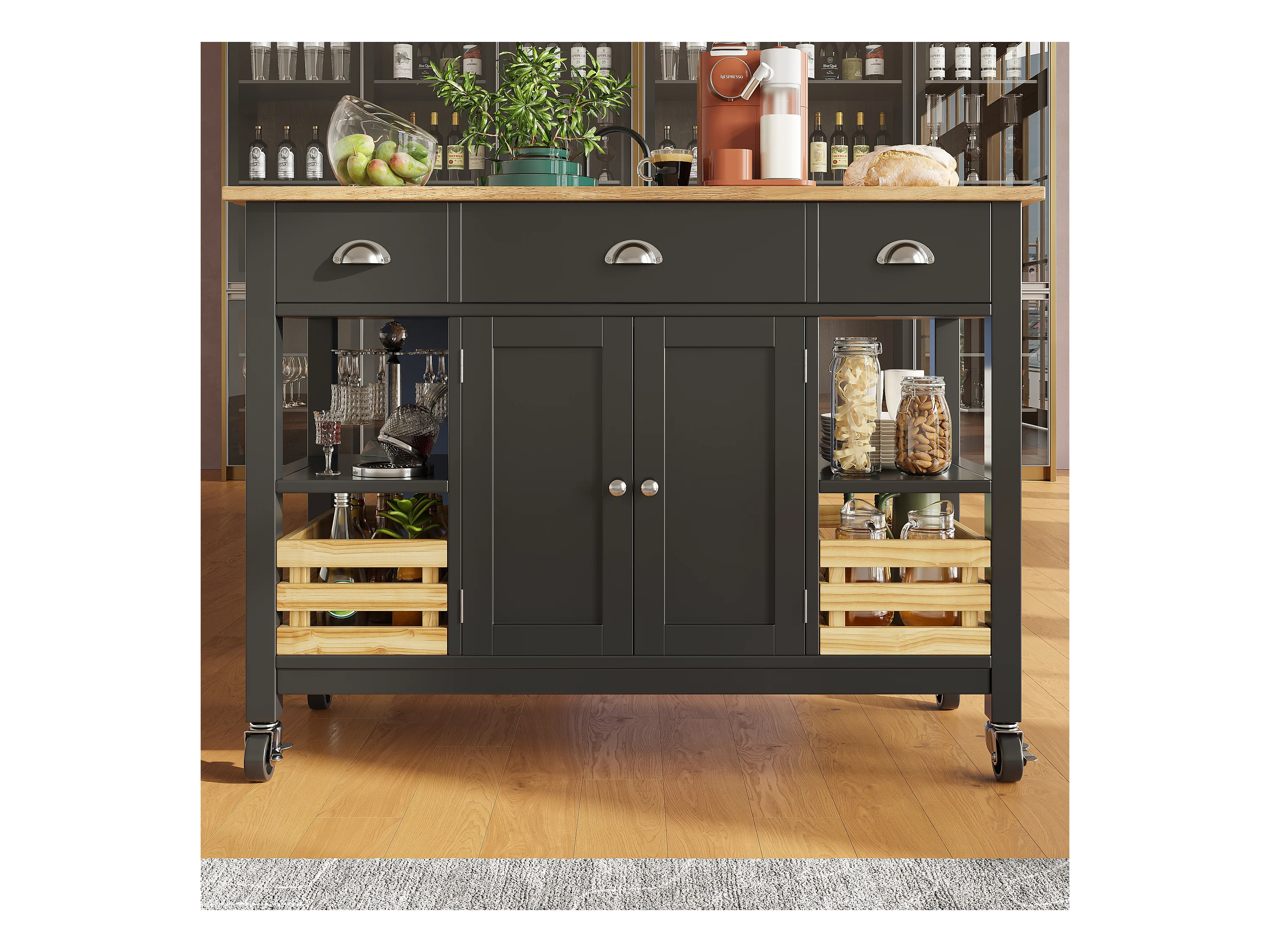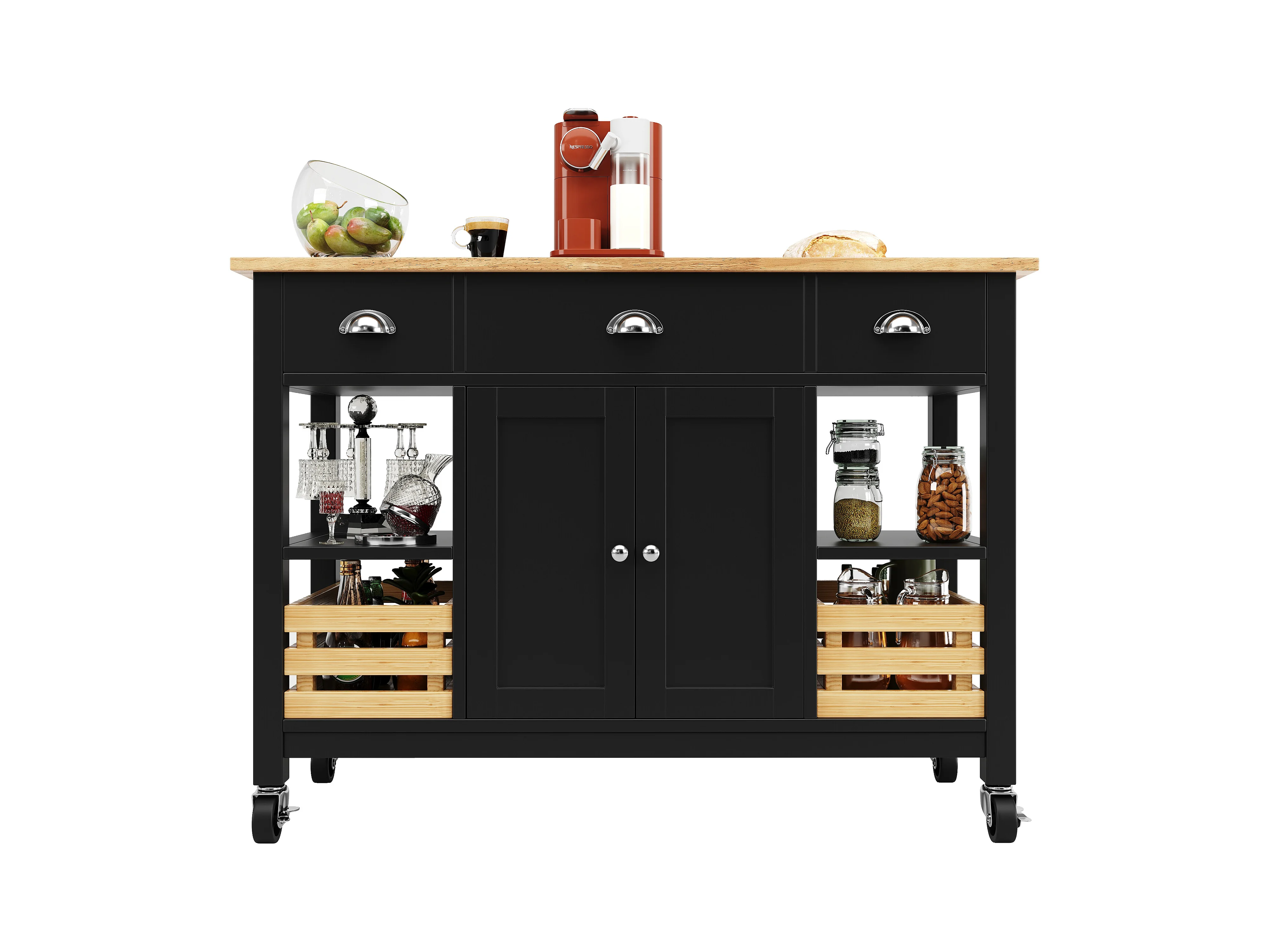 Îlot de cuisine avec plan de travail, cloisons amovibles, roulettes et porte-serviettes latéral, bois naturel, noir (135x46x86.6 cm)