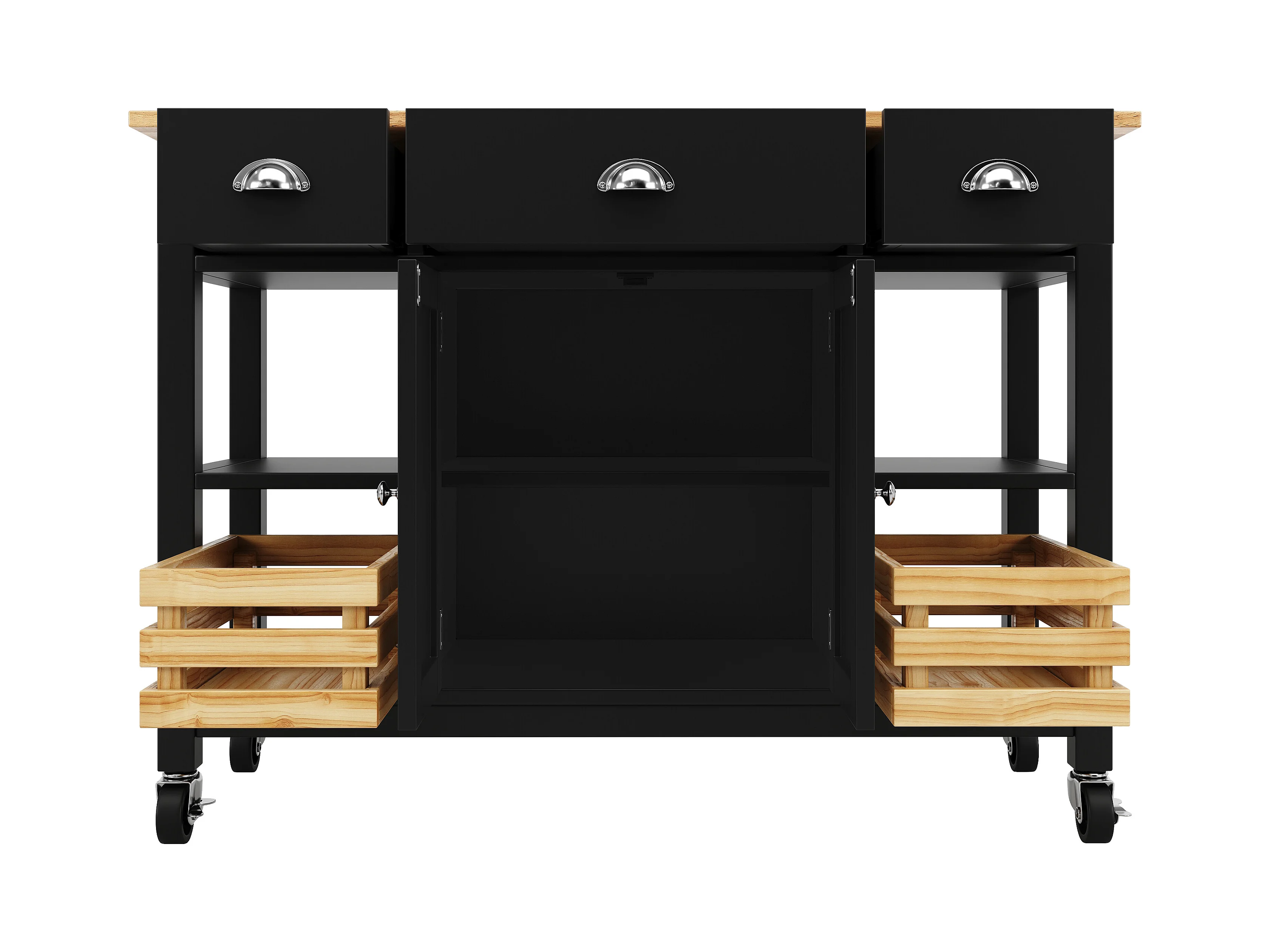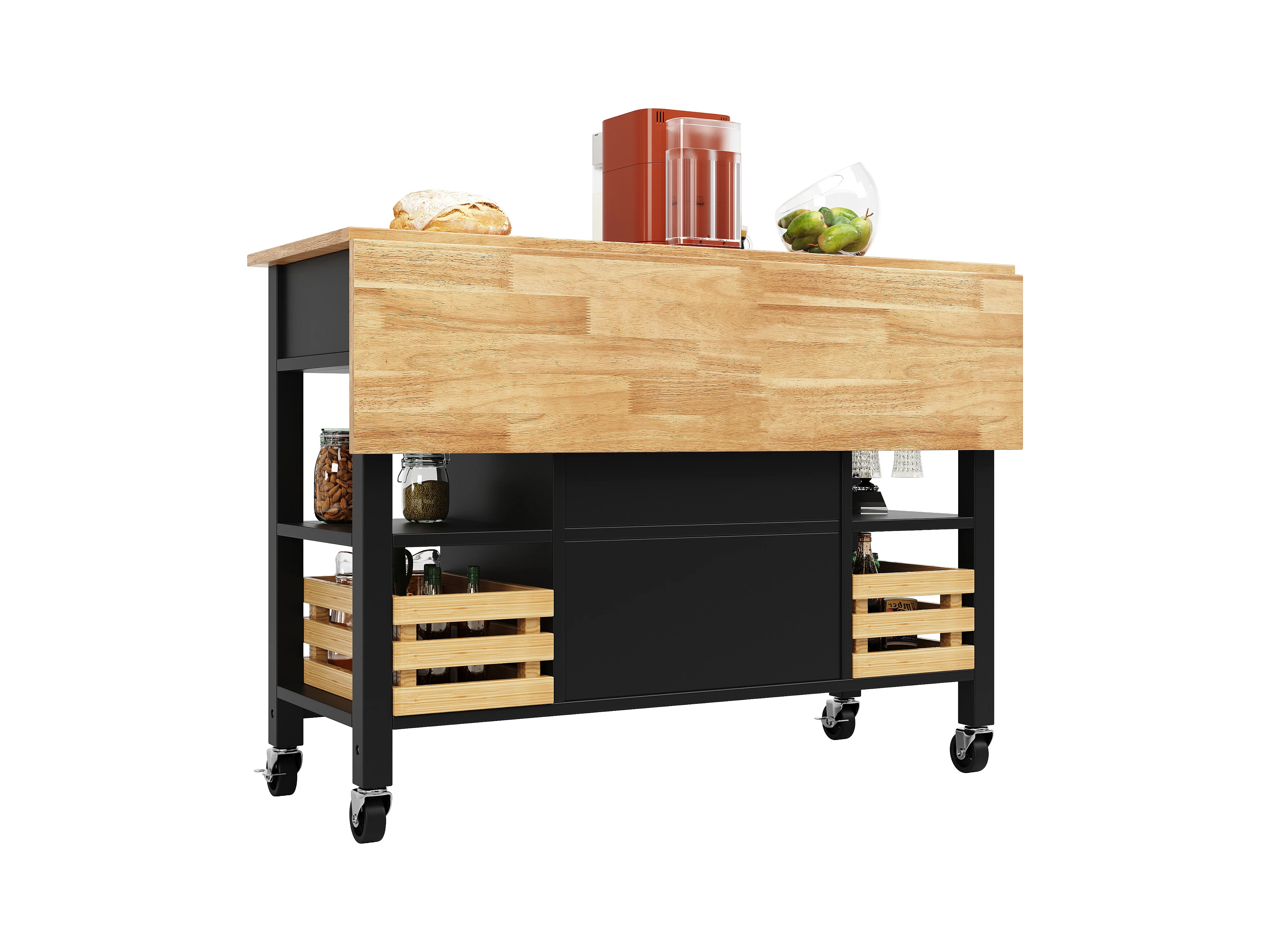 Îlot de cuisine moderne avec plateaux pliables, rangement multifonction, MDF, noir et bois naturel (120x30x90 cm)