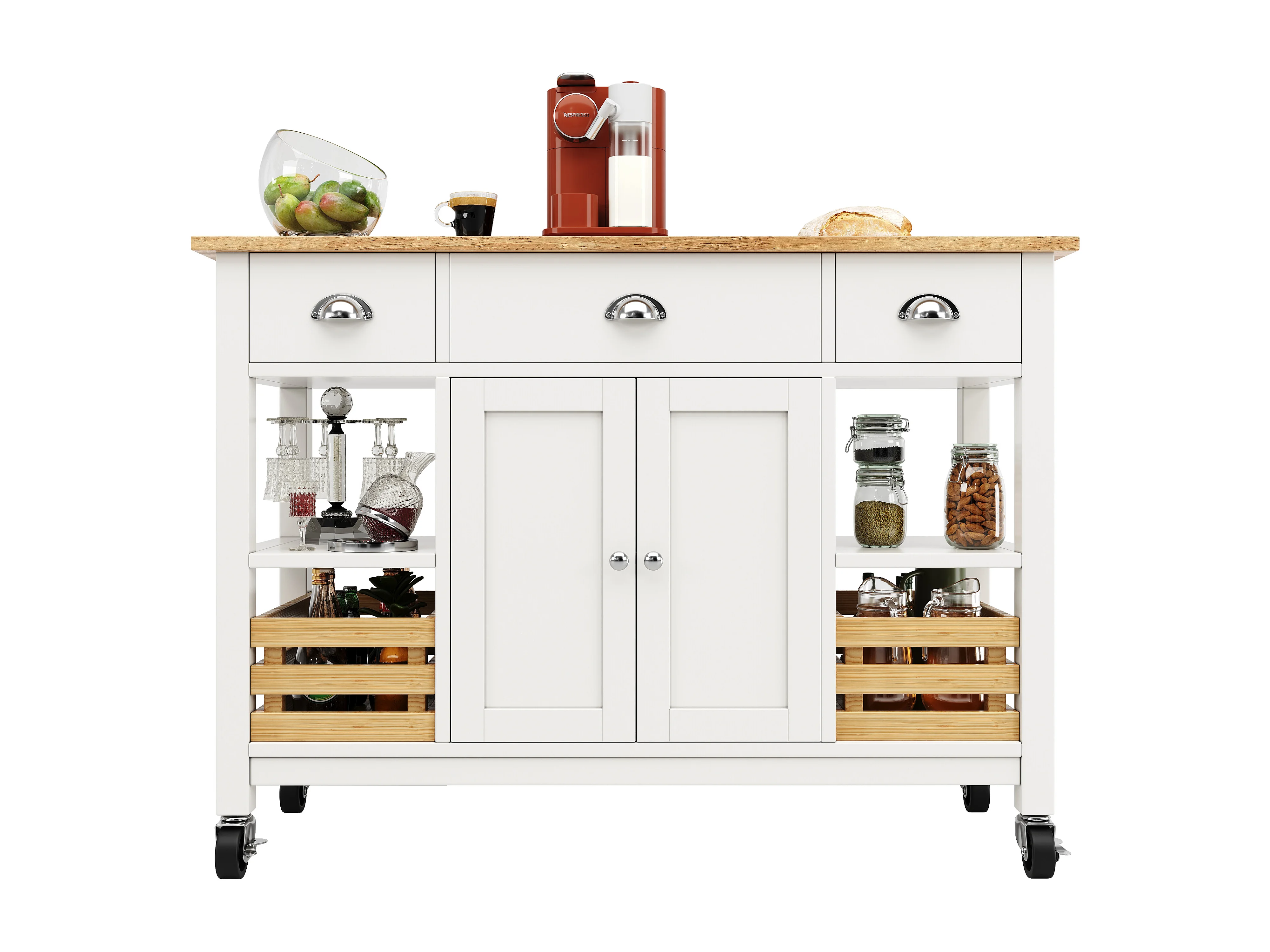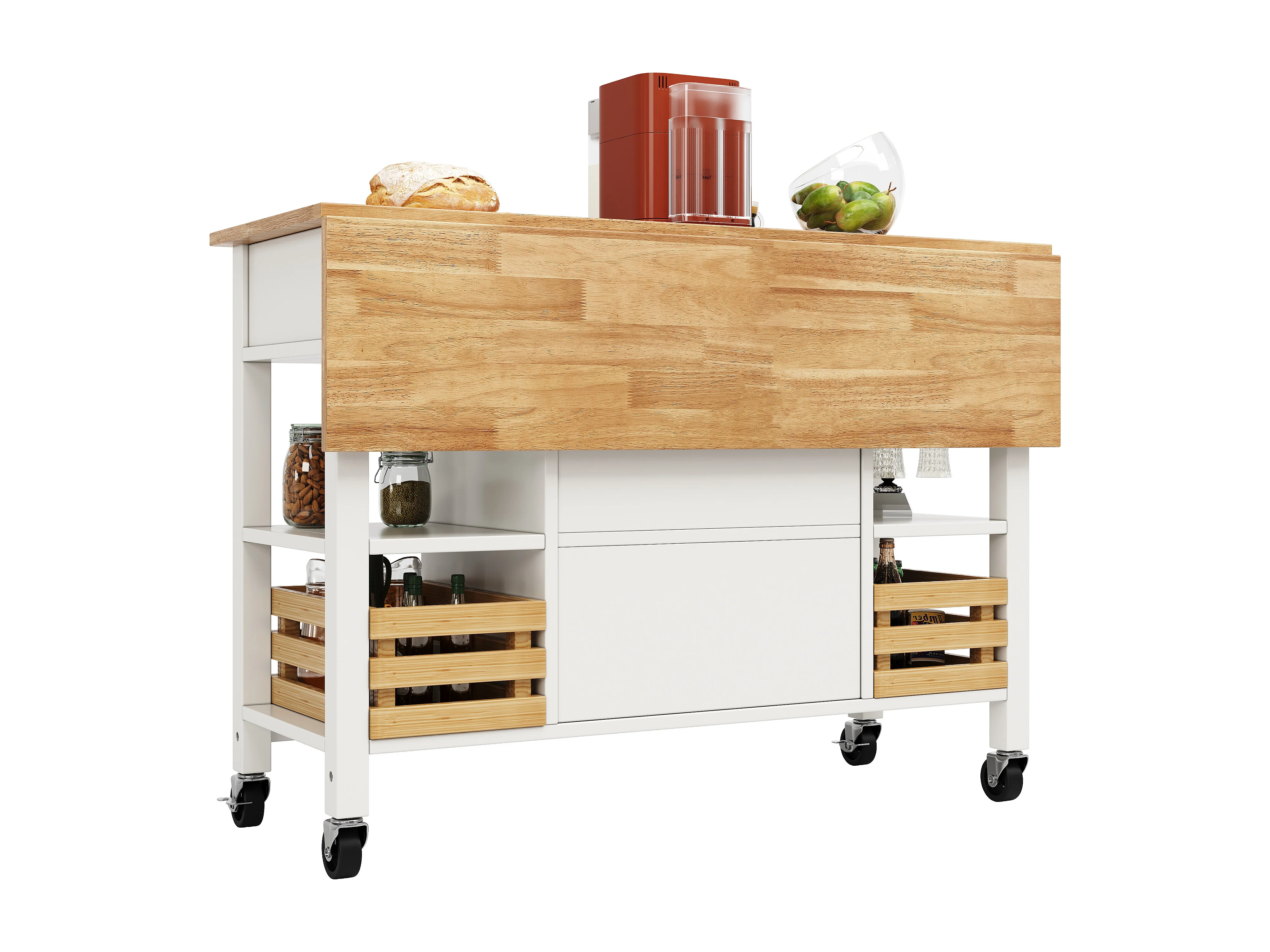 Îlot de cuisine avec plan de travail, compartiments réglables, roulettes amovibles, porte-serviettes latéral, bois naturel, blanc (135x46x86.6 cm)