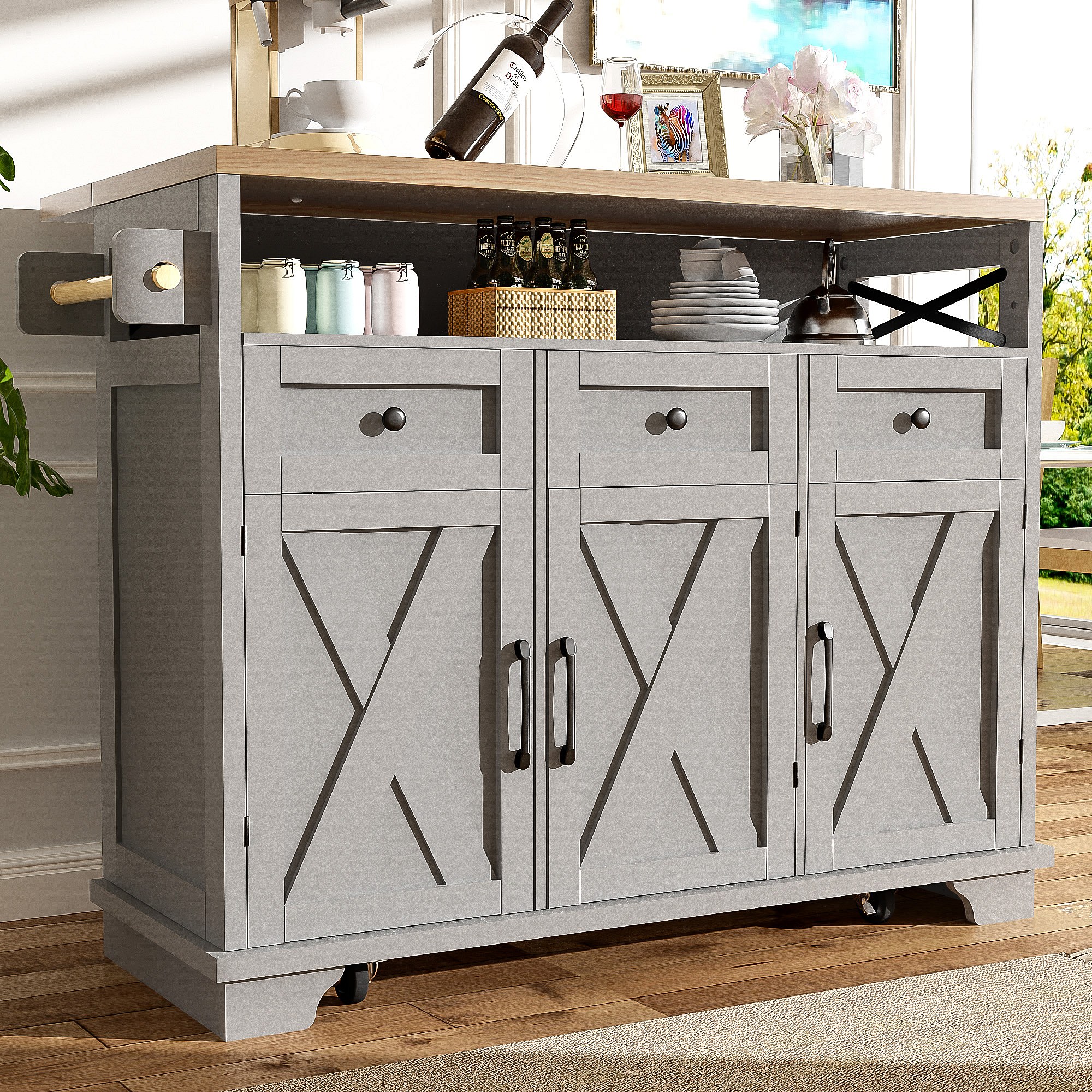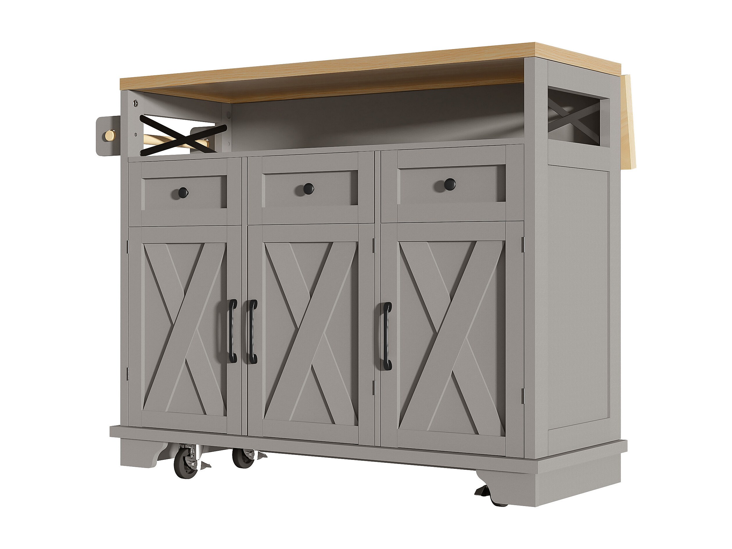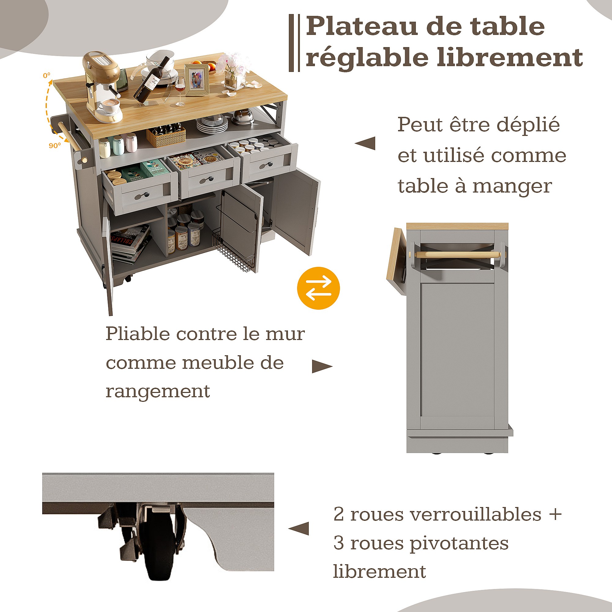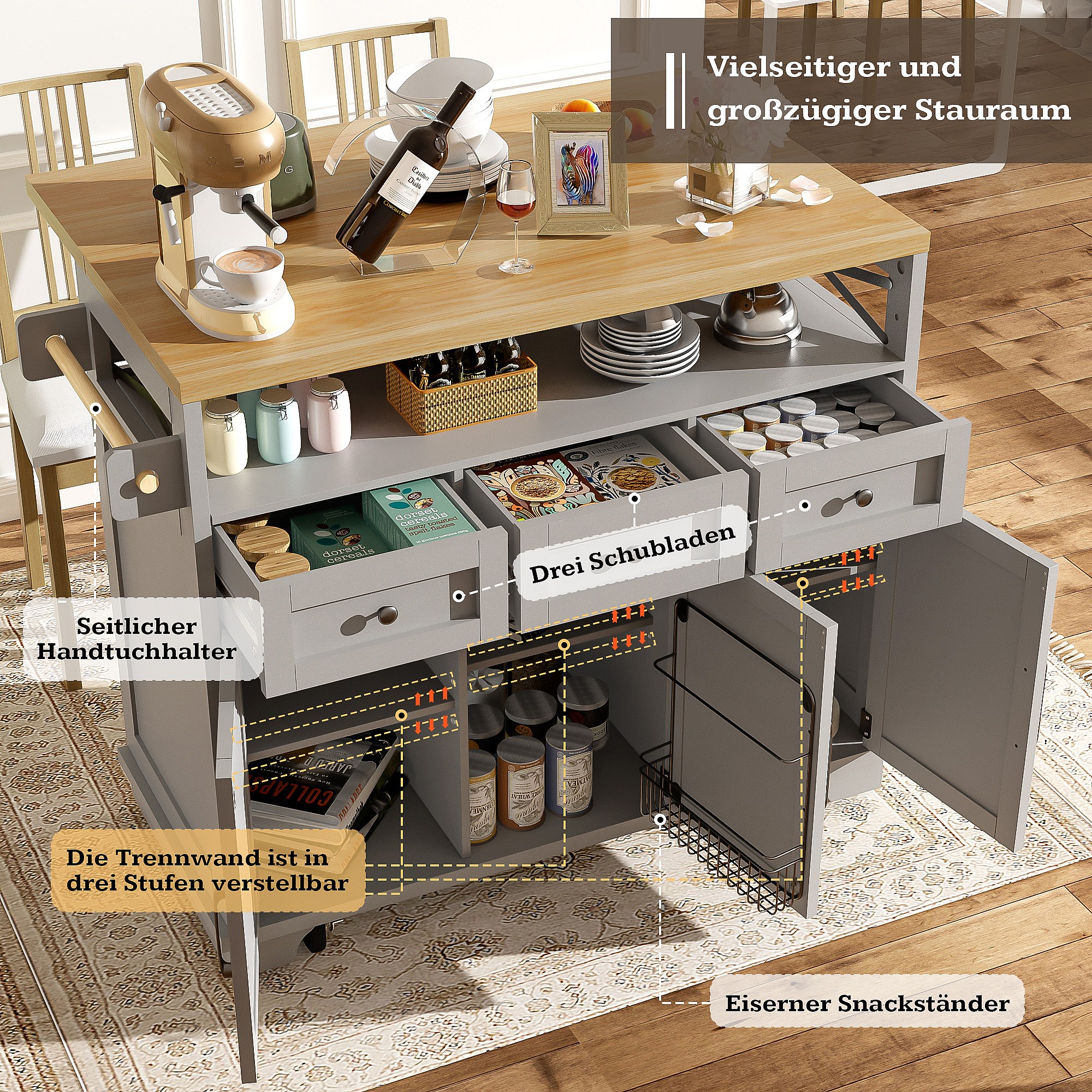 Îlot de cuisine moderne avec rangement multifonction, bois, métal doré, gris, avec roues et séparateurs amovibles (118x43-80x98 cm)