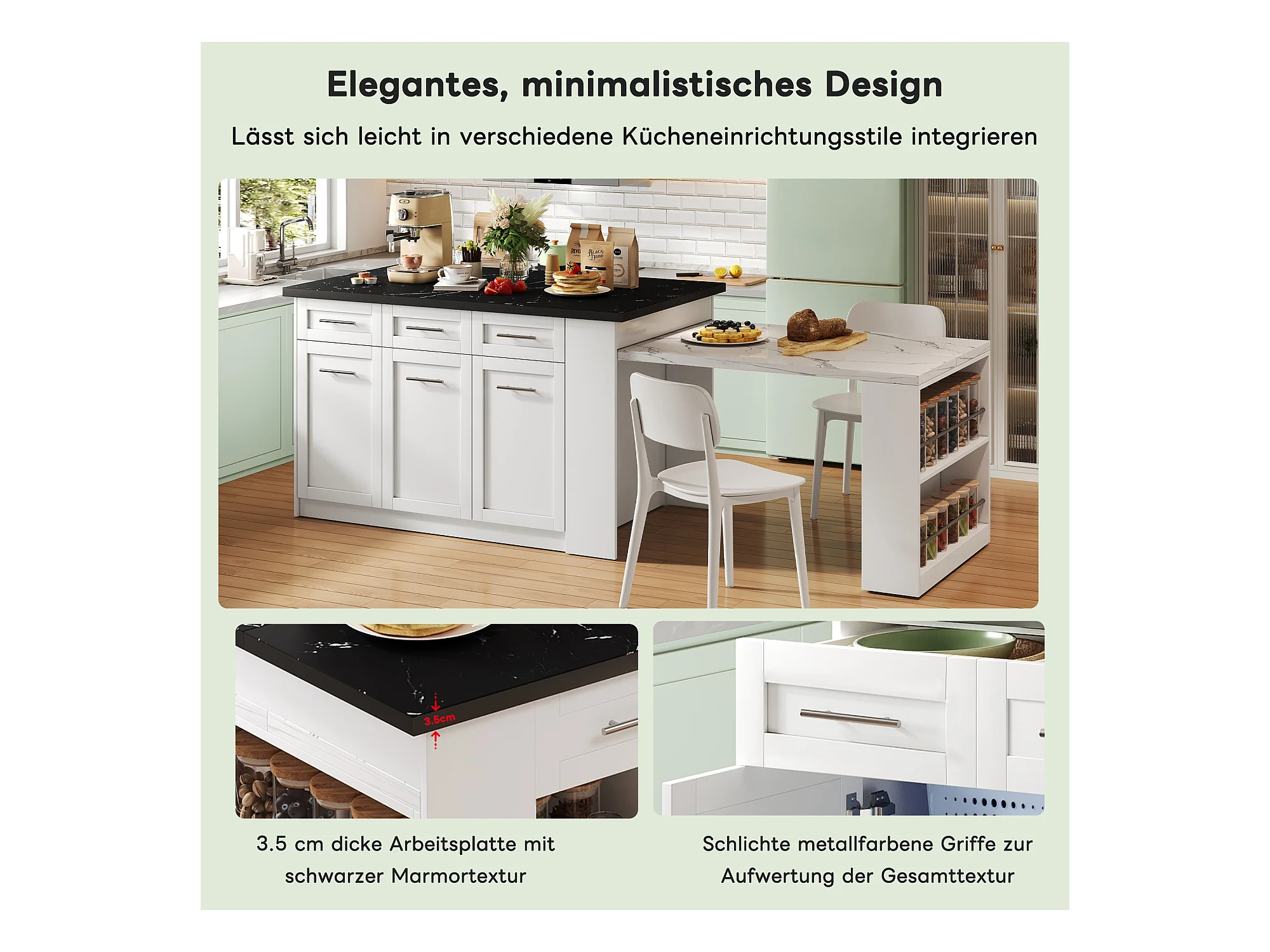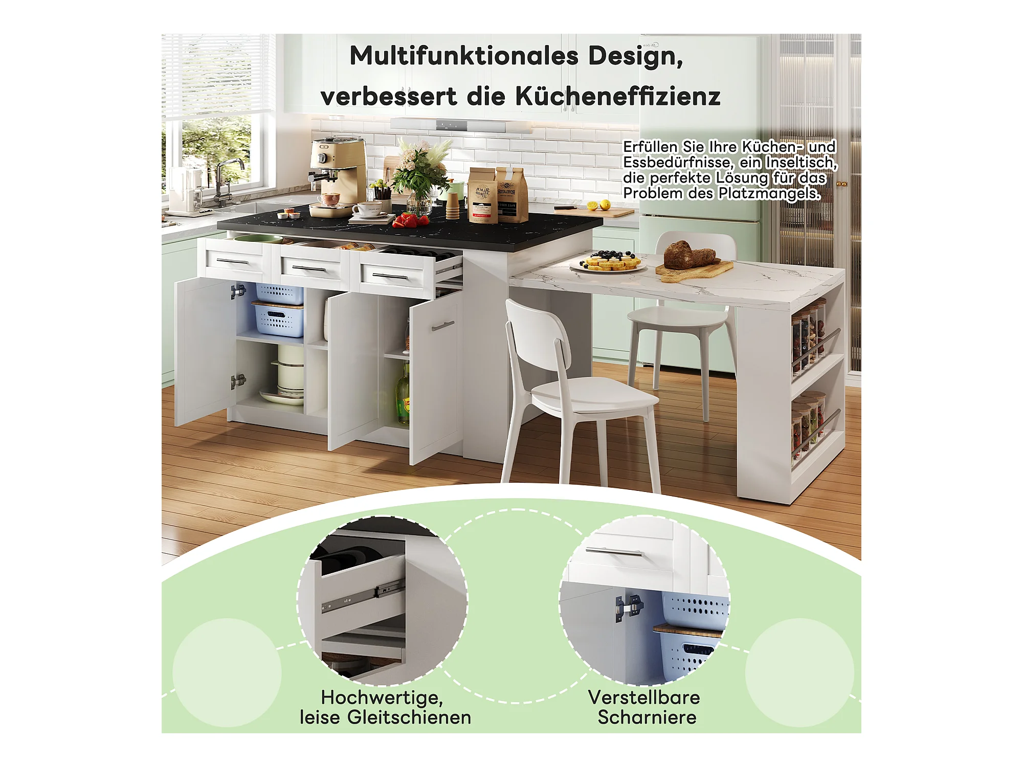 Îlot de cuisine moderne avec table escamotable, MDF, blanc, avec 3 tiroirs et 3 compartiments (97.79x51.56x18.42 cm)