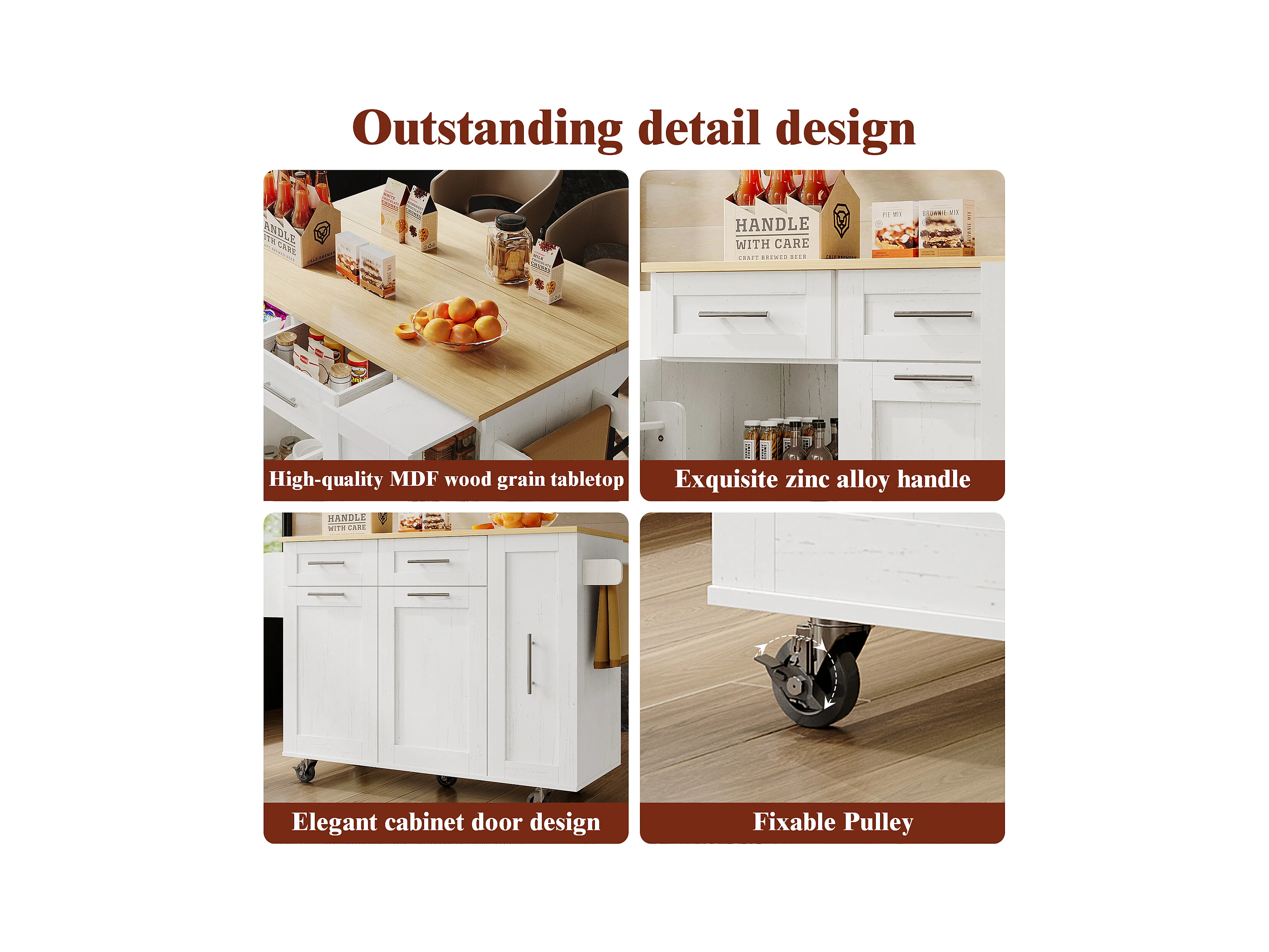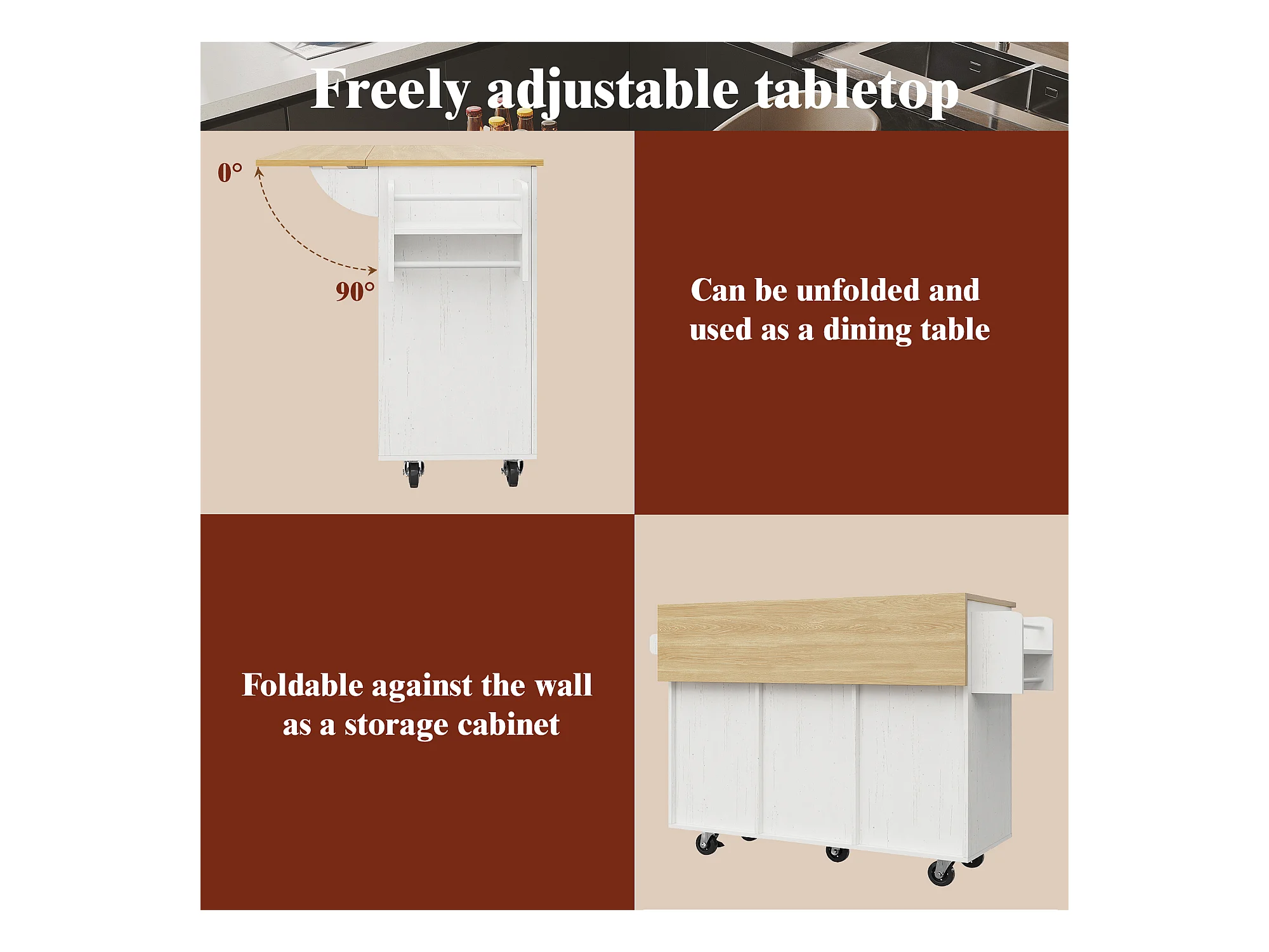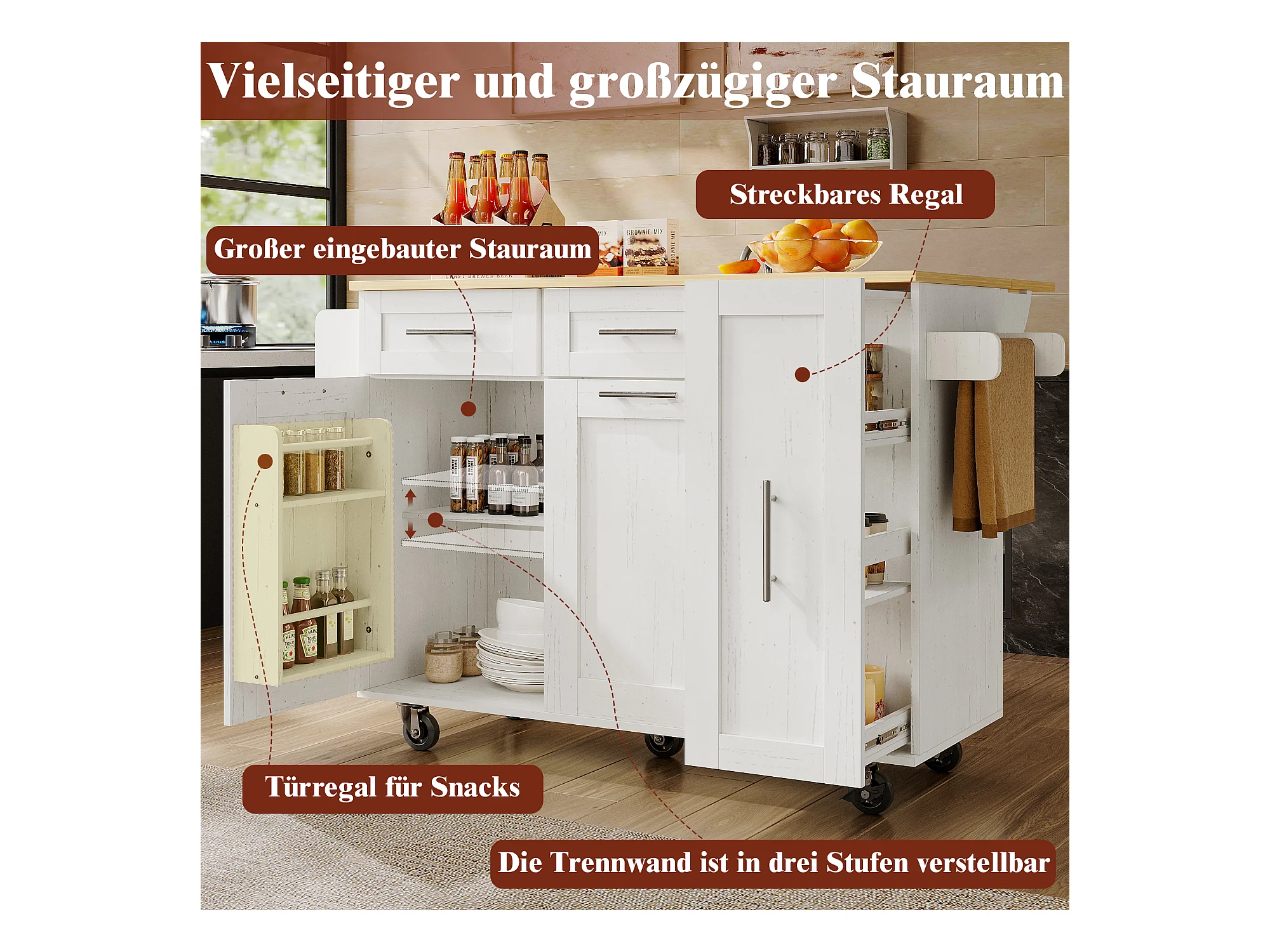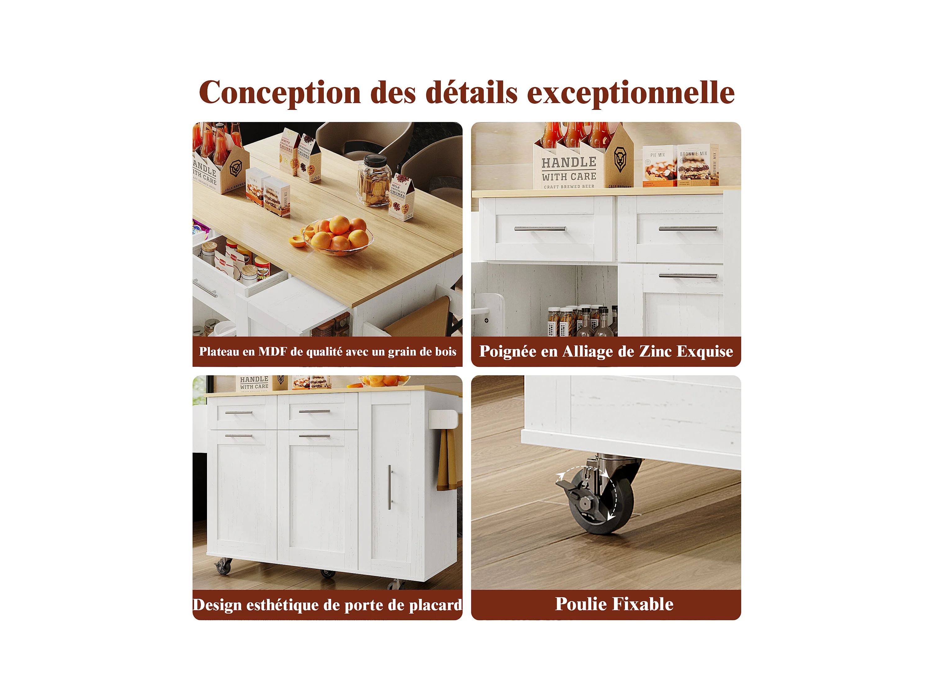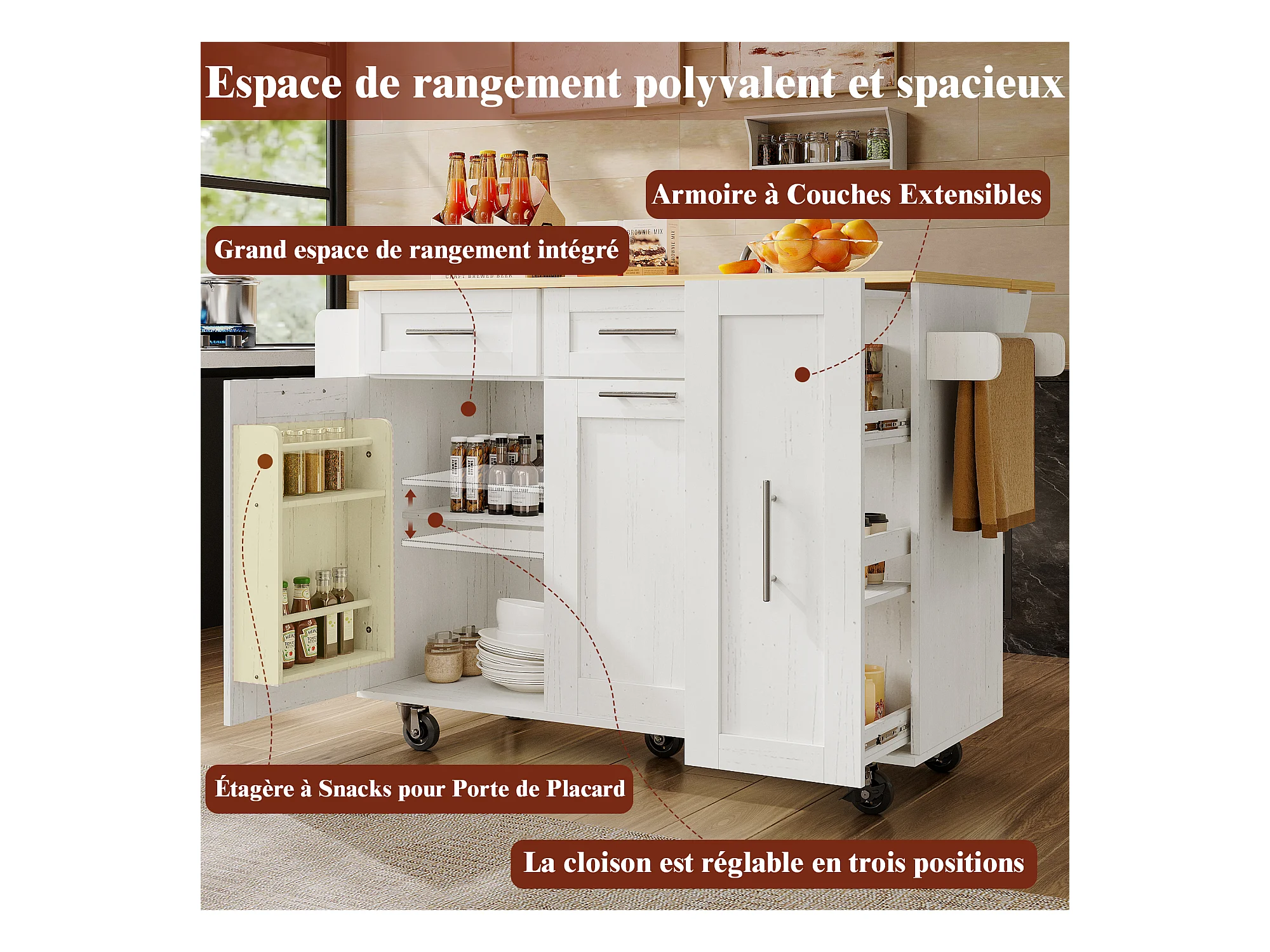 Îlot de Cuisine Moderne, Buffet avec Fonction de Rangement, Table Extensible avec Plan de Travail en MDF et Bois, Blanc, (137.5 x 46 x 90.5 cm)