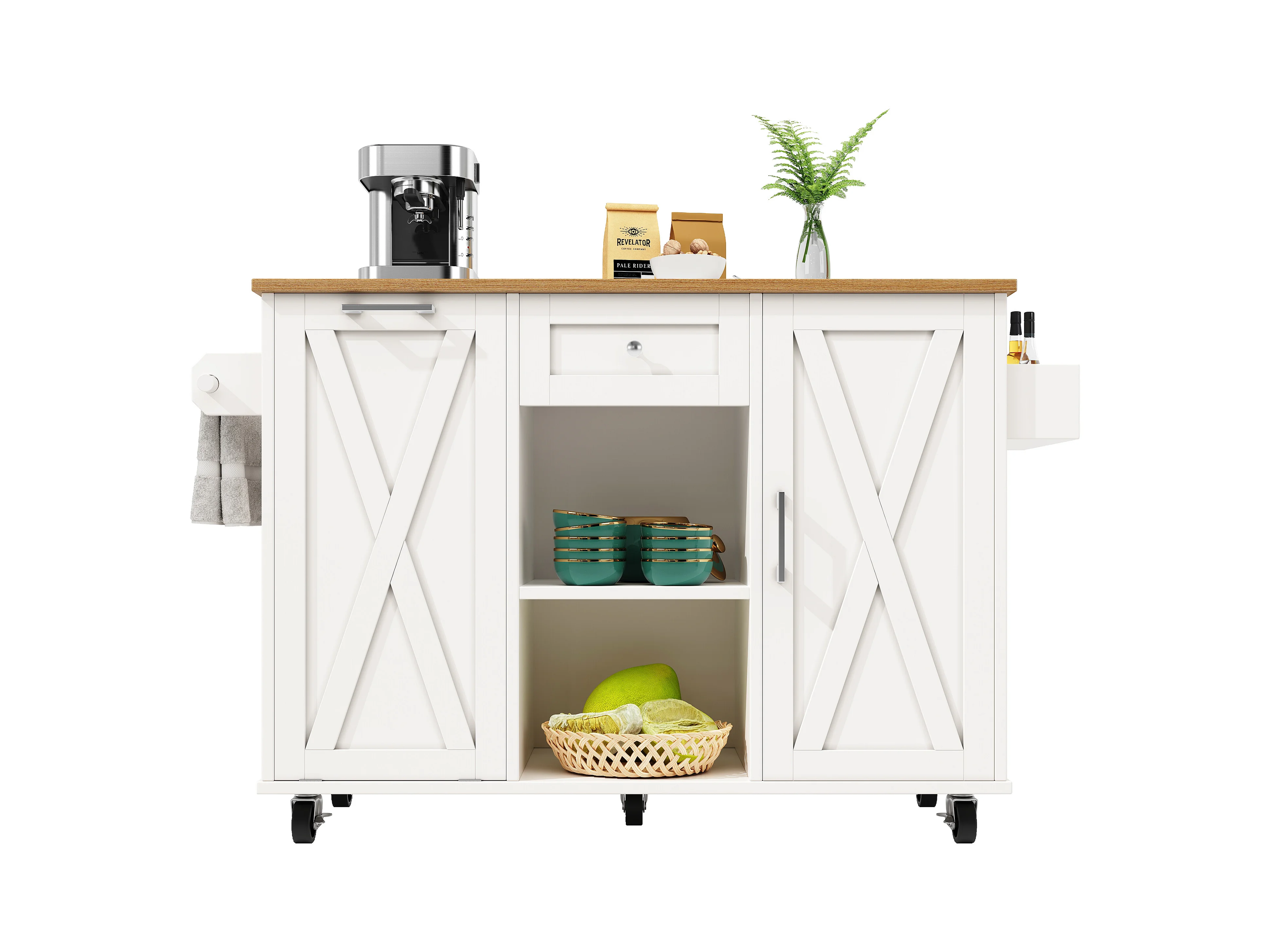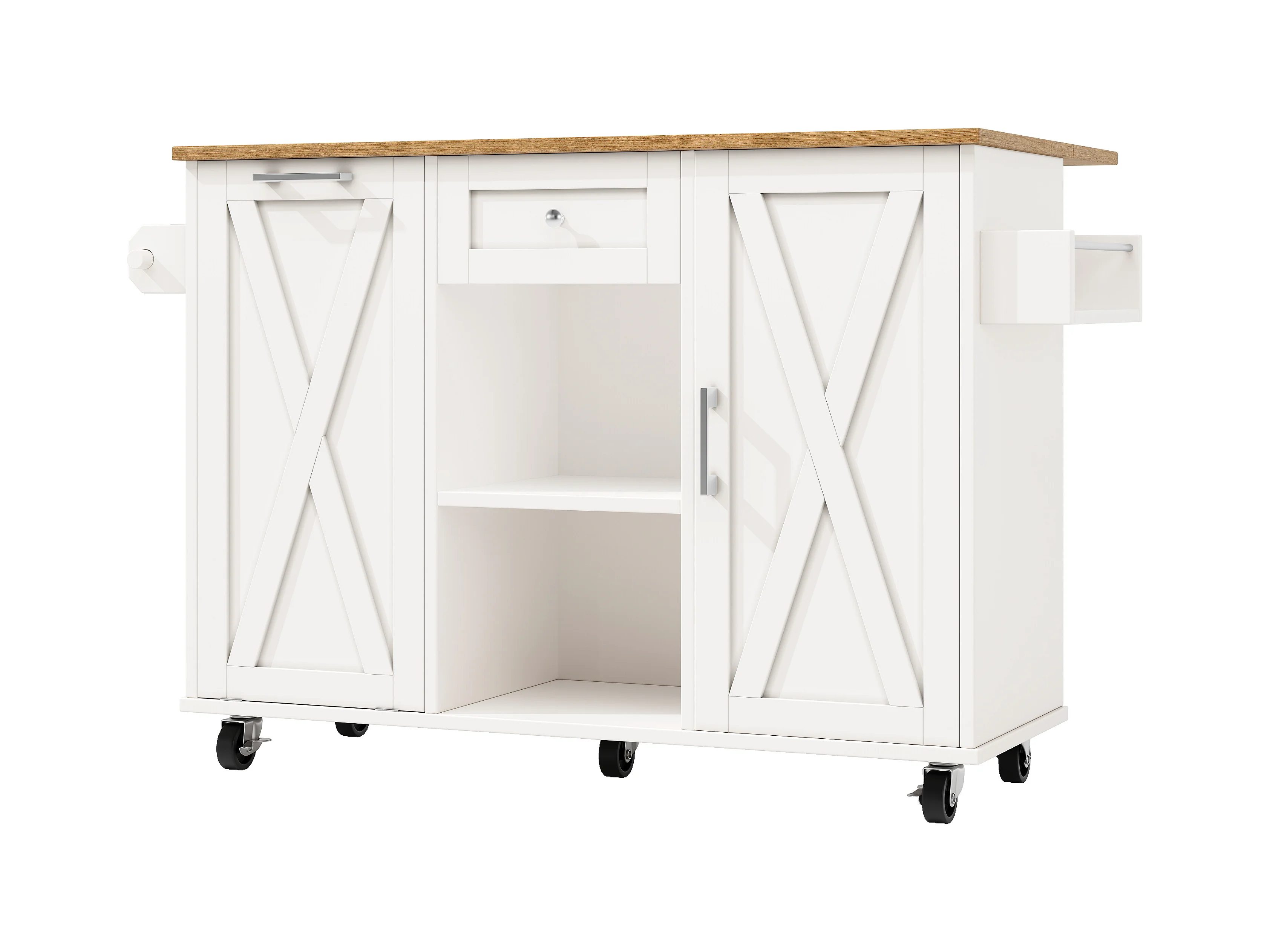 Îlot de cuisine avec plan de travail, compartiments réglables, roulettes amovibles, porte-serviettes latéral, bois naturel, blanc (135x46x86.6 cm)