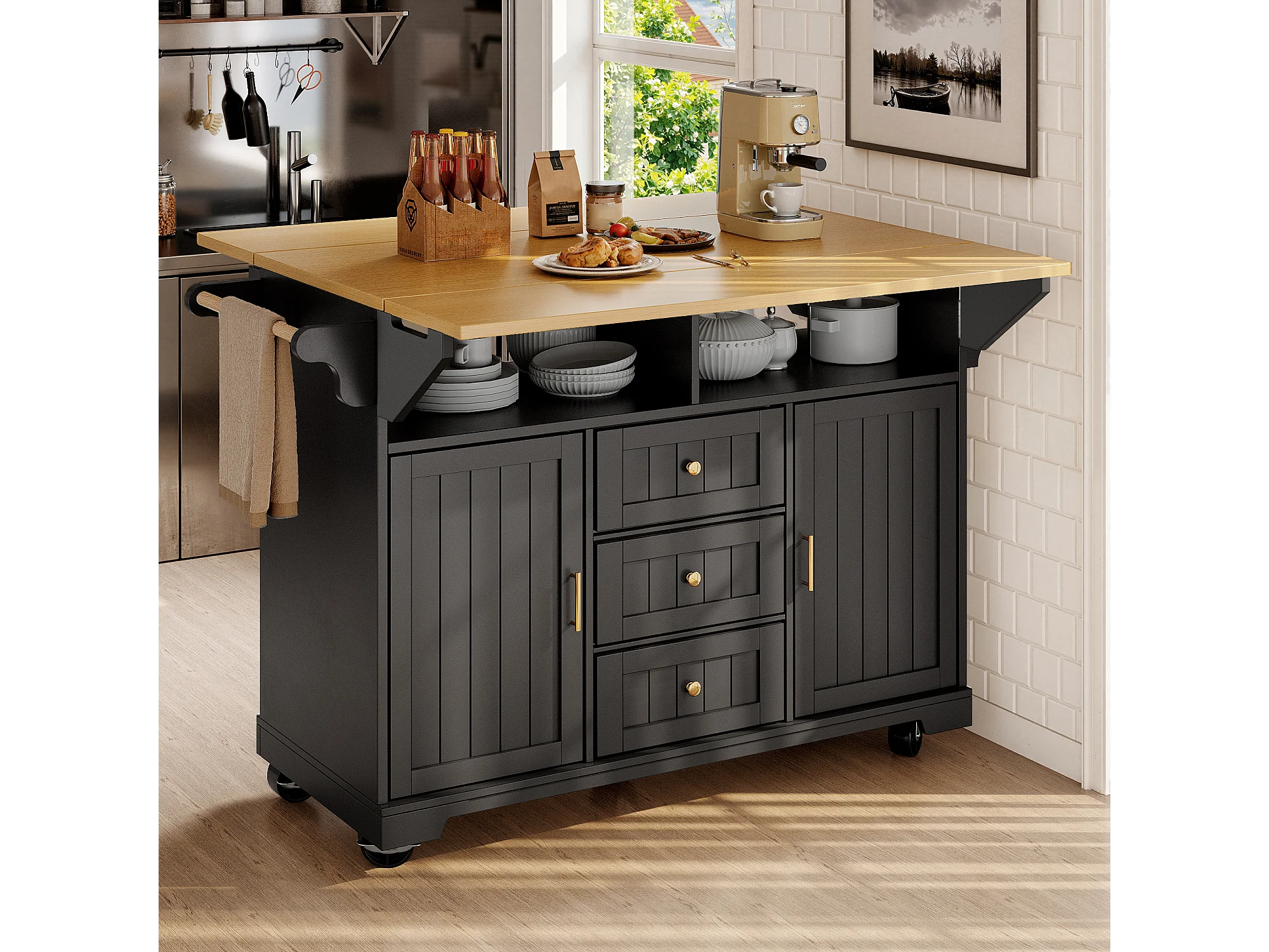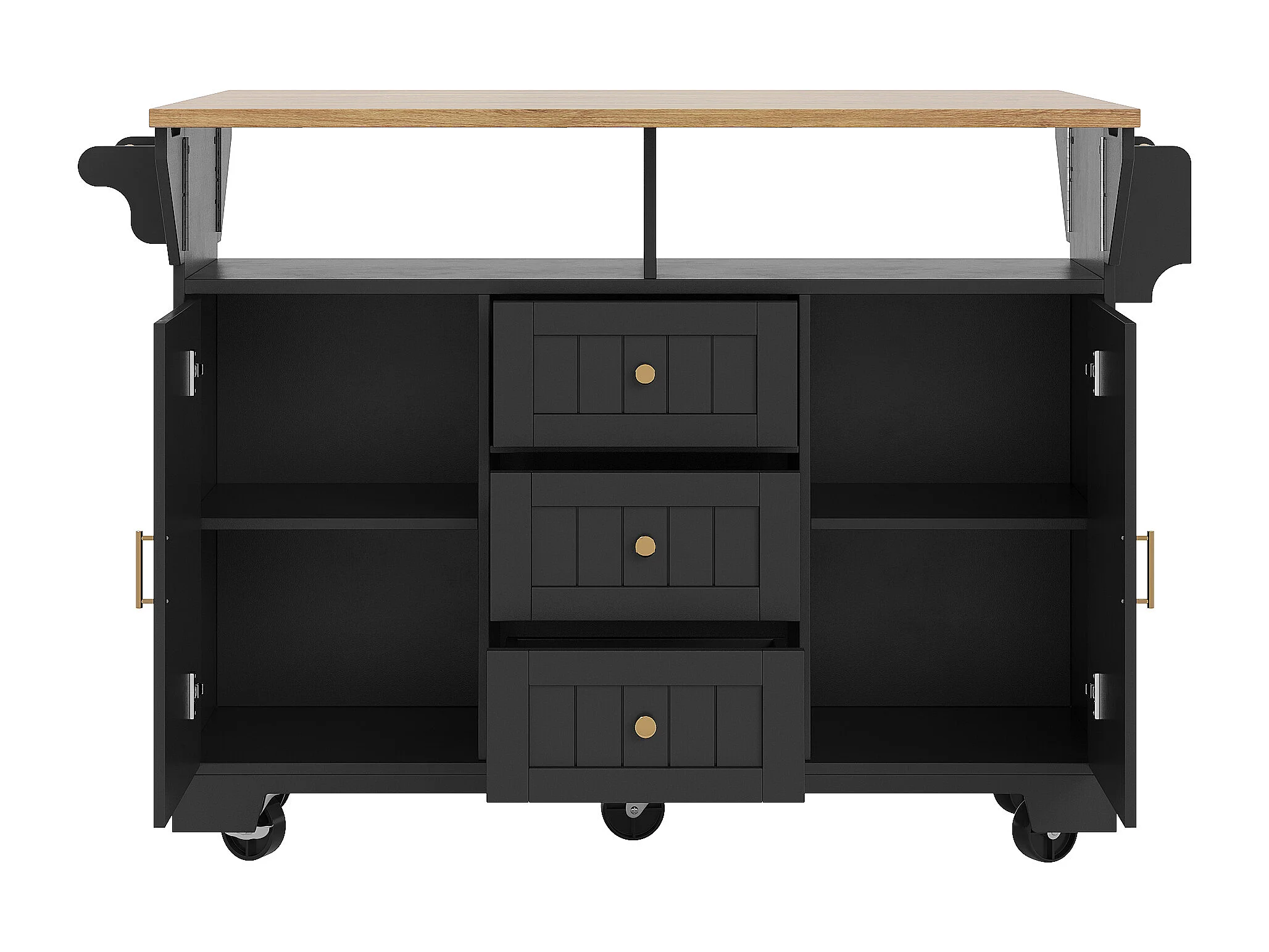 Îlot de cuisine noir avec plateau de table pliable, 3 tiroirs de rangement et 2 portes - 5 roulettes