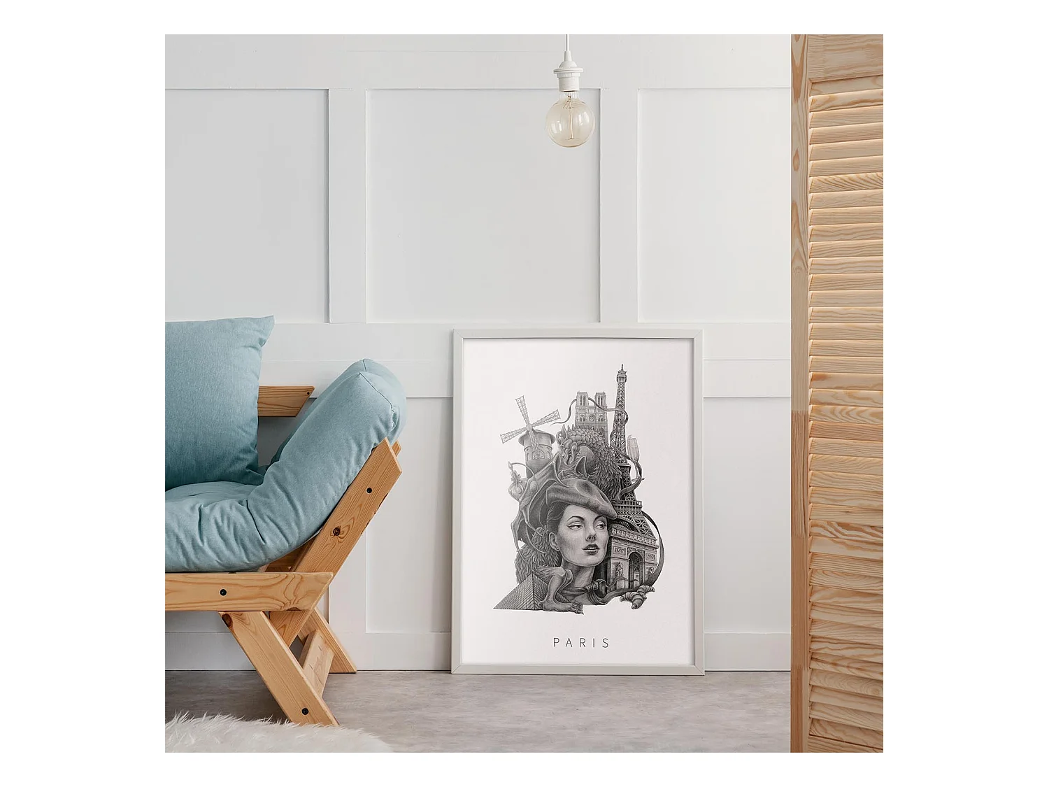 Image dans un cadre, décoration française moderne, cadre blanc art Paris, imprimé Paris minimaliste, design Paris 70x100 cm.