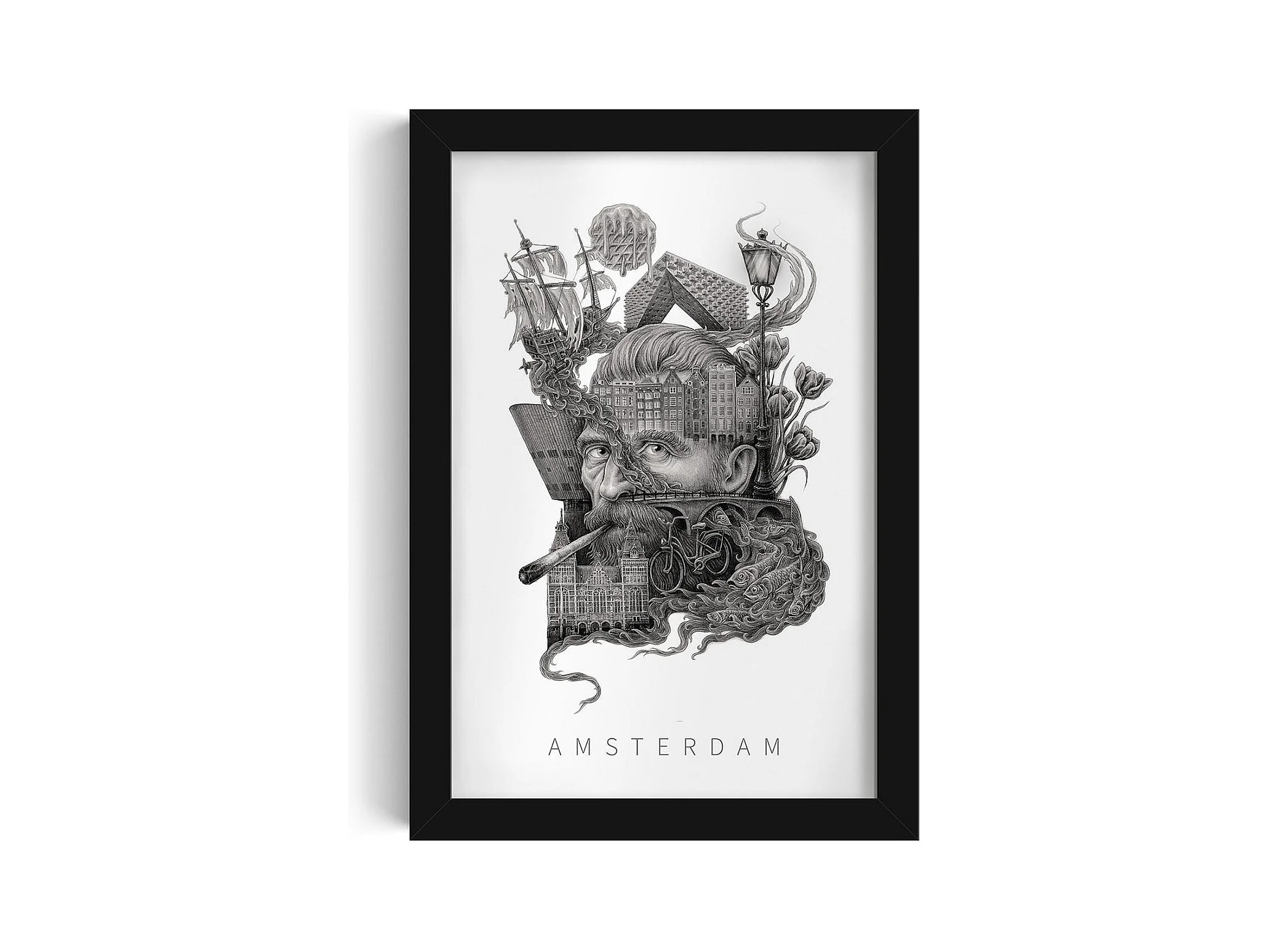Image encadré, décor hollandais élégant, cadre noir art Amsterdam, image urbaine 20x30 cm Amsterdam.