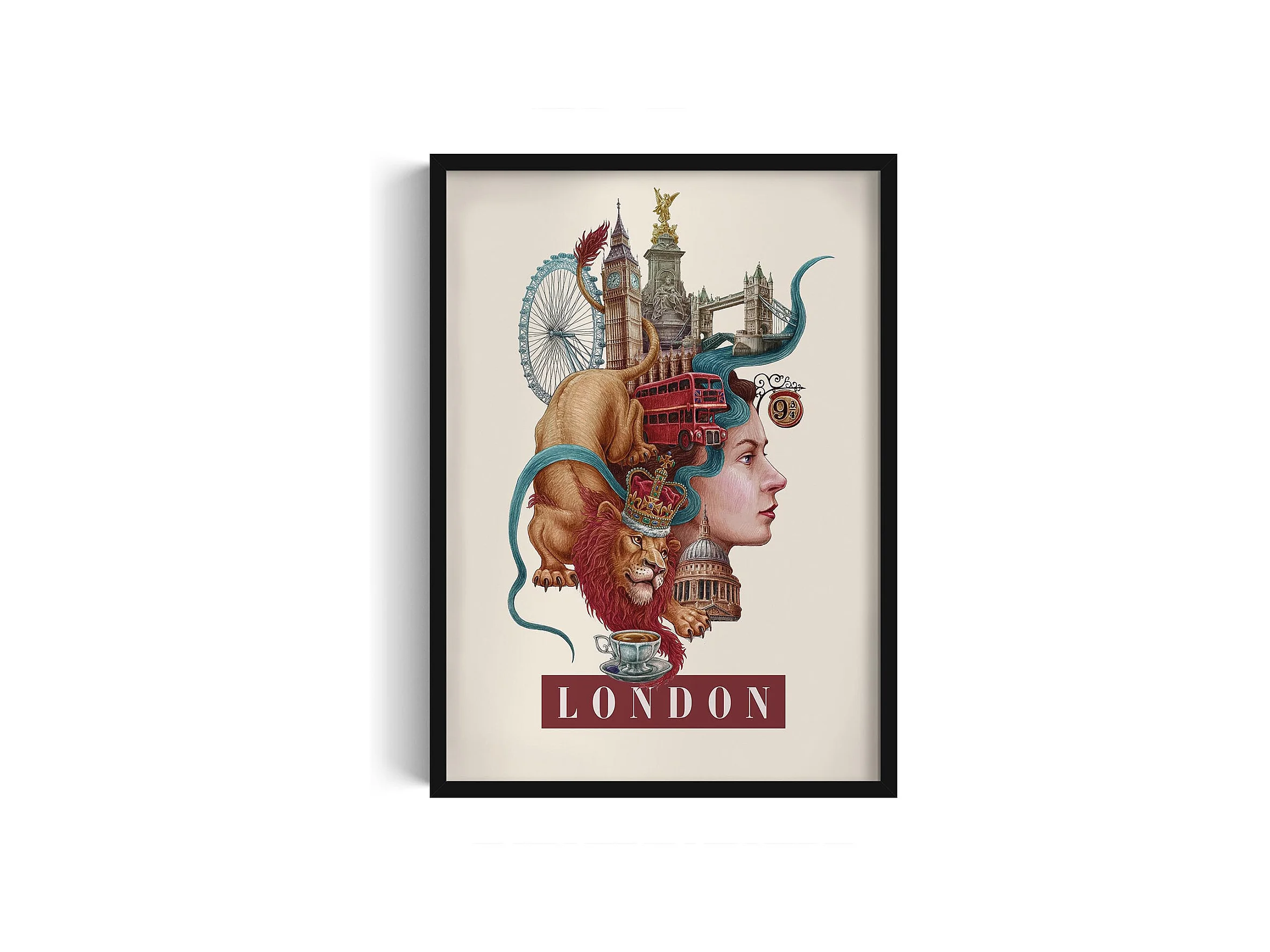 Image encadré, décor urbain Londres, cadre noir Londres art, image paysage urbain minimaliste Londres, 50x70 cm.