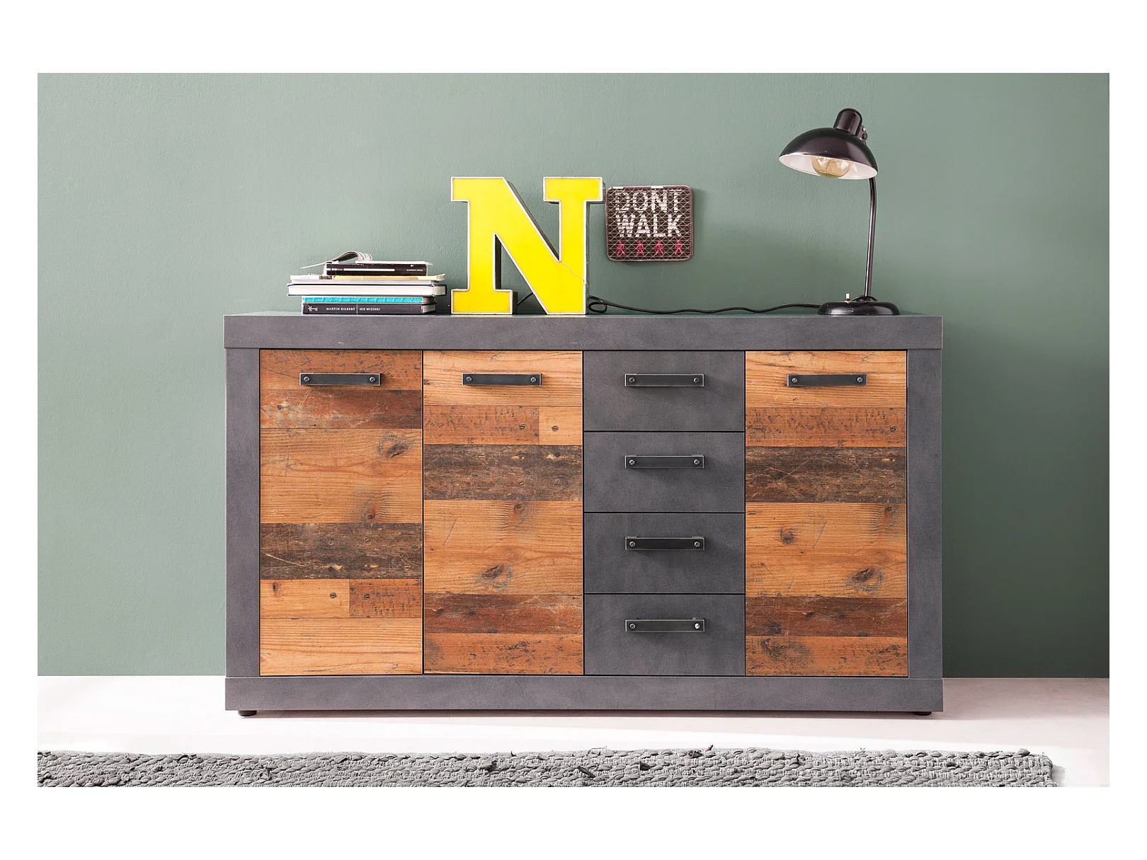 Indy Commode, 3 portes, 4 tiroirs, imitation chêne gris, vieux bois.
