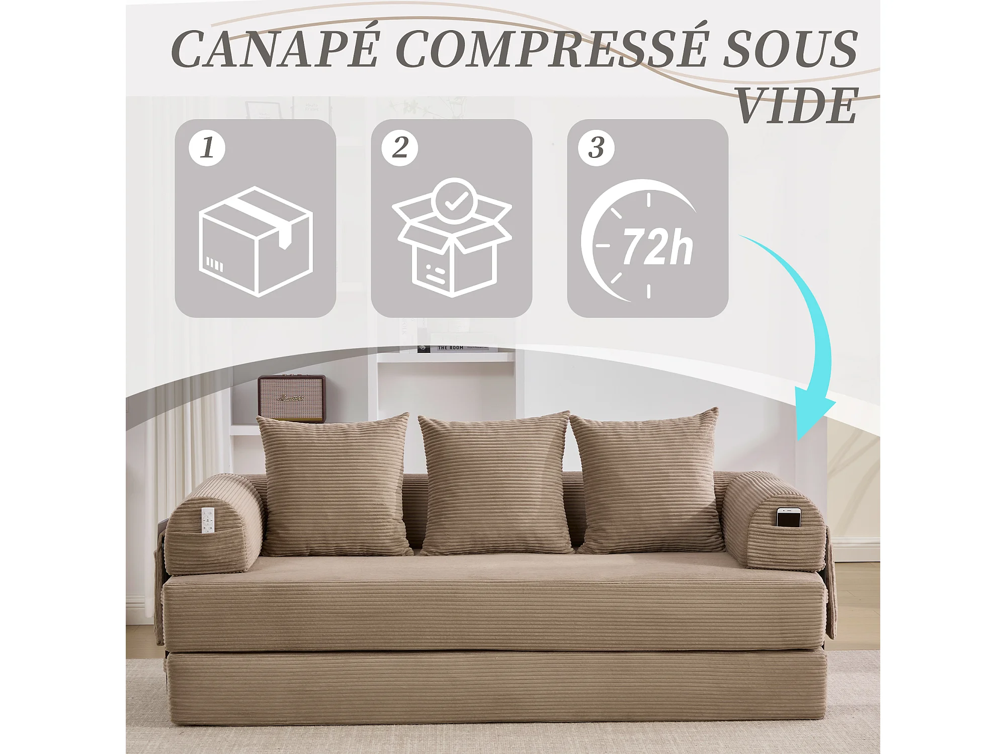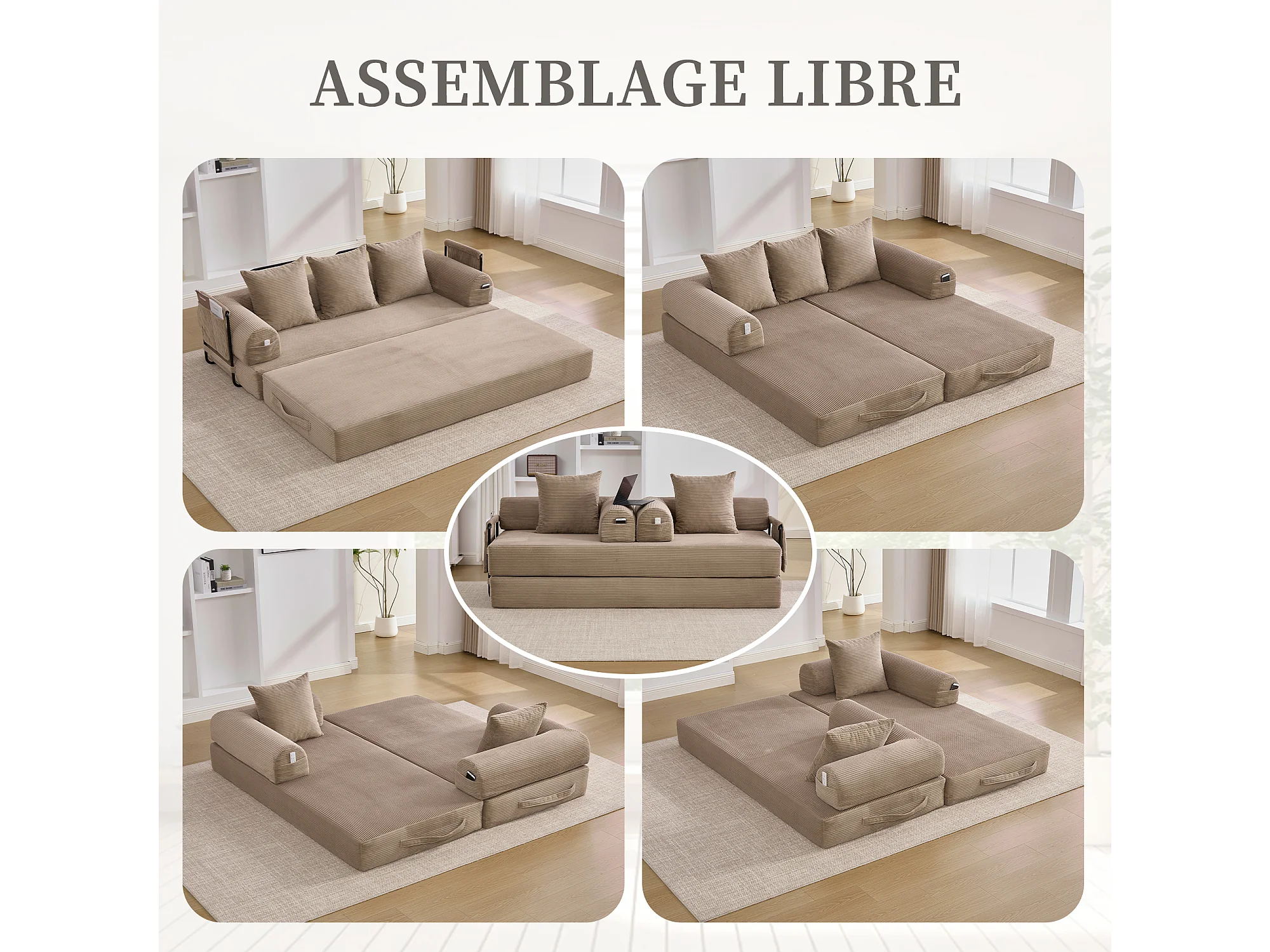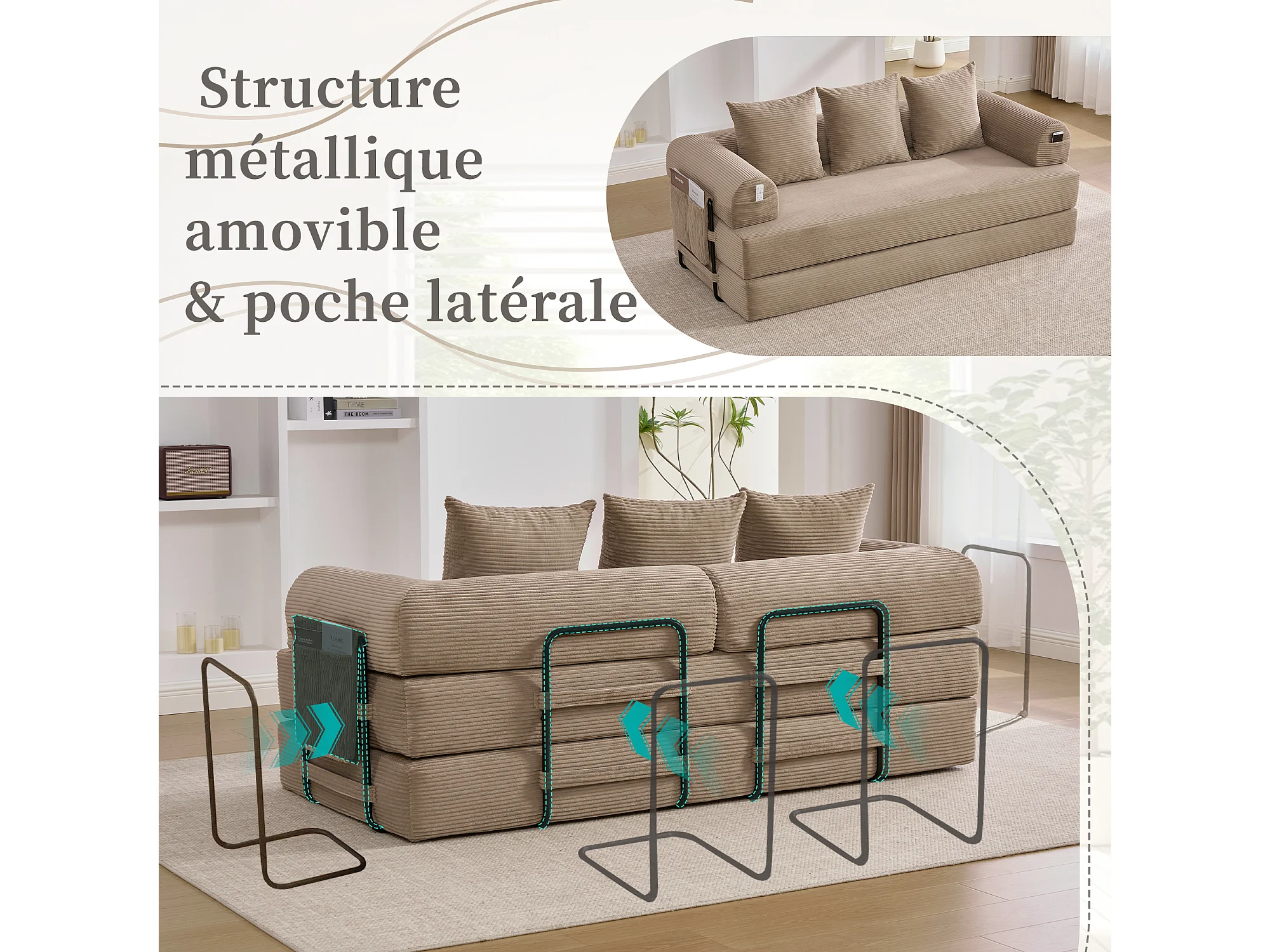 Kaleido 2.0 - Canapé Modulable en Velours Côtelé – Cadre Métallique Externe - Poches de Rangement et 3 Coussins Inclus - Kaki– Idéal pour Salon, Appartement