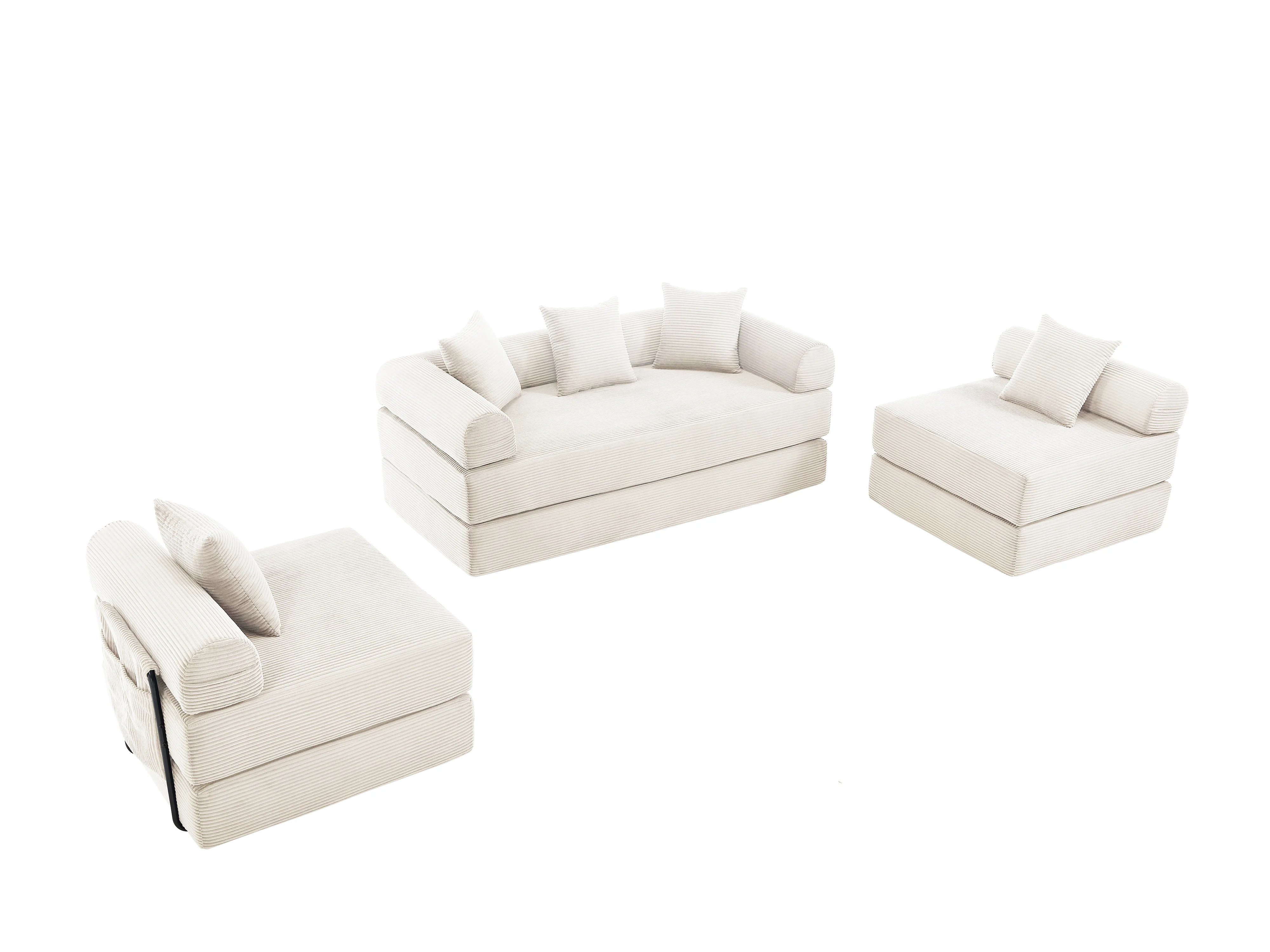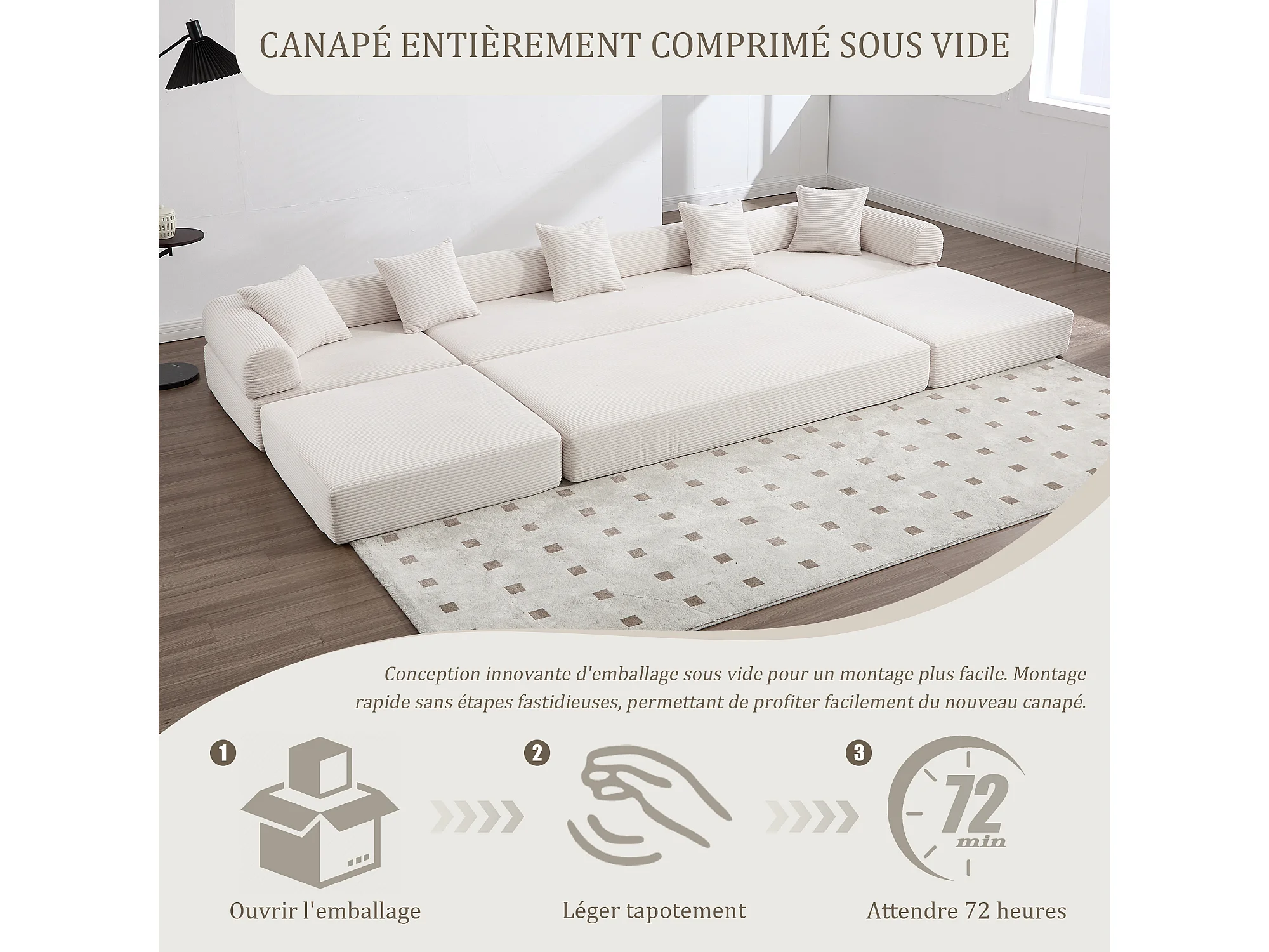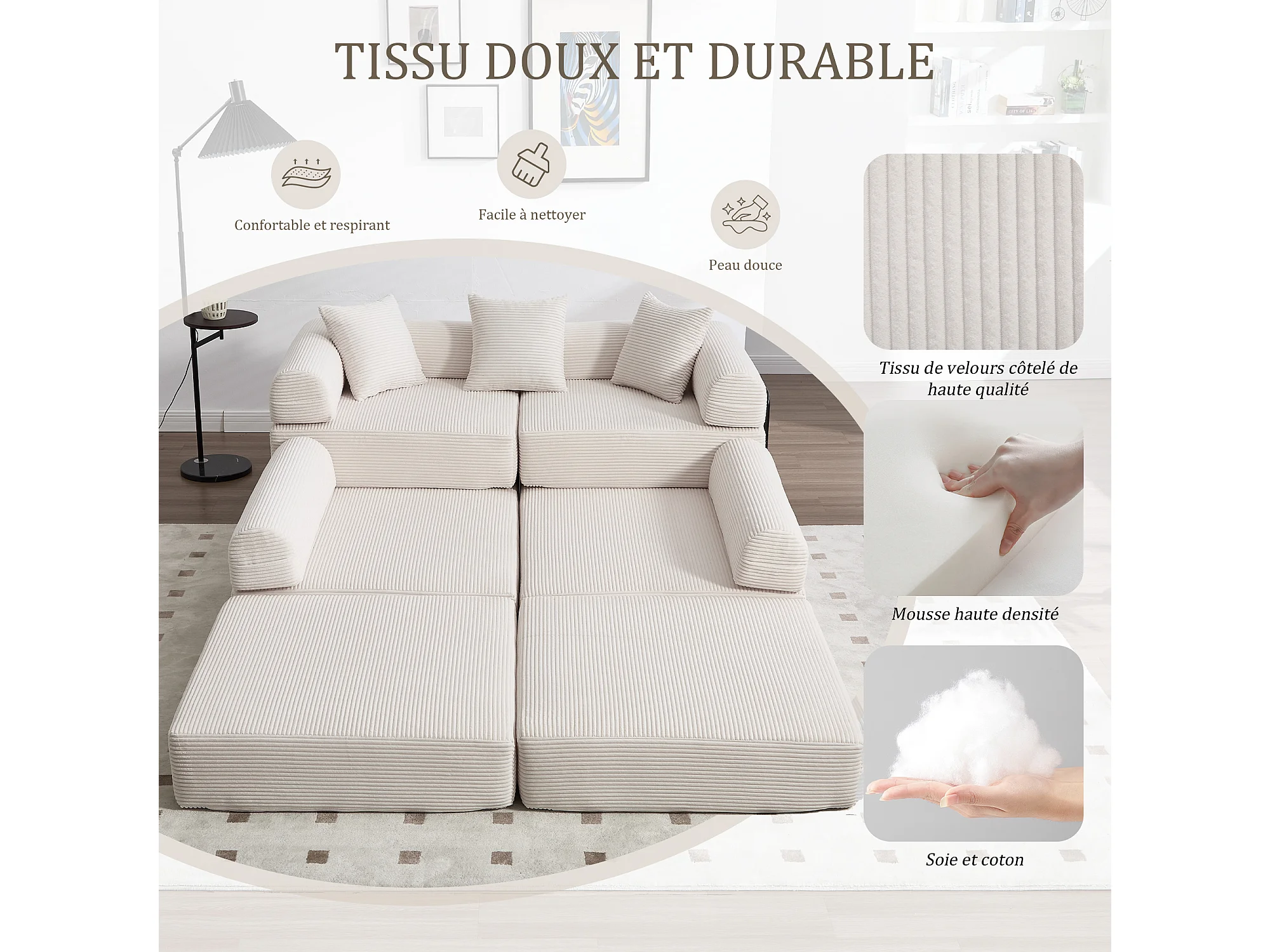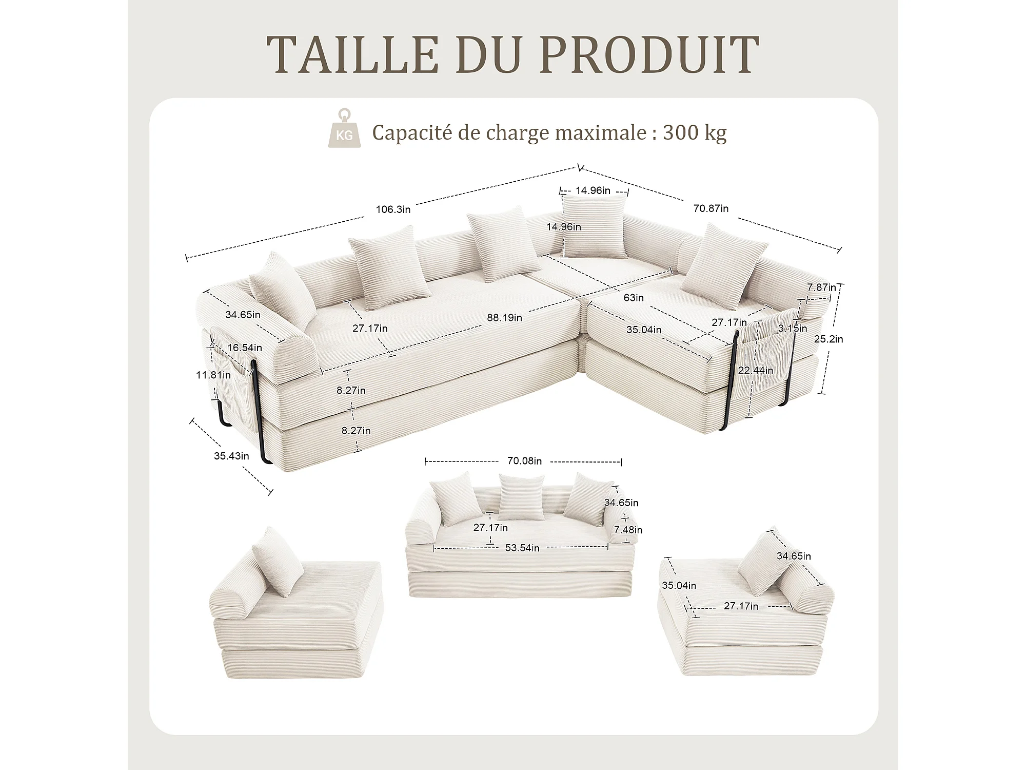 Canapé modulable 3 places - 5 coussins inclus - Porte-gobelets et poches latérales - Convertible en canapé d'angle - Beige - Idéal salon et studio
