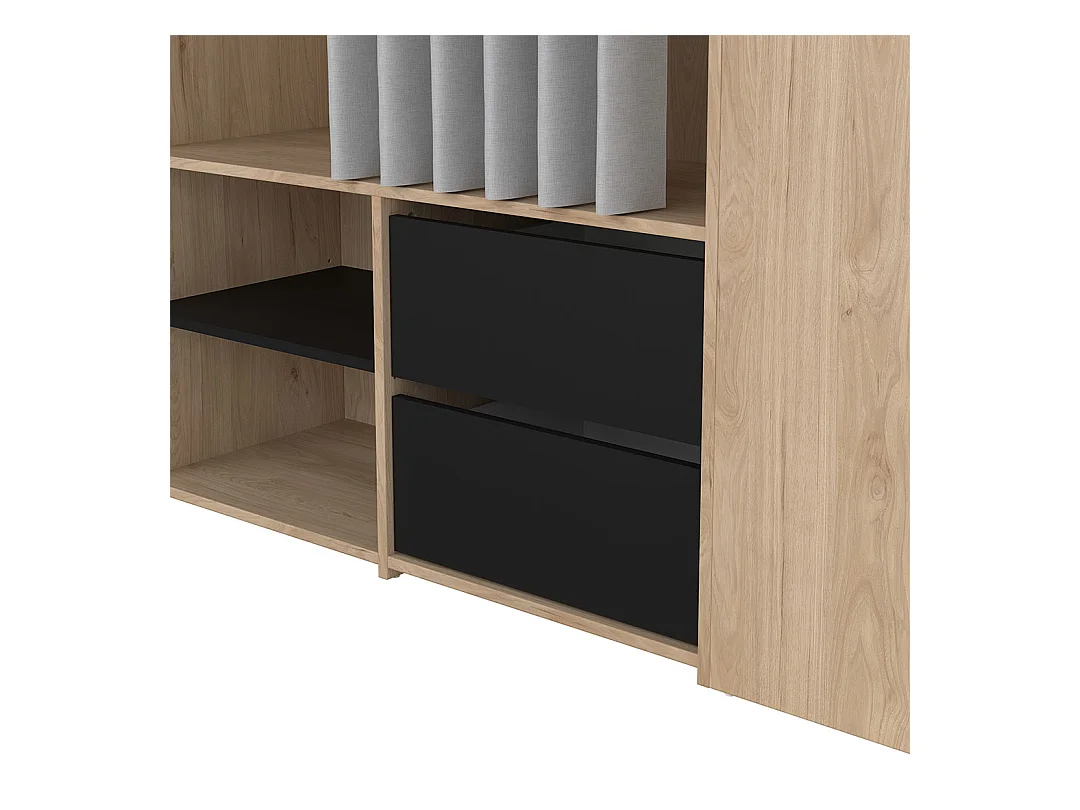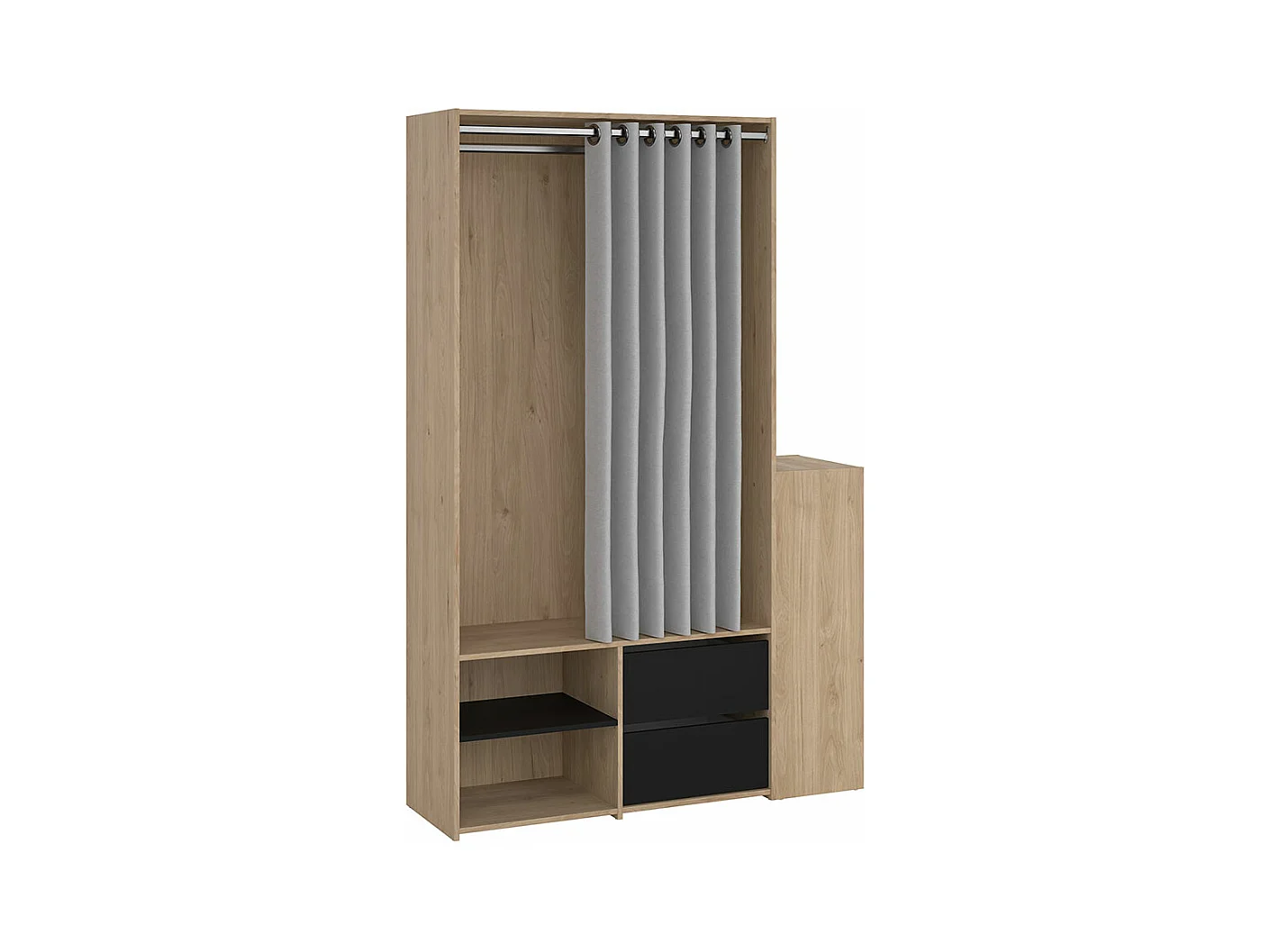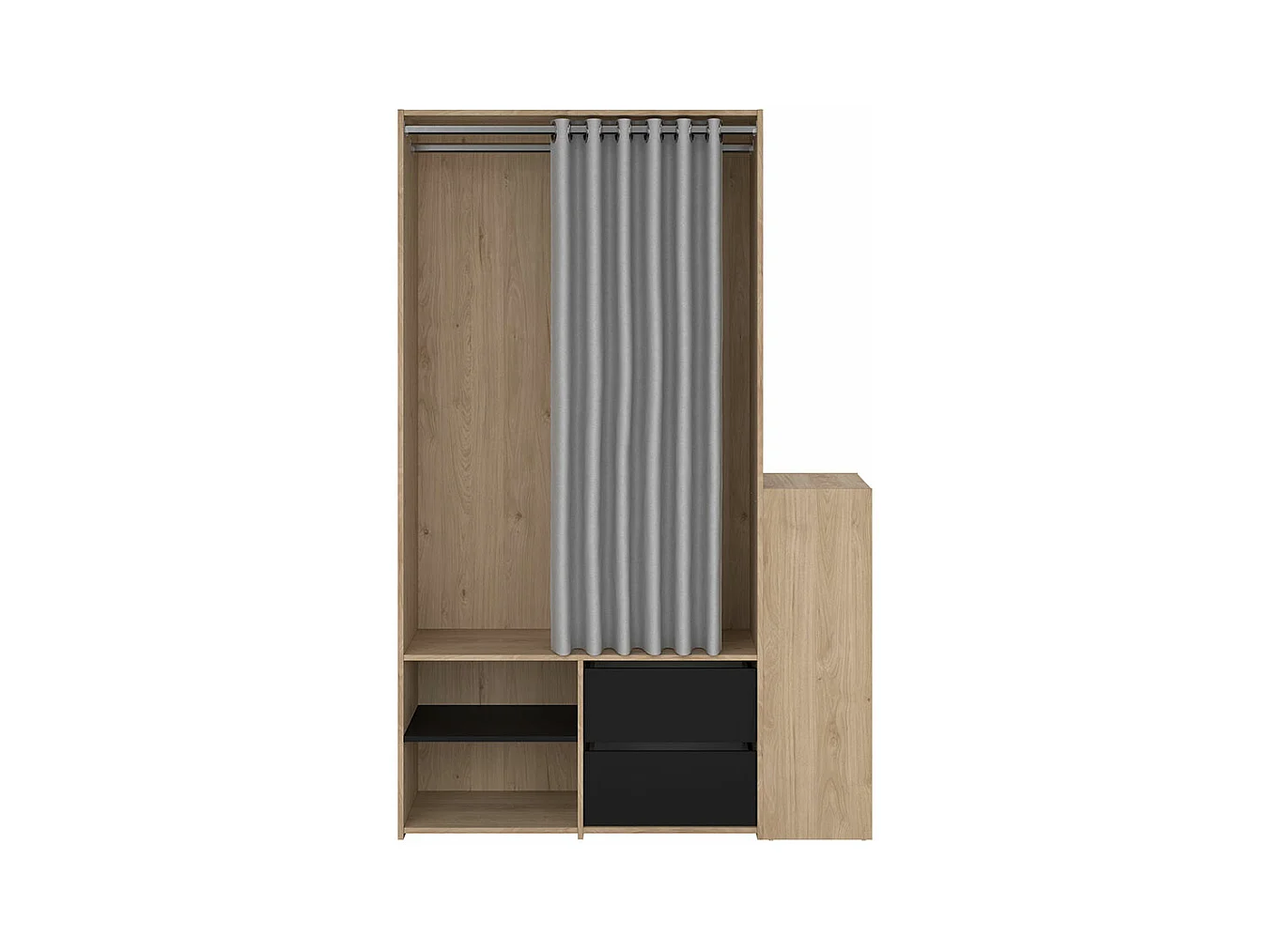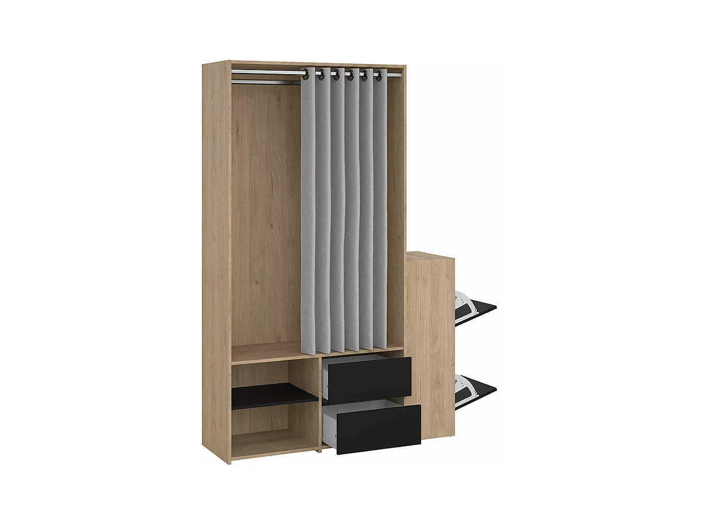Kimmy armoire ouverte, avec rideau, 2 tiroirs, meuble à chaussures décor noyer, noir mat, rideau gris clair.