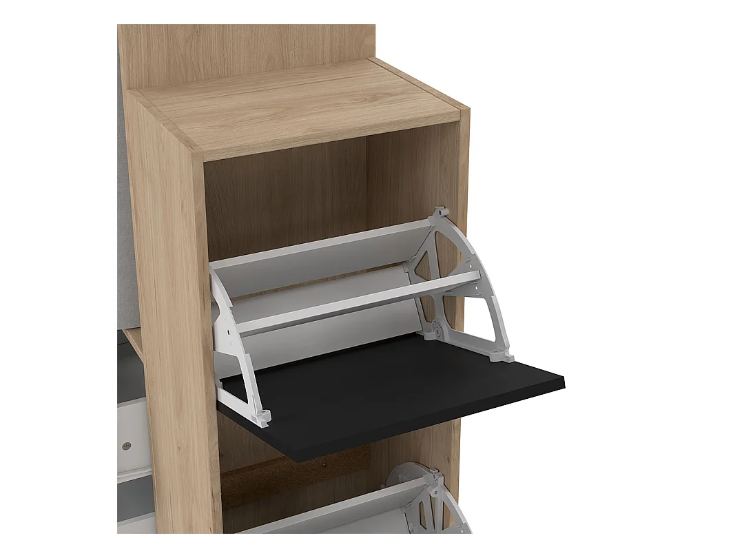 Kimmy armoire ouverte, avec rideau, 2 tiroirs, meuble à chaussures décor noyer, blanc, rideau gris clair.