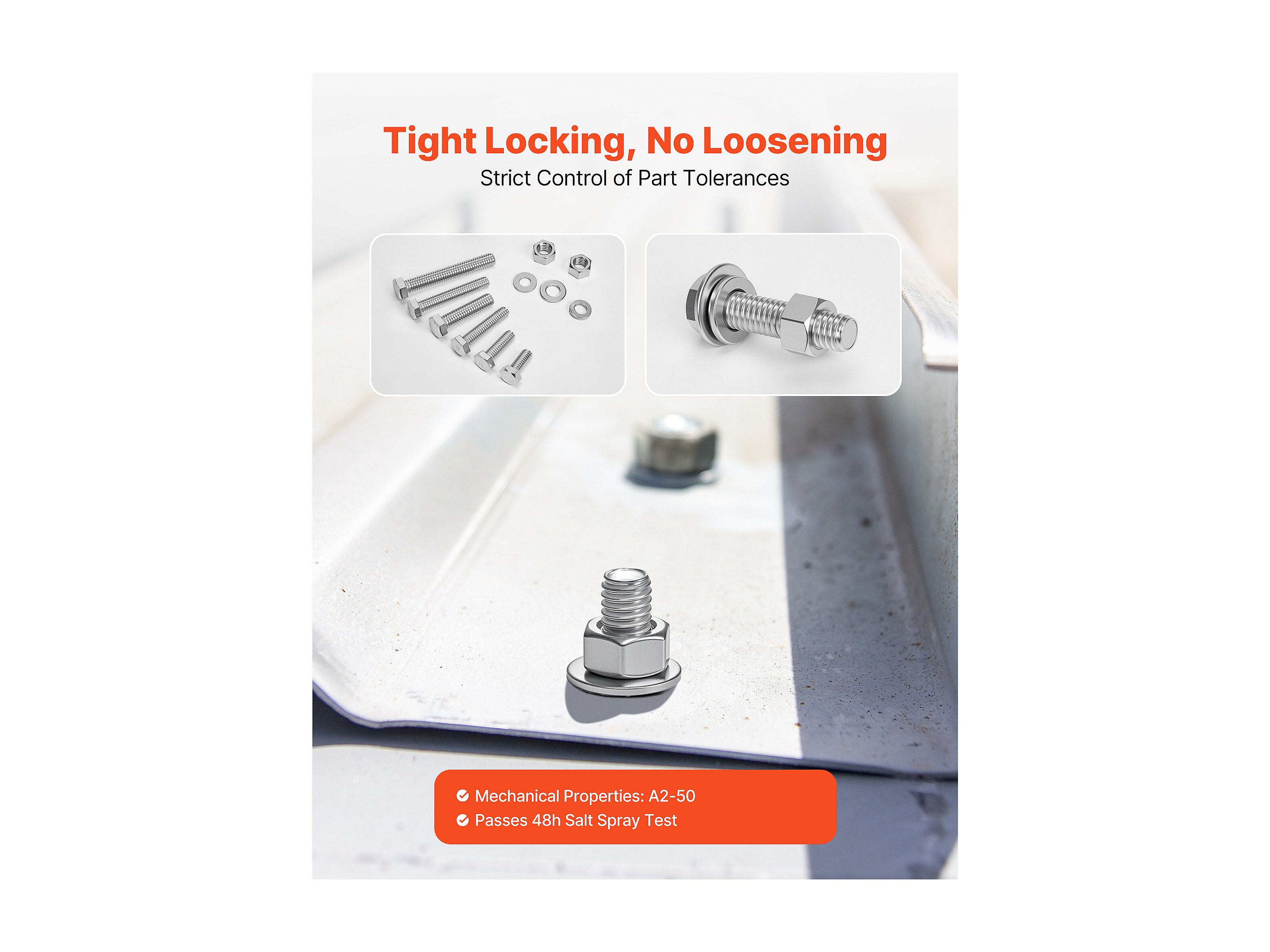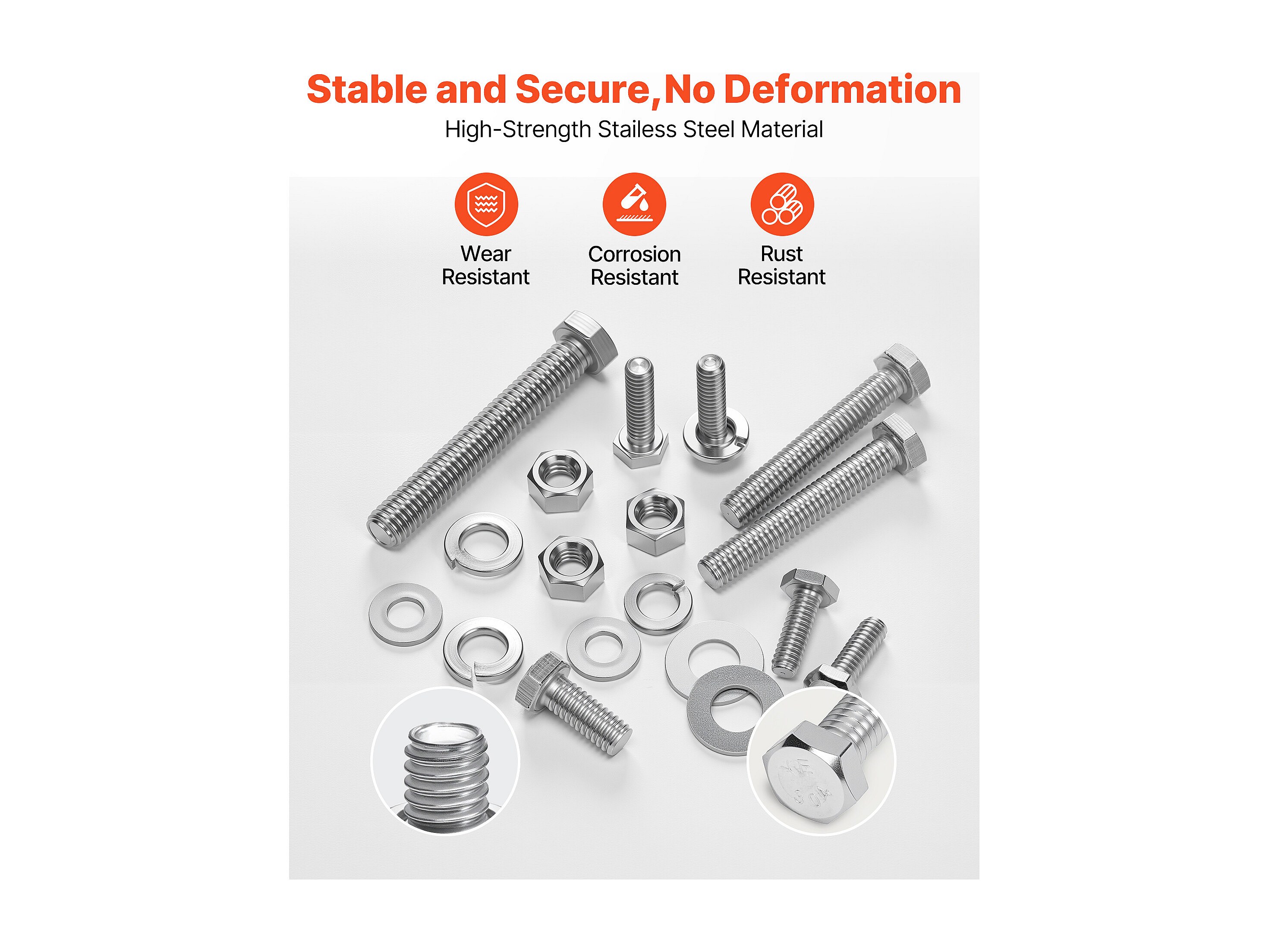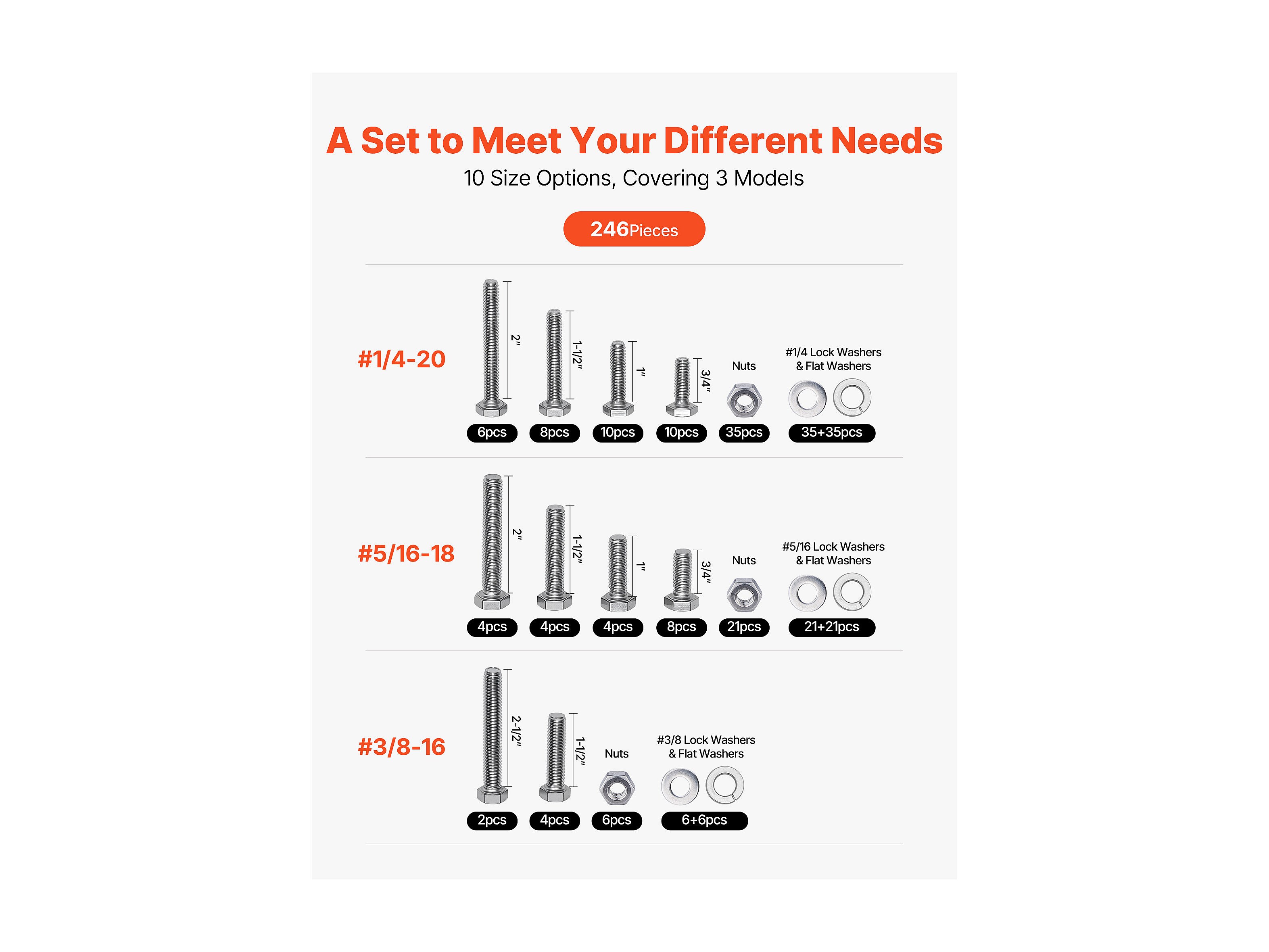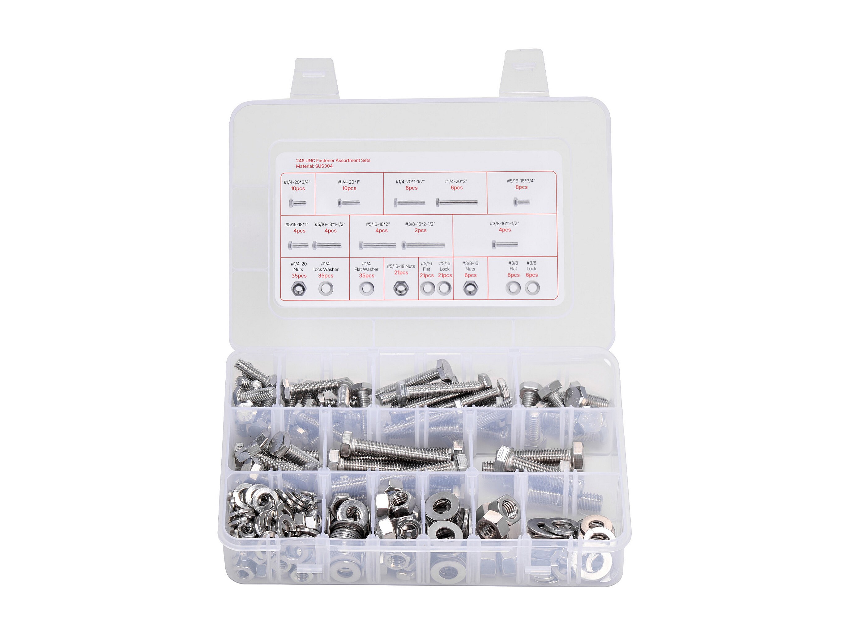 Kit Boulons et Écrous SucceBuy, 246 PCS, Vis de Machine et Rondelles Plates, Impériaux, Acier Inoxydable, Plusieurs Tailles, 1/4-20, 5/16-18, 3/8-16