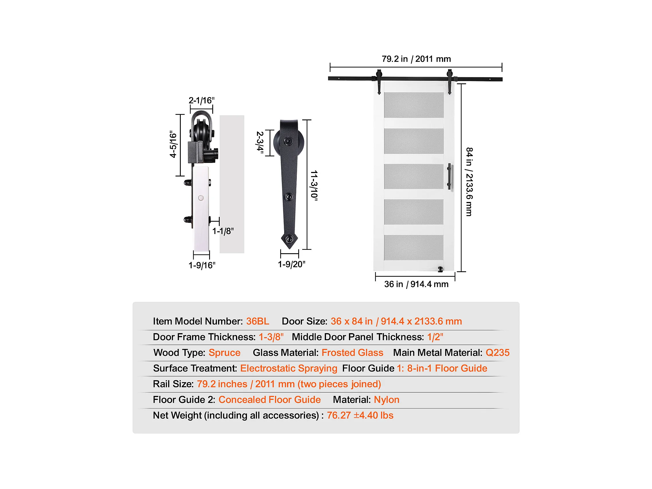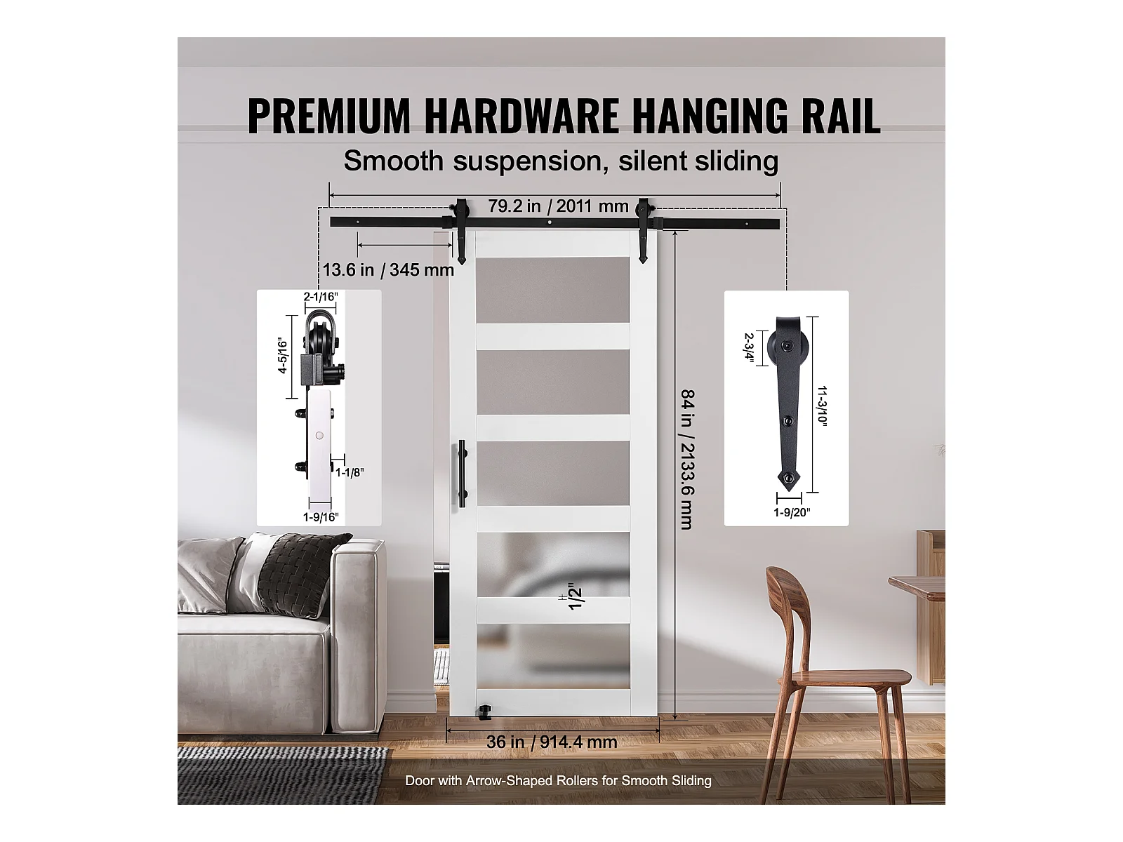 Kit de Porte de Grange Coulissante SucceBuy, 76 x 213 cm, Porte Coulissante en Bois et en Verre, Guide au sol 8 en 1, Fonctionnement Fluide et Silencieux