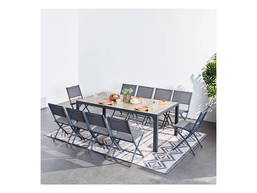 Ensemble table aluminium effet bois et 10 chaises LAGOS